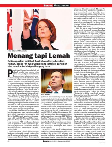 58 BERITAINDONESIA, September 2010BERITA MANCANEGARAMenang tapi LemahKetidakpastian politik di Australia akhirnya berakhir.Namun, posisi PM Julia Gillard yang lemah di parlemenbisa memicu ketidakpastian yang baru.emilihan Umum Australia kali iniadalah pemilu yang terseru sejaktahun 1961, saat pemerintah PartaiBuruh mempertahankan kekuasaan hanya dengan selisih satu kursi. JuliaGillard dan Tony Abbott bersaing ketikaPemilu Australia yang berlangsung pada21 Agustus 2010 gagal menghasilkan partai politik yang menang mutlak. PerdanaMenteri (PM) perempuan pertama Australia yang didukung Partai Buruh (ALP),Julia Gillard, sekaligus sebagai pihak yangberkuasa di Australia saat ini, mendapatkan 70 kursi. Sementara kubu Partai Liberal-Nasional (LNP), yang mengusungTony Abbott, sebagai calon perdanamenteri mendapatkan 72 kursi. Untukmenang, partai politik harus meraih kuotaminimal 76 kursi di parlemen. Oleh sebabitu, parlemen negara ini sempat beradadalam posisi menggantung (hung).Di sisi lain, hasil Pemilu 2010 merupakan kemunduran yang sangat memukulALP sebab tiga tahun lalu mantan PMKevin Rudd berhasil membawa kemenangan telak bagi ALP. Namun Gillard menjatuhkan Rudd 24 Juni lalu. Hal itulahyang membuat ALP kehilangan banyakkursi di parlemen akibat kemarahan publik yang dipicu oleh aksi kudeta internalterhadap Perdana Menteri (PM) terpilih,Kevin Rudd.Meski demikian, Gillard akhirnya dapatberkuasa lagi setelah meraih kuota minimal di parlemen. Ia berhasil menggaet dukungan dari Partai Hijau dan anggotaparlemen dari kubu independen. Mantanpengacara industri itu kemudian dilantikuntuk kedua kali sebagai Perdana Menteri(PM) Australia, 14 September lalu.Kemenangan tipis Gillard itu memungkinkan Partai Buruh mengimplementasikan usulan 30% pajak pertambangan danmenjalankan proyek telekomunikasisenilai USD38 miliar. Kemenangan Gillard pun membuat harga saham-sahammilik perusahaan tambang BHP Billitondan Rio Tinto merosot. Rencana Gillarduntuk menetapkan harga emisi karbonjuga akan kembali menjadi agenda utamanya. Rencana inilah yang membuat Gillard mendapat dukungan dari PartaiHijau (Greens).Sayap kiri Partai Buruh kini mendapat76 kursi di parlemen yang memiliki total150 kursi. Itu artinya, jika ada satu sajaanggota koalisinya yang membelot ataumeninggal dunia, pemerintahan yangdipimpin Gillard bisa jatuh. Mantan PMKevin Rudd yang didepak diangkat menjadi menteri luar negeri Australia. Keberadaan pria yang mirip ‘Harry Potter’ itumenunjukkan potensi perpecahan dalamkabinet baru Gillard karena di dalamnyaada juga orang-orang yang dianggapsebagai perancang kudeta terhadap Rudd.Namun, Gillard berharap pelantikannyaitu sebagai awal baru.Kini dia harus menghadapi berbagaitugas berat, termasuk memperkenalkankebijakan pajak yang baru tentang pembagian profit sumber daya alam, langkahpengurangan polusi, serta menjaga keutuhan koalisi pemerintahannya yang terdiriatas anggota parlemen Partai Hijau yangsangat peduli lingkungan dan anggotaparlemen independen yang condongkonservatif. “Saya pikir pemerintahan initidak stabil sejak awal. Pemerintahan akansulit menangani isu demi isu untukdisahkan sebagai kebijakan,” ujar pengamat politik Peter van Onselen.Kehadiran Gillard yang tidak menikah,atheis, dan tak memiliki anak itu di pentaspolitik Australia merupakan sebuahfenomena. Gillard lahir pada 29 September 1961 di Barry, kota pelabuhan dipertambangan batubara Welsh. Dia memiliki saudari kandung bernama Alison.Gillard baru berusia empat tahun saatberlayar ke Australia dengan membawasebuah boneka koala pada 1966.Kala itu orang tua Gillard mengambilkesempatan dalam skema murah migrasi10 poundsterling ke Australia agar Gillardmendapatkan udara yang lebih hangatdemi merawat penyakit paru-paru yangkronis. Itulah mengapa Gillard disebutjuga berasal dari seorang ‘Ten PoundPom.’ “Dokter mengatakan, Julia Gillardtidak akan mampu tumbuh besar di cuacayang sangat dingin. Dokter itu bilang,‘Bawa dia ke iklim yang lebih hangat’.Karena itu, kami ke Australia,” ungkapibunya, Moira Gillard.Dari latar belakang keluarga sederhana,dia menjadi wanita pertama yang menjadiPM Australia. Bahkan, dia berkuasa melaluicara yang kontroversial, kudeta internalburuh terhadap PM Kevin Rudd pada 24Juni. Dia lantas mengumumkan pemilutiga pekan setelah Rudd terguling. Tapi,pemilu 21 Agustus menghasilkan hung parliament atau tanpa pemenang kursi mayoritas, pertama dalam 70 tahun terakhir.Saat ini Australia memiliki empat partaipolitik utama. Partai Buruh Australia(ALP) adalah Partai Sosial Demokrat yangdidirikan oleh gerakan buruh Australia.ALP telah berkuasa sejak akhir 2007.Partai Liberal adalah partai sayap kanantengah. Partai Nasional Australia, sebelumnya Partai Negeri, adalah partai konservatif yang mewakili kepentingan pedesaan. Partai Hijau Australia adalahpartai sayap kiri dan lingkungan. PANPTony AbbottJulia Gillard, PM Australia.foto-foto: repro