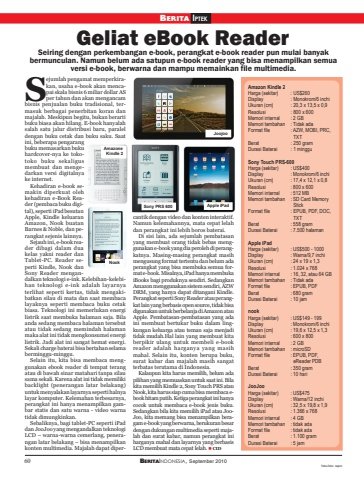 60 BERITAINDONESIA, September 2010Geliat eBook ReaderAmazon Kindle 2Harga (sekitar) : US$260Display : Monokrom/6 inchiUkuran (cm) : 20,3 x 13,5 x 0,9Resolusi : 800 x 600Memori internal : 2 GBMemori tambahan : Tidak adaFormat file : AZW, MOBI, PRC,TXTBerat : 250 gramDurasi Baterai : 1 mingguSony Touch PRS-600Harga (sekitar) : US$400Display : Monokrom/6 inchiUkuran (cm) : 17,4 x 12,1 x 0,8Resolusi : 800 x 600Memori internal : 512 MBMemori tambahan : SD Card MemoryStickFormat file : EPUB, PDF, DOC,TXTBerat : 558 gramDurasi Baterai : 7.500 halamanApple iPadHarga (sekitar) : US$500 - 1000Display : Warna/9,7 inchiUkuran (cm) : 24 x 19 x 1,3Resolusi : 1.024 x 768Memori internal : 16, 32, atau 64 GBMemori tambahan : Tidak adaFormat file : EPUB, PDFBerat : 680 gramDurasi Baterai : 10 jamnookHarga (sekitar) : US$149 - 199Display : Monokrom/6 inchiUkuran (cm) : 19,6 x 12,5 x 1,3Resolusi : 600 x 800Memori internal : 2 GBMemori tambahan : microSDFormat file : EPUB, PDF,eReader PDBBerat : 350 gramDurasi Baterai : 10 hariJooJooHarga (sekitar) : US$475Display : Warna/12 inchiUkuran (cm) : 32,5 x 19,8 x 1,9Resolusi : 1.366 x 768Memori internal : 4 GBMemori tambahan : tidak adaFormat file : tidak adaBerat : 1.100 gramDurasi Baterai : 5 jamSeiring dengan perkembangan e-book, perangkat e-book reader pun mulai banyakbermunculan. Namun belum ada satupun e-book reader yang bisa menampilkan semuaversi e-book, berwarna dan mampu memainkan file multimedia.ejumlah pengamat memperkirakan, usaha e-book akan mencapai skala bisnis 6 miliar dollar ASper tahun dan akan mengancambisnis penjualan buku tradisional, termasuk berbagai penerbitan koran danmajalah. Meskipun begitu, bukan berartibuku biasa akan hilang. E-book hanyalahsalah satu jalur distribusi baru, paraleldengan buku cetak dan buku saku. Saatini, beberapa pengarangbuku memasarkan bukuhardcover-nya ke tokotoko buku sekaligusmembuat dan mengedarkan versi digitalnyake internet.Kehadiran e-book semakin diperkuat olehkehadiran e-Book Reader (pembaca buku digital), seperti iPad besutanApple, Kindle keluaranAmazon, Nook buatanBarnes & Noble, dan perangkat sejenis lainnya.Sejauh ini, e-book reader dibagi dalam duakelas yakni reader danTablet-PC. Reader seperti Kindle, Nook danSony Reader mengandalkan teknologi e-ink. Kelebihan-kelebihan teknologi e-ink adalah layarnyaterlihat seperti kertas, tidak mengakibatkan silau di mata dan saat membacalayaknya seperti membaca buku cetakbiasa. Teknologi ini memerlukan energilistrik saat membuka halaman saja. Bilaanda sedang membaca halaman tersebutatau tidak sedang memindah halamanmaka alat ini tidak mengkonsumsi energilistrik. Jadi alat ini sangat hemat energi.Sekali charge baterai bisa bertahan selamaberminggu-minggu.Selain itu, kita bisa membaca menggunakan ebook reader di tempat terangatau di bawah sinar matahari tanpa silausama sekali. Karena alat ini tidak memilikibacklight (penerangan latar belakang)untuk menyalakan layarnya seperti halnyalayar komputer. Kelemahan terbesarnya,perangkat ini hanya menampilkan gambar statis dan satu warna - video warnatidak dimungkinkan.Sebaliknya, bagi tablet-PC seperti iPaddan JooJoo yang mengandalkan teknologiLCD – warna-warna cemerlang, penerangan latar belakang – bisa menampilkankonten multimedia. Majalah dapat dipercantik dengan video dan konten interaktif.Namun kelemahannya, mata cepat lelahdan perangkat ini lebih boros baterai.Di sisi lain, ada sejumlah pembatasanyang membuat orang tidak bebas menggunakan e-book yang dia peroleh di perangkatnya. Masing-masing perangkat masihmengusung format tertentu dan belum adaperangkat yang bisa membuka semua format e-book. Misalnya, iPad hanya membukaiBooks bagi produknya sendiri. SedangkanAmazon menggunakan sistem sendiri, AZWDRM, yang hanya dapat ditangani Kindle.Perangkat seperti Sony Reader atau perangkat lain yang berbasis open source, tidak bisadigunakan untuk berbelanja di Amazon atauApple. Pembatasan-pembatasan yang adaini membuat bertukar buku dalam lingkungan keluarga atau teman saja menjaditidak mudah.Hal lain yang membuat kitaberpikir ulang untuk membeli e-bookreader adalah harganya yang masihmahal. Selain itu, konten berupa buku,surat kabar dan majalah masih sangatterbatas terutama di Indonesia.Kalaupun kita harus memilih, belum adapilihan yang memuaskan untuk saat ini. Bilakita memilih Kindle 2, Sony Touch PRS atauNook, kita harus siap cuma bisa membaca ebook hitam putih. Ketiga perangkat ini hanyacocok untuk membaca e-book jenis buku.Sedangkan bila kita memilih iPad atau JooJoo, kita memang bisa menampilkan beragam e-book yang berwarna, berukuran besardengan dukungan multimedia seperti majalah dan surat kabar, namun perangkat iniharganya mahal dan layarnya yang berbasisLCD membuat mata cepat lelah. CIDSBERITA IPTEKJoojooSony PRS 600 Apple iPadAmazoneKindle 2Nookfoto-foto: repro