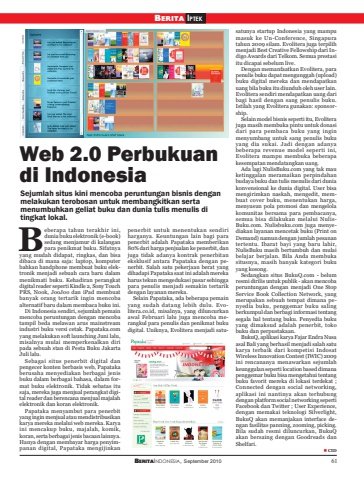 BERITAINDONESIA, September 2010 61Web 2.0 Perbukuandi IndonesiaSejumlah situs kini mencoba peruntungan bisnis denganmelakukan terobosan untuk membangkitkan sertamenumbuhkan geliat buku dan dunia tulis menulis ditingkat lokal.eberapa tahun terakhir ini,dunia buku elektronik (e-book)sedang menjamur di kalanganpara penikmat buku. Sifatnyayang mudah didapat, ringkas, dan bisadibaca di mana saja: laptop, komputerbahkan handphone membuat buku elektronik menjadi sebuah cara baru dalammenikmati buku. Kehadiran perangkatdigital reader seperti Kindle 2, Sony TouchPRS, Nook, JooJoo dan iPad membuatbanyak orang tertarik ingin mencobaalternatif baru dalam membaca buku ini.Di Indonesia sendiri, sejumlah pemainmencoba peruntungan dengan mencobatampil beda melawan arus mainstreamindustri buku versi cetak. Papataka.comyang melakukan soft launching Juni lalu,misalnya mulai memperkenalkan diripada sebuah stan di Pesta Buku JakartaJuli lalu.Sebagai situs penerbit digital danpengecer konten berbasis web, Papatakaberusaha menyediakan berbagai jenisbuku dalam berbagai bahasa, dalam format buku elektronik. Tidak sebatas itusaja, mereka juga menjual perangkat digital reader dan berencana menjual majalahelektronik dan koran elektronik.Papataka menyambut para penerbityang ingin menjual atau mendistribusikankarya mereka melalui web mereka. Karyaini mencakup buku, majalah, komik,koran, serta berbagai jenis bacaan lainnya.Hanya dengan membayar harga penyimpanan digital, Papataka mengijinkanpenerbit untuk menentukan sendiriharganya. Keuntungan lain bagi parapenerbit adalah Papataka memberikan80% dari harga penjualan ke penerbit, danjuga tidak adanya kontrak penerbitaneksklusif antara Papataka dengan penerbit. Salah satu pekerjaan berat yangdihadapi Papataka saat ini adalah merekaharus tekun mengedukasi pasar sehinggapara penulis menjadi semakin tertarikdengan layanan mereka.Selain Papataka, ada beberapa pemainyang sudah datang lebih dulu. Evolitera.co.id, misalnya, yang diluncurkanawal Februari lalu juga mencoba merangkul para penulis dan penikmat bukudigital. Uniknya, Evolitera menjadi satusatunya startup Indonesia yang mampumasuk ke Un-Conference, Singapuratahun 2009 silam. Evolitera juga terpilihmenjadi Best Creative Fellowship dari Indigo Awards dari Telkom. Semua prestasiitu dicapai sebelum live.Dengan memanfaatkan Evolitera, parapenulis buku dapat mengunggah (upload)buku digital mereka dan mendapatkanuang bila buku itu diunduh oleh user lain.Evolitera sendiri mendapatkan uang daribagi hasil dengan sang penulis buku.Istilah yang Evolitera gunakan: sponsorship.Selain model bisnis seperti itu, Evoliterajuga masih membuka pintu untuk donasidari para pembaca buku yang inginmenyumbang untuk sang penulis bukuyang dia sukai. Jadi dengan adanyabeberapa revenue model seperti ini,Evolitera mampu membuka beberapakesempatan mendatangkan uang.Ada lagi NulisBuku.com yang tak mauketinggalan meramaikan perpindahanbudaya buku dan tulis menulis dari duniakonvensional ke dunia digital. User bisamengirimkan naskah, mengedit, membuat cover buku, menentukan harga,menyusun pola promosi dan mengelolakomunitas bersama para pembacanya,semua bisa dilakukan melalui NulisBuku.com. Nulisbuku.com juga menyediakan layanan mencetak buku (Print onDemand) namun dengan jumlah pesanantertentu. Ibarat bayi yang baru lahir,NulisBuku masih bertumbuh dan mulaibelajar berjalan. Bila Anda membukasitusnya, masih banyak kategori bukuyang kosong.Sedangkan situs BukuQ.com - belumresmi dirilis untuk publik - akan mencobaperuntungan dengan menjadi One StopService Book Collection Network, yangmerupakan sebuah tempat dimana penyedia buku, penggemar buku salingberkumpul dan berbagi informasi tentangsegala hal tentang buku. Penyedia bukuyang dimaksud adalah penerbit, tokobuku dan perpustakaan.BukuQ, aplikasi karya Fajar Endra Nusaasal Bali yang berhasil menjadi salah satukarya terbaik dari kompetisi IndosatWireless Innovation Contest (IWIC) 2009ini rencananya menawarkan sejumlahkeunggulan seperti location based dimanapenggemar buku bisa mengetahui tentangbuku favorit mereka di lokasi terdekat ;Connected dengan social networking,aplikasi ini nantinya akan terhubungdengan platform social networking sepertiFacebook dan Twitter ; User Experience,dengan memakai teknologi Silverlight,BukuQ akan memanjakan interface dengan fasilitas panning, zooming, picking.Bila sudah resmi diluncurkan, BukuQakan bersaing dengan Goodreads danShelfari. CIDBBERITA IPTEK
