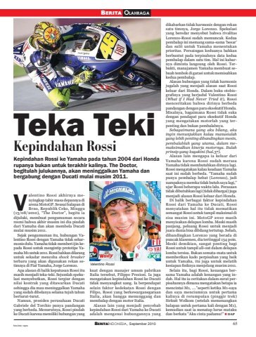 BERITAINDONESIA, September 2010 65BERITA OLAHRAGAfoto-foto: reproTeka TekiKepindahan Rossi ke Yamaha pada tahun 2004 dari Hondarupanya bukan untuk terakhir kalinya. The Doctor,begitulah julukannya, akan meninggalkan Yamaha danbergabung dengan Ducati mulai musim 2011.alentino Rossi akhirnya menyingkap tabir masa depannya diarena MotoGP. Seusai balapan diBrno, Republik Ceko, Minggu(15/08/2010), “The Doctor”, begitu iadijuluki, membuat pengumuman secararesmi bahwa akhir musim ini dia pindahdari Yamaha dan akan membela Ducatimulai musim 2011.Sejak pengumuman itu, hubungan Valentino Rossi dengan Yamaha tidak seharmonis dulu. Yamaha tidak memberi ijin kepada Rossi untuk mengintip prototipe Yamaha M1 untuk 2011. Rossi bahkan dilaranguntuk sekadar mencoba shock breakerterbaru yang akan digunakan rekan setimnya di Fiat Yamaha, Jorge Lorenzo.Apa alasan di balik keputusan Rossi itumasih menjadi teka-teki. Sejumlah spekulasi menyebutkan, Rossi tergiur dengannilai kontrak yang ditawarkan Ducatisehingga dia mau meninggalkan Yamahayang sudah dibelanya selama tujuh tahunberturut-turut.Namun, presiden perusahaan DucatiGabriele del Torchio punya pandanganyang berbeda. Menurutnya, Rossi pindahke Ducati karena memiliki hubungan yangkuat dengan manajer umum pabrikanItalia tersebut, Filippo Preziosi. Ia jugamengatakan kepindahan Rossi ke Ducatitidak menyangkut uang. Ia berpendapatselain faktor kedekatan Rossi denganFilipo, Rossi yang berkewarganegaraanItalia, akan bangga menunggang danmembalap dengan motor Italia.Alasan lain yang menjadi penyebabkepindahan Rossi dari Yamaha ke Ducatiadalah mengenai hubungannya yangdikabarkan tidak harmonis dengan rekansatu timnya, Jorge Lorenzo. Spekulasiyang beredar menyebut bahwa rivalitasLorenzo-Rossi sudah memuncak. Keduapembalap ini memang sama-sama ‘besar’dan sulit untuk Yamaha menentukanprioritas. Persaingan keduanya bahkanberbuntut pada terpisahnya data keduapembalap dalam satu tim. Hal ini kabarnya diminta langsung oleh Rossi. Terbukti, manajamen Yamaha membuat sebuah tembok di garasi untuk memisahkankedua pembalap.Alasan hubungan yang tidak harmonisjugalah yang menjadi alasan saat Rossikeluar dari Honda. Dalam buku otobiografinya yang berjudul Valentino Rossi(What if I Had Never Tried it), Rossimenceritakan bahwa dirinya berbedapandangan dengan para eksekutif Honda.Misalnya, bagaimana Rossi tidak sukadengan pendapat para eksekutif Hondayang mengatakan motorlah yang terpenting dan bukan pembalabnya.Sebagaimana yang aku bilang, akuingin menunjukkan kalau manusialahyang lebih penting dibandingkan mesin,pembalablah yang utama, dalam memaksimalkan kinerja motornya. Itulahprinsip yang kuyakini (hal.37).Alasan lain mengapa ia keluar dariYamaha karena Rossi sudah merasaYamaha tidak membutuhkan dirinya lagi.Rossi mengatakan kalau keadaan Yamahasaat ini sudah berbeda. “Yamaha sudahpunya pembalap hebat (Lorenzo), jadinampaknya mereka tidak butuh saya lagi,”ujar Rossi beberapa waktu lalu. Perasaantidak dibutuhkan lagi (tidak dihargai) jugamenjadi alasan Rossi keluar dari Honda.Di balik berbagai faktor kepindahanRossi dari Yamaha ke Ducati, Rossimenyatakan hal itu tidak mematikansemangat Rossi untuk tampil maksimal disisa musim ini. MotoGP 2010 masihmenyisakan delapan lomba. Meski masihpanjang, peluang Rossi untuk menjadijuara dunia bisa dibilang tertutup. Sebab,dibandingkan Lorenzo yang berada dipuncak klasemen, dia tertinggal 134 poin.Meski demikian, sangat penting bagiRossi untuk tampil all-out dalam delapanlomba tersisa. Bukan semata-mata untukmemberikan kado perpisahan yang baikuntuk Yamaha, itu juga untuk melatihkesiapan fisiknya menjelang musim 2011.Selain itu, bagi Rossi, kenangan bersama Yamaha adalah kenangan yang indah. Hal itu ia ceritakan dalam surat perpisahannya dimana mengatakan betapa iamencintai M1, ....”seperti ketika M1-sayadan saya menciumnya untuk pertamakalinya di rerumputan (pinggir trek)Sirkuit Welkom (setelah memenangkanbalapan untuk pertama kali dengan M1),kemudian saat ia menatap lurus matakudan berkata “Aku cinta padamu!” DAPKepindahan RossiVValentino Rossi
