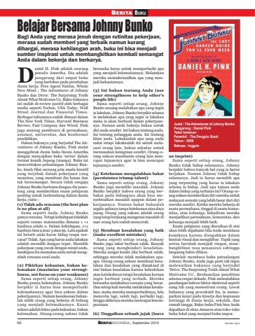 66 BERITAINDONESIA, September 2010BERITA BUKUfoto-foto: reproBelajar Bersama Johnny BunkoBagi Anda yang merasa jenuh dengan rutinitas pekerjaan,merasa sudah memberi yang terbaik namun kurangdihargai, merasa kehilangan arah, buku ini bisa menjadisumber inspirasi untuk membangkitkan kembali semangatAnda dalam bekerja dan berkarya.aniel H. Pink adalah seorangpenulis Amerika. Dia adalahpengarang dari empat bukuyang berfokus pada perubahandunia kerja: Free Agent Nation, WholeNew Mind ; The Adventures of JohnnyBunko dan Drive: The Surprising TruthAbout What Motivates Us. Buku-bukunyaini sudah di-review positif oleh berbagaimedia seperti Forbes, USA Today, WallStreet Journal dan Financial Times.Berbagai tulisannya sudah dimuat dalamThe New York Times, Harvard BusinessReview, Fast Company dan Wired. Pinkjuga seorang pembicara di perusahaan,asosiasi, universitas, dan konferensipendidikan.Dalam bukunya yang berjudul The Adventures of Johnny Bunko, Pink mulaimenggebrak dunia buku bisnis Amerikadengan menyajikan buku ‘serius’ dalamformat komik Jepang (manga). Buku inimenceritakan petualangan Johnny Bunko, kisah fiksi seorang pria muda kreatifyang terjebak dalam pekerjaan yangmonoton, yang membuat dia bosan dantak bersemangat. Secara tidak sengajaJohnny Bunko bertemu dengan Jin penolong yang memberikan enam pelajaranpenting untuk berkembang dalam duniakerja, yaitu :(1) Tidak ada rencana (the best planis no plan at all)Sama seperti Anda, Johnny Bunkopunya rencana. Tetapi kehidupan tidaklahseperti rumus matematika dimana 1 +1hasilnya selalu 2. Dalam kehidupan, 1+1hasilnya bisa 9 atau 3 atau 99. Lalu apakahini berarti anda harus hidup tanpa rencana? Tidak. Apa yang harus anda lakukanadalah memilih dengan tepat. Memilihpekerjaan yang cocok dengan minat anda,meskipun itu memaksa anda untuk mengubah rencana awal anda.(2) Pikirkan kekuatan, bukan kelemahan (maximize your strengthness, not focus on your weakness)Sama seperti setiap orang, JohnnyBunko punya kelemahan. Johnny Bunkoberpikir ia harus bisa memperbaikikelemahannya agar bisa sukses dalampekerjaannya. Namun kesuksesan bukanlah milik orang yang bekerja di bidangyang menjadi kelemahannya. Kuncisukses adalah fokus pada kekuatan, bukankelemahan. Orang-orang sukses tidakberusaha keras untuk memperbaiki apayang menjadi kelemahannya. Melainkanmereka memaksimalkan apa yang menjadi kekuatannya.(3) Ini bukan tentang Anda (useyour strengthness to help other’speople life)Sama seperti setiap orang, JohnnyBunko senang melakukan apa yang inginia lakukan. Johnny Bunko berpikir selamaia melakukan apa yang ingin ia lakukanmaka ia akan berhasil dalam pekerjaannya. Namun anda bekerja bukan untukdiri anda sendiri. Ini bukan tentang anda.Ini tentang pelanggan anda. Ini tentangklien anda. Lakukanlah apa yang andasukai tetapi lakukanlah itu untuk melayani orang lain, bukan sekadar untukmemuaskan keinginan sendiri. Orang-orang sukses mambantu orang lain mencapai tujuannya agar ia bisa mencapaitujuannya sendiri.(4) Ketekunan mengalahkan bakat(persistence triump talent)Sama seperti setiap orang, JohnnyBunko juga memiliki masalah. JohnnyBunko berpikir bahwa orang yang berbakat pada bidangnya akan bisa menyelesaikan masalah apapun dalam pekerjaannya. Namun bakat bukanlahsegala-galanya tanpa ketekunan atau dayajuang. Orang yang sukses adalah orangyang tetap berjuang mengatasi masalah disaat orang lain sudah menyerah.(5) Membuat kesalahan yang baik(make excellent mistakes)Sama seperti setiap orang, JohnnyBunko juga takut berbuat salah. Banyakorang yang menghindari kesalahan.Mereka sangat kuatir jika berbuat salah,sehingga mereka tidak melakukan apaapa. Orang-orang sukses membuat kesalahan dan kesalahan yang dimaksud disini bukan kesalahan karena kebodohanatau keteledoran tetapi kesalahan karenaingin berbuat yang terbaik. Merekaberusaha melakukan sesuatu yang besar.Dan setiap kali mereka melakukan kesalahan, maka mereka memperbaikinya, lalumencoba lagi, salah lagi, perbaiki lagi,hingga akhirnya mereka mencapai kesempurnaan.(6) Tinggalkan sebuah jejak (leavean imprint)Sama seperti setiap orang, JohnnyBunko tidak hidup selamanya. Johnnyberpikir bahwa banyak hal yang ia haruskerjakan. Namun Johnny tidak hidupselamanya. Jadi ia harus memilih apayang terpenting yang harus ia lakukanselama ia hidup. Jadi apa tujuan andadalam hidup yang terbatas ini? Orang-orang sukses memberikan diri mereka untukmelayani sesuatu yang lebih besar dari dirimereka sendiri. Ketika mereka bekerja disuatu perusahaan, tinggal di suatu komunitas, atau keluarga, kehadiran merekamenjadikan perusahaan, komunitas, dankeluarga menjadi lebih baik.Enam pelajaran yang diuraikan di siniakan lebih dipahami bila Anda membacakomiknya karena disuguhkan dalambentuk visual dan menghibur. Topik yangserius berubah menjadi ringan, membangkitkan rasa penasaran sehinggalangsung habis dibaca.Setelah membaca buku petualanganJohnny Bunko, Anda juga pasti tak inginmelewatkan bukunya yang berjudul‘Drive: The Surprising Truth About WhatMotivates Us’. Berdasarkan penelitianselama empat dekade, Pink mematahkanpandangan bahwa faktor eksternal sepertiuang lah yang memotivasi orang. Lewatbukunya yang provokatif itu, ia memaparkan kunci pada kinerja dan kepuasantertinggi di dunia kerja, sekolah, danrumah tangga. Buku-buku Pink bisa Andadapatkan di situs Amazon atau toko-tokobuku lokal yang menjual buku impor.DJudul : The Adventures of Johnny BunkoPengarang : Daniel PinkTebal halaman :Penerbit : The Penguin BookTahun : 2008Bahasa : Inggris