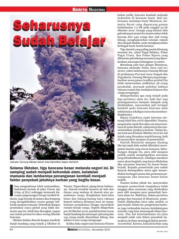 44 BERITAINDONESIA, November 2010BERITA NASIONALfoto-foto: reproSelama Oktober, tiga bencana besar melanda negeri ini. Disamping sudah menjadi kehendak alam, kelalaianmanusia dan lambannya penanganan kembali menjadifaktor penyebab jatuhnya korban yang begitu besar.lmu pengetahuan telah memastikan,Indonesia berada di jalur Cincin Api(ring of fire) sehingga termasuk kawasan pegunungan berapi teraktif didunia, juga berada di antara dua lempengyang mengakibatkan rawan gempa tektonik maupun tsunami. Ditambah denganperubahan cuaca global yang tidak menentu saat ini, tidak bisa disangkal, negerinan indah permai ini akan sering dilandabencana.Oktober kelabu diawali dengan musibahbanjir bandang yang terjadi 4 Oktober diWasior, Papua Barat, ujung timur Indonesia. Daerah tersebut terseret air bah daridanau yang meluap di daerah atas pemukiman warga. Bongkahan batu-batubesar dan batang-batang kayu raksasahanyut terbawa derasnya arus air menghantam pemukiman hingga meratakanrumah-rumah warga. Seperti dilaporkanper 18 Oktober 2010, jumlah korban tewasbanjir bandang itu mencapai 158 orang dan145 orang masih dinyatakan hilang, dansekitar 6.000 warga mengungsi.Ketika duka negeri atas bencana Wasiorbelum pulih, bencana kembali melandaIndonesia di kawasan barat. Kali ini,bencana menimpa bumi Mentawai, Sumatra Barat yang diguncang gempaberkekuatan 7,2 SR pada tanggal 25-26Oktober 2010. Gempa yang disusul olehgelombang tsunami itu menewaskan tidakkurang dari 449 warga dan 338 oranghilang, menghancurkan ratusan rumahdan tempat ibadah, serta menghanyutkanberbagai harta benda lainnya.Tiga daerah yang paling parah diterjangtsunami itu, yakni Pagai Selatan, PulauPagai Utara, dan Pulau Sipora yangdihantam gelombang tsunami yang diperkirakan mencapai ketinggian 15 meter.Berselang satu hari gempa Mentawai,bencana melanda Pulau Jawa (26/10/2010), yakni meletusnya Gunung Merapidi perbatasan Provinsi Jawa Tengah danYogyakarta. Gunung Merapi yang mengeluarkan awan panas (wedhus gembel) itutelah menewaskan sedikitnya 38 orangpenduduk, merusak puluhan bahkanratusan rumah dan memaksa belasan ribuorang mengungsi.Memperhatian apa yang terjadi padatiga peristiwa alam ini, baik dari segipenanganannya maupun dampak yangdiakibatkan, masyarakat jadi teringatkembali pada bencana-bencana alamsebelumnya sekaligus mencoba membandingkannya.Kapan terjadinya suatu bencana memang tidak bisa 100% diprediksi. Namun,pengenalan sejak dini akan ancaman bencana di suatu daerah, seharusnya bisa meminimalkan jatuhnya korban. Dalam kasus bencana di bulan Oktober 2010 ini, halitulah yang dirasakan masih kurang, baikdi masyarakat maupun di pemerintah.Daerah Mentawai maupun GunungMerapi sejak dulu sudah diketahui merupakan daerah yang rawan bencana. Sehubungan dengan itu, para ahli maupunpublik sudah mengingatkan ancamanyang ditimbulkannya, sekaligus memberisaran akan langkah yang harus dilakukanjika ancaman bencana itu benar-benarterjadi. Kepada pemerintah pun sudahbanyak disampaikan saran agar menyediakan berbagai sarana dan prasarana penanganan jika bencana benar-benarterjadi.Namun kedua pihak itu, masyarakatmaupun pemerintah tampaknya tidaktanggap akan ancaman yang disebutkanpara ahli maupun para pemerhati bencana alam itu. Buktinya, dalam peristiwagempa dan tsunami di Mentawai, pemerintah dikabarkan baru tahu setelah 12jam terjadi. Selain itu, pengiriman bantuan juga terkendala karena ketidaksiapanarmada yang bisa menempuh lokasi bencana. Dua hal keterlambatan itu jelasmenjadi salah satu faktor penyebab banyaknya korban meninggal dalam peristiwa tersebut. Karena, banyak korban yangSeharusnyaSudah BelajarSeharusnyaSudah BelajarILetusan Gunung Merapi belum bisa diprediksi kapan berhenti