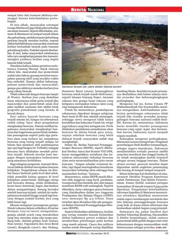 BERITAINDONESIA, November 2010 45BERITA NASIONALsempat lolos dari tsunami akhirnya meninggal karena keterlambatan pertolongan.Di lain pihak, masyarakat setempat(warga Mentawai) juga tidak peka terhadapancaman tsunami. Seperti diberitakan, tsunami di Mentawai ini sempat terjadi dalamdua gelombang, setelah tsunami gelombangpertama banyak menelan korban, namunakibat ketidaktahuan masyarakat membuatkorban bertambah banyak pada tsunamigelombang kedua. Padahal seperti disebutkan di atas, kalau masyarakat sebelumnyatahu cara menghadapi gempa dan tsunami,mungkin jatuhnya korban yang begitubanyak tidak terjadi.Demikian halnya dalam peristiwa meletusnya Gunung Merapi. Sejak ratusantahun lalu, masyarakat dan pemerintahsudah tahu bahwa gunung tersebut merupakan gunung aktif yang sewaktu-waktubisa meledak. Namun akibat kekurangpekaan pemerintah dan masyarakat,gempa pun akhirnya menelan korban jiwayang cukup banyak.Tidak terkecuali dengan bencana banjirdi Wasior. Korban jiwa yang demikianbesar seharusnya tidak perlu terjadi jikamasyarakat dan pemerintah sejak dinipeka melihat ancaman dari akibat letakgeografis pemukiman yang berada dibawah danau.Dari sekian banyak bencana yangterjadi selama ini, bangsa ini sebenarnyasudah cukup ‘kaya’ akan pengalamanmenghadapi bencana. Namun melihat bagaimana masyarakat menghadapi bencana dan bagaimana pemerintah melakukan penanganan seperti pada tiga peristiwa alam yang terbaru ini, tampaknyabencana yang sering terjadi selama inibelum bisa memberi efek pembelajaranapa-apa bagi bangsa ini. Terbukti, tanggapbencana baru dilakukan sesudah peristiwa terjadi. Seluruh otoritas baru bergegas dengan manajemen kedaruratanyang umumnya berlebihan.Bagi sebagian pengamat, tsunami Mentawai bahkan disebut merupakan bencanakebijakan. Pengetahuan selama ini disebut hanya berhenti pada level akal sehat,tidak memiliki kaitan apapun di levelkebijakan pemerintah. Sehingga setiapkali bencana datang, selalu kelabakan,kocar-kacir, keteteran, kaget, dan lambandalam mengantisipasi. Senang bereaksisetelah bencana terjadi, setelah itu melupakannya kembali hingga terjadi lagi bencana dengan jumlah korban jiwa yanglebih besar lagi.Khusus mengenai penanganan gempa,Ninok Leksono dalam artikelnya di harianKompas (29/10/2010) mengatakan,gempa adalah sosok yang menakutkanyang bisa menelan siapa saja tanpa pandang bulu. Setelah gempa Aceh (2004),Nias (2005), Yogyakarta dan Jawa Barat(2006), Bengkulu (2007), dan Padang,Sumatera Barat (2009), kemungkinanbencana untuk terjadi masih lebih besar,seperti letusan Gunung Super, tsunamiraksasa dan gempa bumi raksasa yangketiganya merupakan bahaya laten yangsiap mengancam Indonesia.Untuk itu menurutnya, pembelajaranseharusnya diperkuat dengan pelajaranilmu bumi di SD dan sekolah menengah,sehingga siswa mengenal tidak hanyakeindahan dan kekayaan Tanah Air, tetapijuga bahaya yang bisa mengancam. Perludilakukan pendekatan pemahaman akanbencana ke dalam benak para siswa,supaya sebelum bencana yang lebihdahsyat terjadi, masyarakat sudah siapmenghadapi.Selain itu, Badan Nasional Penanggulangan Bencana (BNPB), seperti dikatakan Herlina Amra dari Komisi VIII DPR,harus menggalakkan sosialisasi dan kesadaran masyarakat terhadap bencanaalam serta mensosialisasikan peta rawanbencana. “Jangan sekadar seremoni belaka, tapi dapat meningkatkan kesadaranmasyarakat terhadap alam sehingga bisamenimalisir korban,” katanya.Menurutnya, walau BNPB masih dibatasi oleh anggaran yang kecil, peralatan,transportasi dan kendala alat-alat janganmembuat BNPB sulit melangkah. Sepertidiketahui, dana cadangan pasca bencanayang dialokasikan dalam pos AnggaranPendapatan dan Belanja Negara (APBN)2011 mencapai Rp 4,9 triliun. Danatersebut akan dicairkan bila ada pengajuan Badan Nasional Penanggulangan Bencana (BNPB).Seperti disebutkan sebelumnya, korbanpun sering semakin banyak berjatuhanakibat lambatnya proses evakuasi danmemberikan pertolongan pada korbanyang masih selamat. Cuaca dan sulitnyamedan untuk ditempuh sering dijadikankambing hitam. Kendala ini pada prinsipnya disebabkan oleh belum adanya standar prosedur dan kekuranglengkapanperlengkapan.Mengenai hal ini, Ketua Umum PPMuhammadiyah Din Syamsuddin misalnya mengatakan, keterlambatan pemberian pertolongan seharusnya tidakterjadi jika standar prosedur penanggulangan bencana nasional sudah dimiliki. Karena itu, menurutnya, Indonesiaharus memiliki standar penangananbencana yang cepat, tepat, dan bermanfaat karena Indonesia nyaris menjadinegara musibah.Sedangkan mengenai perlengkapan,khususnya sarana transportasi, Pengamatpenerbangan Dudi Sudibyo berpendapat,sebagai negara kepulauan, Indonesiamembutuhkan armada pesawat amfibiyang bisa mendarat dan tinggal landas diair untuk menjangkau daerah terpencilsebagai sarana tanggap bencana. Dalamsituasi normal, pesawat tersebut dapatdigunakan untuk angkutan penumpangdan barang di tempat-tempat terpencil.Selain beberapa hal disebutkan di atas,menurut Direktur Program Kemitraanuntuk Pembaruan Tata Kelola Pemerintahan, Emmy Hafild, instalasi jaringankomunikasi di daerah terpencil juga perludiperkuat. Pengalaman keterlambataninformasi kejadian di Mentawai menurutnya sebaiknya dijadikan momentumuntuk segera membangun tata kelola dantata laksana penanggulangan bencanayang baik, di mana sistem informasi dankomunikasi adalah bagian yang prinsipil.Sementara itu, pakar Geodesi dariInstitut Teknologi Bandung, HasanuddinZ Abidin berpendapat, sudah saatnyapemerintah lebih peduli dengan riset-risetkebencanaan dengan memasukkan studikebencanaan sebagai prioritas. BS, SITMentawai tampak dari udara setelah dilanda tsunami