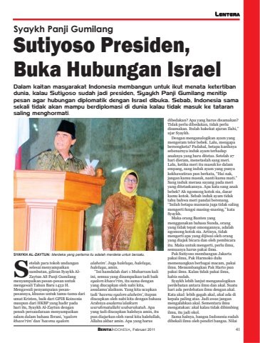 BERITAINDONESIA, Februari 2011 41LENTERASyaykh Panji GumilangSutiyoso Presiden,Buka Hubungan IsraelDalam kaitan masyarakat Indonesia membangun untuk ikut menata ketertibandunia, kalau Sutiyoso sudah jadi presiden, Syaykh Panji Gumilang menitippesan agar hubungan diplomatik dengan Israel dibuka. Sebab, Indonesia samasekali tidak akan mampu berdiplomasi di dunia kalau tidak masuk ke tataransaling menghormati.dibedakan? Apa yang harus disamakan?Tidak perlu dibedakan, tidak perludisamakan. Itulah hakekat ajaran Ilahi,’’ujar Syaykh.Dengan menganalogikan ayam yangmengeram telor bebek. Lalu, mengapabersengketa? Padahal, betapa kasihnyasebenarnya induk ayam terhadapanaknya yang baru ditetas. Setelah 27hari dieram, menetaslah sang meri.Lalu, ketika meri itu masuk ke dalamempang, sang induk ayam yang punyakekhawatiran pun berkata, “Hai nak,jangan kamu masuk, nanti kamu mati.”Sang induk merasa sayang pada meriyang ditetaskannya. Apa kata sang anakbebek? Ah ngomong kotok sia, dasarkamu kotok. Sebab induk ayam tidaktahu bahwa meri pandai berenang.‘’Inilah betapa manusia juga tidak salingmengerti fungsi masing-masing,” kataSyaykh.Maka orang Banten yangmenggunakan bahasa Sunda, orangyang tidak tepat omongannya, adalahngomong kotok sia. Artinya, tidakmengerti apa yang dijiwai oleh orangyang diajak bicara dan oleh pembicaraitu. Maka untuk mengerti, perlu ilmu,semuanya harus pakai ilmu.Pak Sutiyoso membangun Jakartapakai ilmu, Pak Harmoko dulumemenangkan berbagai macam, pakaiilmu. Menumbangkan Pak Harto punpakai ilmu. Kalau tidak pakai ilmu,habis sudah.Syaykh lebih lanjut menganalogikanperdebatan antara ilmu dan akal. Suatuhari ada perdebatan ilmu dengan akal.Kata akal: lebih gagah akal, akal ada dikepala paling atas. Jadi awas janganmengalahkan akal. Sementara ilmumengatakan: akal kalau tidak dibimbingilmu, itu jadi okol.Sama halnya, bangsa Indonesia sudahdibekali ilmu oleh pendiri bangsa. NilaiSetelah para tokoh undanganselesai menyampaikansambutan, giliran Syaykh AlZaytun AS Panji Gumilangmenyampaikan pesan-pesan untukmengawali Tahun Baru 1432 H.Mengawali penyampaian pesanpesannya, khusus untuk tamu-tamu dariumat Kristen, baik dari GPIB Koinoniamaupun dari HKBP yang hadir padahari itu, Syaykh Al-Zaytun denganpenuh persaudaraan menyampaikansalam dalam bahasa Ibrani, ‘syalomkhave’rim’ dan ‘havenu syalomalaheim’. Juga haleluya, haleluya,haleluya, amin.’’Ini hamdalah dari 1 Muharram kaliini, semua yang disampaikan tadi baiksyalom khave’rim, itu sama denganyang diucapkan oleh nabi kita,assalamu’alaikum. Yang kita ucapkantadi ‘havenu syalom alaheim’, itupundiucapkan oleh nabi kita dengan bahasaArabnya asalamu’alaikumwarahmatullahi wabarakatuh. Apayang tadi diucapkan haleluya amin, itupun diajarkan oleh rasul kita halelullah,Allahu akbar amin. Apa yang harusSYAYKH AL-ZAYTUN: Merdeka yang pertama itu adalah merdeka untuk bersatu.