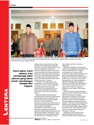36 BERITAINDONESIA, Maret - 10 April 2011 L ENTERALentera36 foto-foto: dok. berindoKami yakin, kamipaham, kitamempunyai jalanpikiran yang samauntuk membangunbangsa dannegara.sebagai ketua umum partai, tapi jugadalam konteks tadzim junior kepadaseniornya. Anas dan Edhie Baskoro yangsaat itu mengenakan baju batikmengaku sebelum sampai ke Mahad AlZaytun sudah lebih dulu membuka bajupartainya. “Baju saya sudah saya lepasdi luar tadi. Saya kalau baju biru banyaktapi sudah saya lepas bajunya karenasaya hadir dalam konteks tadzim juniorkepada seniornya,” ujarnya.Kembali secara diplomatis, Anasmengatakan, “dan di mana pun jugarumusnya, senior itu pasti sayang danmembantu juniornya. Itu sudahsunatullah. Dan sunatulllah itu sayayakin berlaku di Mahad Al-Zaytun.Karena itu, sebetulnya sudah selesaisemua.”Setelah kembali menyampaikanterimakasih atas sambutan, penerimaanyang sangat hangat, bersahabat, danpenuh sayang seorang senior kepadajuniornya, Anas mengatakankeyakinannya bahwa pertemuan kali iniakan menjadi titik yang penting untukmembangun kesepahamankesepahaman yang dalam tentangbagaimana mengurus bangsa dannegara ke depan dengan makin baik danmakin bermartabat. Selanjutnya, Anasmengatakan, dirinya mengikuti petuahdari Syaykh saja. “Selebihnya, juniorikut petuah seniornya,” katanyadiplomatis.Sebelum mengakhiri sambutannya,Anas juga menggunakan kesempatan ituuntuk memperkenalkan sebagianrombongannya. Dengan sedikitberseloroh, Anas memperkenalkan satupersatu rombongannya mulai dariSekjen Partai Demokrat, Edhie BaskoroYudhoyono. Tentang pria yang akrabdipanggil Ibas ini, Anas mengatakanbahwa kedatangan Edhie Baskorosebetulnya memiliki misi agak khusus,yakni mencari siapa tahu ada santriyang cocok. Ucapan itu spontandisambut tepuk tangan oleh seluruhhadirin.Anas selanjutnya memperkenalkanHerman Poiron, Wakil Ketua Komisi IVDPR RI yang juga menanganiDepartemen Pertanian di DPP PartaiDemokrat. Tentang pria ini, masihdengan berguyon, Anas mengatakanilmu pertaniannya kalah jauh denganSyaykh. “Tadi (saat di meja makan) adakuliah khusus tentang beras, tentangkacang, tentang kedelai, yang itu belumada di Komisi IV. Jadi Syaykh ini jugapatut kita sebut sebagai “BegawanPertanian,” katanya.Kemudian, Anas berturut-turutmemperkenalkan Saan Mustofa,Sekretaris Fraksi Partai Demokrat diNYANYIKAN INDONESIA RAYA: Sebelum memberikan sambutan dalam acara silaturahmi pengurus Partai Demokrat dengancivitas Al-Zaytun (17/3/2011), hadirin lebih dulu menyanyikan lagu Indonesia Raya, tampak Syaykh Al-Zaytun dan AnasUrbaningrum menyanyi dengan khidmat