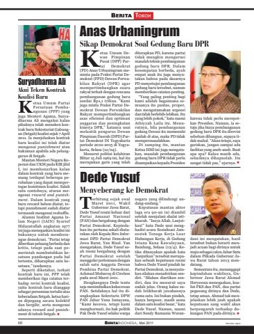 60 BERITAINDONESIA, Mei 2011BERITA TOKOHAnas UrbaningrumSikap Demokrat Soal Gedung Baru DPRSuryadharma AliAkui Teken KontrakKoalisi BaruDede YusufMenyeberang ke DemokratKetua Umum PartaiPersatuan Pembangunan (PPP) yangjuga Menteri Agama, Suryadharma Ali mengakui kalaupihaknya telah meneken kontrak baru Sekretariat Gabungan (Setgab) koalisi sejak 7 April2011. Ia menjelaskan kontrakbaru koalisi ini telah diaturmengenai punishment atauhukuman apabila ada pelanggaran di Setgab.Mantan Menteri Negara Koperasi dan UKM pada KIB jilidI, ini membenarkan kalaudalam kontrak yang baru memang terdapat beberapa perubahan yang dapat mempertegas komitmen koalisi. Salahsatu contohnya, aturan mengenai reward and punishment. Dalam kontrak yangbaru reward belum diatur, tetapi punishment sudah diaturtermasuk mengenai reshuffle.Alumni Institut Agama Islam Negeri (IAIN) SyariefHidayatullah angkatan 1977ini juga menegaskan koalisi inibukannya untuk memberangus demokrasi. “Partai tetapdiberikan peluang berbeda dankritis, tetapi pada saat pemerintah membutuhkan kesatuan pandangan pada haltertentu, diharapkan satu kesatuan,” tandasnya.Seperti diketahui, terkaitkontrak baru ini, PPP telahmemberikan tiga catatan terhadap revisi kontrak koalisi,yaitu kontrak baru dianggapsebagai peresmian tertulis ataskeberadaan Setgab, ketua harian dipegang secara kolektifdan bergilir, serta mengenaiadanya reward and punishment di tubuh Setgab. Ketua Umum Dewan PimpinanPusat (DPP) Partai Demokrat(PD) Anas Urbaningrum meminta pada Fraksi Partai Demokrat (FPD) Dewan Perwakilan Rakyat (DPR) agarmempertimbangkan suararakyat terkait dengan rencanapembangunan gedung barusenilai Rp1,1 triliun. “Kamijuga minta Fraksi Partai Demokrat Dewan PerwakilanRakyat mempertimbangkanasas efisiensi dan optimasianggaran dan peningkatankinerja DPR,” katanya usaimelantik pengurus DewanPimpinan Daerah (DPD) Partai Demokrat DI Yogyakartaperiode 2010-2015 di Yogyakarta, Selasa (12/04).Menurut politisi kelahiranBlitar 15 Juli 1969 ini, hal itumerupakan garis yang telahditerapkan PD, karena partaitidak mungkin mengurusimasalah teknis pembangunangedung baru DPR. Dalamkesempatan berbeda, ayahempat anak itu juga menyatakan bahwa pada dasarnyaPD menyetujui pembangunangedung baru tersebut, namunmemberikan catatan penting.“Yang paling penting bagikami adalah bagaimana semuanya itu pantas, proper,dan mengutamakan urgensidan tidak berlebih-lebihan. Ituyang lebih pokok,” kata suamiAthiyyah Laila itu. Menurutnya, bila pembangunangedung Dewan itu memenuhikaidah di atas, maka PD tidakmempermasalahkan.Di samping itu, mantanKetua HMI ini juga mengatakan, masalah pembangunangedung baru DPR tidak perludisampaikan kepada Presidenkarena tidak perlu merepotkan Presiden. Namun, ia setuju jika biaya pembangunangedung baru DPR itu direvisisebelum dibangun, supaya tidak mahal. “Akan tetapi, sayagariskan, jangan sampai adafasilitas yang aneh-aneh. Buatapa spa? Kalau masih ada,sebaiknya dihapuslah. Itusangat tidak pas,” ujarnya. Terhitung sejak awalMaret 2011, WakilGubernur Jawa Barat,Dede Yusuf resmi keluar dariPartai Amanat Nasional(PAN) dan bergabung denganPartai Demokrat. Kepindahan itu pertama sekali diutarakan oleh Kepala Biro Informasi DPD Partai DemokratJawa Barat, Yan Rizal. Yanmengatakan, Dede Yusuf suah resmi bergabung denganPartai Demokrat setelahmenggelar pertemuan dengansalah satu Anggota DewanPembina Partai Demokrat,Achmad Mubaroq di Cirebonpada awal Maret 2011.Hengkangnya Dede tentusaja menimbulkan kekecewanPAN. Setidaknya hal itu diungkapkan Sekretaris DPWPAN Jabar Yana Ismayana,“Kami kecewa, tetapi kamimenghormati, itu hak politikPak Dede Yusuf selaku warganegara yang dilindungi undang-undang.”Keputusan mantan aktorlaga era 90-an ini diambilsetelah menjalani shalat istikharah. “Insya Allah, Lanjutkan!” kata Dede usai menghadiri acara Sosialisasi Jamsostek Tenaga Kerja LuarHubungan Kerja, di GedungIstana Kana Kawaluyaan,Bandung, Selasa (12/4). Ketika ditanyakan apakah kata“lanjutkan” tersebut merupakan sebuah keputusan resmibahwa Dede Yusuf pindah kePartai Demokrat, ia menyatakan silakan menafsirkan sendiri. “Silakan diartikan sendiri, dan itu menurut sayasudah jelas. Orang kalau sudah Istikharah jawabannyacuma satu. Ini bukan pindah,hanya bergeser, masih samadalam satu koalisi besar,” kataDede Yusuf. Namun, suamidari Sendy Ramania Wurandani ini mengatakan, hasiltersebut bukan berarti menjadi acuan bagi dirinya untukmaju sebagai calon Jabar Satudalam Pilkada Gubernur Jawa Barat tahun 2013 mendatang.Sementara itu, menanggapikepindahan wakilnya, Gubernur Jawa Barat AhmadHeryawan menegaskan, koalisi PKS dan PAN, dua partaipegusung dirinya dan Dede,tetap aman. Ahmad tak menjelaskan lebih jauh apakahkeputusan sang wakil akanberpengaruh terhadap dukungan PAN pada dirinya. foto-foto: repro