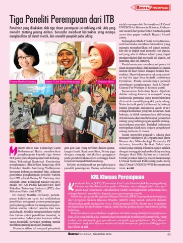 BERITAINDONESIA, Desember 2012 63YBERITA PEREMPUANMenteri Riset dan Teknologi GustiMohammad Hatta memberikanpenghargaan kepada tiga dosenITB pada puncak perayaan Hari Kebangkitan Teknologi Nasional. Pemberianpenghargaan disaksikan langsung olehPresiden Susilo Bambang Yudhoyonobersama beberapa menteri lain. Adapunpenerima penghargaan peneliti wanitadari ITB adalah Fenny M. Dwivany dariSekolah Ilmu Teknologi Hayati (SITH),Made Tri Ari Penia Kresnowati dariFakultas Teknologi Industri (FTI), danSidrotun Naim dari SITH.Dr. Fenny Martha Dwivany, perempuan kelahiran 1972 ini melakukanpenelitian mengenai proses pematanganpada pisang ambon. Ia mengamati perubahan warna, tekstur, aroma dan rasapada buah. Setelah menghabiskan waktudua tahun untuk penelitian tersebut, iamenemukan keberadaan hormon etilenyang memiliki peranan penting untukmembuat pisang menjadi matang. Hormon etilen ini menjadi penyebabgen-gen lain yang terlibat dalam pematangan buah. Saat penelitian, Fenny jugadengan sengaja melakukan gangguanpada pembentukan etilen sehingga buahtersebut menjadi tidak matang.Selain mendapatkan penghargaanpeneliti perempuan, Fenny sebelumnyaTiga Peneliti Perempuan dari ITBPenelitian yang dilakukan oleh tiga dosen perempuan ini terbilang unik. Ada yangmeneliti tentang pisang ambon, berusaha membuat bioreaktor yang mampumenghasilkan sel darah merah, dan meneliti penyakit pada udang.sudah memperoleh International L’OrealUNESCO for Women in Science, Endeavour Award dari pemerintah Australia pada2010 dan paper terbaik Hayati Award2009.Sedangkan Made Tri Ari Penia Kresnowati berusaha membuat bioreaktor yangmampu menghasilkan sel darah merah.Ide itu ia dapat saat meneliti sel punca,sel yang ada di dalam tubuh yang dapatmemproduksi diri menjadi sel darah, seljantung, dan sel lainnya.Penia berencana membuat sel punca iniakan memproduksi diri menjadi sel darahmerah di luar tubuh dengan teknik bioreaktor. Diperlukan suatu zat yang memicu hal itu agar bisa terjadi, contohnyaCytokine. Penia sebelumnya pernahmendapat penghargaan dari L‘OrealUnesco For Women in Science 2008.Sementara Sidrotun Naim dijulukidokter udang karena ia menjadi orangIndonesia pertama yang memfokuskandiri untuk meneliti penyakit pada udang.Naim tertarik pada hal itu saat ia bekerjauntuk program Indonesia-Aceh WWFsebagai konsultan program kelautan. Saatbekerja, ia tidak menemukan ahli udangdi Indonesia dan masih banyak petambakudang yang kebingungan apabila udangnya terkena penyakit. Padahal Indonesiamerupakan salah satu negara pengeksporudang terbesar di dunia.Naim meneliti penyakit udang danmencari vaksinnya di Departeman IlmuHewan dan Mikrobiologi University OfArizona, Amerika Serikat. Salah satusolusi yang sedang dikembangkan adalahdengan menggabungkan budidaya udangdengan ikan Nila dalam satu tambak.Untuk prestasi lainnya, Naim memenangiL’Oreak National Fellowship pada 2009dan L’Oreal-UNESCO FWIS International2012. cidBERITAINDONESIA, Desember 2012 63YBERITA PEREMPUANFenny Martha Dwivany Made Tri Ari Penia Kresnowati Sidrotun NaimKRL Khusus PerempuanKereta rel listrik (KRL) “Commuter Line” rute Jabodetabek layanan gerbongkhusus wanita diluncurkan pada 1 Oktober 2012 sebagai salah satu program KAI Commuter Jabodetabek untuk meningkatkan pelayanan dansebagai bentuk kepedulian kepada para penumpang wanita.Selain itu, program Rangkaian Khusus Wanita (RKW) merupakan kelanjutandari program Kereta Khusus Wanita (KKW) yang sudah terlebih dahuludiluncurkan pada 19 Agustus 2010. Pada program KKW, dalam satu rangkaianterdapat dua kereta khusus wanita, yaitu kereta paling depan dan kereta palingbelakang.Pemberlakuan penambahan rangkaian ini tidak mengubah jadwal perjalananKRL/KA yang sudah ada, namun akan menambah jumlah perjalanan KRL yangsudah ada sebanyak 531 perjalanan menjadi 539 perjalanan. Perjalanantambahan rangkaian khusus wanita ini tidak beroperasi pada hari Minggu danhari libur. cid