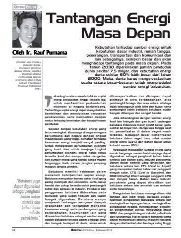 24 BERITAINDONESIA, Februari 2013OPINI EKUIN ZTerhentinya suplai energi dapat menyebabkankemiskinan dan menciptakan kerusakanperekonomian, serta memberikan dampakserius terhadap kesehatan dan kesejahteraanpenduduk.Sejalan dengan kebutuhan energi yangterus meningkat, khususnya di negara-negaraberkembang dan negara dengan tingkatindustrialisasi yang tinggi, perhatian terhadapkeamanan energi menjadi sangat penting.Untuk menciptakan pertumbuhan ekonomiyang kuat, dan untuk menjaga tingkatpertumbuhan ekonomi, energi harus selalutersedia, kuat dan mampu untuk menyediakan sumber energi yang handal tanpa mudahterganggu baik dalam jangka panjangmaupun jangka pendek.Batubara memiliki kekhasan dalammemenuhi keterjaminan suplai energi.Batubara merupakan bahan bakar fosil yangpaling melimpah dan ekonomis, serta cukuphandal dan cukup tersedia untuk pembangkitlistrik dan aplikasi di industri. Produksi danpenggunaan batubara didasarkan padateknologi yang sudah terbukti dan sudahbanyak digunakan. Batubara mampumenjawab tantangan mengenai dampaklingkungan dan tantangan mengenaikeamanan energi, serta pembangunan yangberkelanjutan. Keuntungan lain yangditawarkan batubara sebagai sumber energiadalah batubara tersedia dalam berbagai jenisdan banyak terdapat di dunia, aman untukditransportasikan dan disimpan, dapatditimbun di area pertambangan, areapembangkit tenaga, dan area antara, sifatnyatidak terpengaruh oleh iklim dan hujan, sertapembangkit listrik berbasis batubara sudahbanyak dibangun dan sangat handal.Jika dibandingkan dengan sumber energifosil lain (minyak dan gas bumi), cadanganbatubara Indonesia masih relatif besar, yaitusekitar 61 milyar ton. Hanya saja hingga saatini, pemanfaatan di dalam negeri masihterbatas. Sebagian besar pemanfaatanbatubara dalam negeri baru untuk sumberenergi listrik (63%) dan bahan bakar untukindustri semen (15%).Walaupun merupakan sumber energi yangmurah harganya, namun batubara juga dapatdigunakan sebagai penghasil bahan bakarsintetik dan bahan baku industri petrokimia.Bahan bakar sintetik yang dihasilkan daribatubara antara lain CTL (Coal to Liquid)yang merupakan bahan bakar cair penggantiminyak solar, CTG (Coal to Gasoline), danDME (Dimethyl Ehter) sebagai pengganti LPGdan minyak tanah. Bahan baku industripetrokimia yang dapat dihasilkan daribatubara antara lain amoniak dan metanolserta turunannya.Pengolahan batubara meningkatkan nilaitambah jauh lebih tinggi daripada ekspor.Manfaat pengolahan batubara antara lainmeningkatkan lapangan kerja, meningkatkanpendapatan negara, meningkatkan perolehan/penghematan devisa, mengurangi imporBBM, dan pengembangan industri petrokimiadan turunannya. Hal ini secara bersama-samadapat memperkuat struktur industri nasionaldengan nilai tambah dan berdaya saing tinggi.Oleh Ir. Rauf Purnama Oleh Ir. Rauf PurnamaTantangan EnergiMasa DepanTKebutuhan terhadap sumber energi untukkebutuhan dasar industri, rumah tangga,penerangan, transportasi dan komunikasi danlain sebagainya, semakin besar dan akanmenghadapi tantangan pada masa depan. Padatahun 2030 diperkirakan jumlah pendudukdunia sekitar 7,5 milyar, dan kebutuhan energidunia sekitar 60% lebih besar dari tahun2000. Maka, dunia harus menginvestasikanusaha secara besar-besaran untuk memproduksisumber energi terbarukan.“Batubara jugadapat digunakansebagai penghasilbahan bakarsintetik danbahan bakuindustripetrokimia.”eknologi modern membutuhkan suplaienergi berkualitas tinggi, terlebih lagiuntuk memfasilitasi pertumbuhanekonomi di negara berkembang.Pemikir dan PelakuIndustri Kimia,Presiden DirekturBakrie Kimia, mantanDirektur UtamaPetrokimia Gresik(Persero) dan KetuaUmum PersatuanInsinyur Indonesia(PII).
