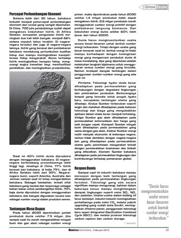 BERITAINDONESIA, Februari 2013 25Y OPINI EKUINPercepat Perkembangan EkonomiSelama lebih dari 30 tahun, batubaraterbukti menjadi pemercepat perkembanganekonomi dan sosial yang sangat diperlukan.Di China, 700 juta penduduknya sudah dapatmengakses kebutuhan listrik. Di AfrikaSelatan, kecepatan pengunaan listrik meningkat dua kali lebih banyak, menjadi 66%selama sepuluh tahun terakhir. Di negaranegara tersebut dan juga di negara-negaralainnya, listrik yang berasal dari pembakaranbatubara mendukung pertumbuhan kualitashidup dan mampu meningkatkan kesejahteraan hidup masyarakat. Akses terhadaplistrik meningkatkan harapan hidup, mengurangi angka kematian bayi, memfasilitasipendidikan, dan meningkatkan produktivitas.primer, maka diperkirakan pada tahun 2030sekitar 1,4 milyar penduduk tidak dapatmengakses listrik, 2,6 milyar penduduk masihmenggunakan sumber energi primitif denganpembakaran langsung biomassa. Dankebutuhan energi dunia sekitar 60% lebihbesar dari tahun 2000.Dunia harus menginvestasikan usahasecara besar-besaran untuk bentuk sumberenergi terbarukan. Tetapi dengan usaha yangbesar-besaran saat ini, bentuk energi ini tidakmampu berhadapan dengan kelangkaanenergi yang mengancam penduduk dunia dimasa mendatang. Apa yang diperlukan adalahmelakukan langkah bijaksana untuk menggunakan semua sumber energi yang tersedia.Namun terdapat banyak tantangan dalampenggunaan sumber-sumber energi yang adasaat ini:Pertama: Teknologi hydro skala besardihadapkan pada permasalahan yangberhubungan dengan degradasi lingkungandan pemindahan penduduk. Berkurangnyatempat yang tersedia untuk proyek hydrobaru, merupakan tantangan utama yangdihadapi. Kedua: Sumber terbarukan sepertiangin dan matahari dihadapkan pada batasanteknologi dan biaya yang menyebabkanaplikasi dalam skala besar menjadi terhalang.Ketiga: Sumber gas alam dihadapkan padapermasalahan ketersediaan dan harga yangnaik dengan cepat. Keempat: Sumber minyakbumi dihadapkan pada permasalahan yangsama dengan gas alam. Kelima: Sumber energinuklir nampak ekonomis di beberapa negara,namun tidak demikian dengan negara-negaralain yang dihadapkan pada permasalahanutama yaitu penerimaan masyarakat terkaitdengan permasalahan keamanan dan limbahyang dihasilkan. Keenam: Sumber batubaradihadapkan pada permasalahan lingkungan dankontribusinya terhadap pemanasan global.Respon DuniaSampai saat ini industri batubara mampumerespon dengan baik tantangan yangdihadapkan pada permasalahan lingkungantersebut. Teknologi yang ada secarasignifikan mampu mengurangi, bahkan dalambeberapa kasus mampu menghilangkandampak lingkungan seperti emisi SOx, NOxdan padatan. Usaha-usaha dalam bidang initerus berlanjut, industri-industri meningkatkanperhatiannya pada emisi CO2 melalui pabrikupgrading yang sudah lama berdiri, meningkatkan efisiensi panas, penggunaan teknologibaru seperi Integrated Gasification CombinedCycle (IGCC), dan melalui promosi teknologicarbon capture dan carbon storage.ZBERINDOSaat ini 40% listrik dunia diproduksidengan menggunakan batubara. Di negaranegara berkembang prosentasenya lebihtinggi lagi, misalnya di China, 77% listrikberasal dari batubara, di India 75%, dan diAfrika Selatan lebih dari 90%. Negaranegara kunci, seperti Amerika, Australia danJerman sampai saat ini tetap mengandalkanbatubara. Sebagai tambahan, terkait sifatbatubara yang handal dan terpercaya sebagaibahan bakar untuk pembangkitan listrik, 70ºja dunia diproduksi dengan menggunakanbatubara, dan banyak digunakan secara luassebagai sumber energi dalam produksi semen.Tantangan Masa DepanPada tahun 2030 diperkirakan jumlahpenduduk dunia sekitar 7,5 milyar, jikasampai saat itu masih mengandalkan minyakbumi dan gas alam sebagai sumber energi“Dunia harusmenginvestasikanusaha secarabesar-besaranuntuk bentuksumber energiterbarukan.”