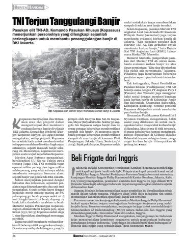 26 BERITAINDONESIA, Februari 2013BERITA HANKAM ZPasukan elit TNI-AD, Komando Pasukan Khusus (Kopassus)menerjunkan personelnya yang dilengkapi sejumlahperlengkapan untuk membantu penanggulangan banjir diDKI Jakarta.opassus menyiapkan dua Detasemen atau 160 prajurit dalammengantisipasi dan membantuevakuasi korban banjir di wilayah DKI Jakarta. Komandan Jenderal (Danjen) Kopassus Mayjen TNI Agus Sutomomengatakan, setiap prajurit Kopassusharus selalu hadir untuk membantu solusisetiap permasalahan di sekitar lingkungansatuannya, seperti masalah banjir sekarang ini. Menurutnya, kegiatan ini merupakan suatu wujud kepedulian Kopassus.Mayjen Agus Sutomo mengatakan,berdasarkan UU No 34 Tahun 2004tentang Tugas TNI, TNI memiliki tugasoperasi militer perang dan tugas militerselain perang, yang salah satunya adalahmembantu mengatasi bencana alam,seperti banjir yang melanda DKI Jakarta.Selain menyiapkan personel dengankekuatan dua detasemen, sejumlah peralatan juga diturunkan yaitu dua unit trukpengangkut, 6 unit perahu karet dengankapasitas mesin masing-masing 40 PK,pelampung 50 buah, pompa sedot air 6unit, tangki bensin 12 buah, dayung 24buah, tali 12 buah dan carabiner 12 buah.Menurut Kepala Penerangan Kopassus,Kapten Ahmad Munir kepada pers, sejakSelasa (15/1/2013) Kopassus sudah siagaI, siap digerakkan, dan tinggal menungguperintah.Kopassus aktif membantu evakuasi korban di beberapa titik yang terkena banjir.Di antaranya wilayah Jatinegara, yang diKTNI Terjun Tanggulangi Banjirpimpin oleh Danyon Ban Sat-81 Kopassus, Mayor (Inf) Akhirudin. Sekitar 56 anggota tim Kopassus satgas banjir dan 20orang petugas kebersihan membersihkansampah sisa banjir. Di antaranya membantu petugas kebersihan membersihkansampah di area banjir di kawasan PluitPenjaringan, Jakarta Utara, Senin (21/1/2013). Sejak pukul 04.00, Kopassus sudahBeli Frigate dari Inggrismulai melakukan tugas membersihkansampah di sekitar area banjir tersebut.Selain Kopassus, pasukan Marinir TNIAngkatan Laut dan Armada RI KawasanWilayah Barat (Armabar) juga terjunmembantu evakuasi korban banjir diJakarta. “Kita siagakan pasukan dariMarinir TNI AL dan Armabar untukmembantu korban banjir,” kata KepalaStaf TNI Angkatan Laut (KSAL) Laksamana Madya TNI Marsetio.Menurut Marsetio, pengerahan pasukan dari Marinir TNI AL untuk membantu evakuasi korban banjir itu atasdasar permintaan. “Kita siap diterjunkanbila sudah ada permintaan,” katanya.Pihaknya juga menyiapkan beberapaperalatan seperti perahu karet dan motorboat.Tak ketinggalan, Pusat PendidikanPasukan Khusus (Pusdikpassus) TNI ADbekerja sama dengan PT Angkasa Pura I(Persero) dan Wanadri juga menggelarbakti sosial dengan memberi bantuanpada korban banjir di Kelurahan Andirdan Baleendah, Kecamatan Baleendah,Kabupaten Bandung. Seratus personilKopassus diterjunkan untuk membantupara korban banjir Komandan Pusdikpassus Kolonel Inf INyoman Cantiasa mengatakan, baktisosial yang dilakukan ini untuk meringankan beban masyarakat korban banjirdi Bandung, khususnya di titik terparah,di mana para korban sampai mengungsi.Baksos dipusatkan di Gedung InkasasBaleendah karena sebagian besar pengungsi korban banjir ditempatkan digedung ini. sanIndonesia melalui Kementerian Pertahanan (Kemhan) berencana membeli tigaunit kapal laut jenis ‘multi role light’ Frigate atau kapal perusak kawal rudal(PKR) dari Inggris. Menteri Pertahanan Purnomo Yusgiantoro usai menerimakunjungan Menhan Inggris Philip Hammond di Kantor Kemhan, Jakarta, Rabu(16/1/2013) mengatakan, pembelian alutsista dari Inggris itu juga diikuti TOT(transfer teknologi) sehingga Indonesia dapat mengembangkan alutsista sejenisdi kemudian hari.Namun, Menhan belum memastikan kapan pembelian itu direalisasikan sebabmasih dalam tahap rencana. Pihaknya akan lebih dulu mengirim tim untukmemastikan dan memeriksa spesifikasi kapal laut tersebut.Purnomo menerima kunjungan kehormatan Menhan Inggris Philip Hammondterkait upaya kedua negara meningkatkan hubungan kerjasama yang sudahterjalin lama. Purnomo menjelaskan, kunjungan ini juga untuk menindaklanjutiMemorandum of Understanding (MOU) antara Indonesia dan Inggris yangditandatangani pada 1 November 2012 di London, Inggris.Menhan Inggris Philip Hammond mengatakan, kunjungannya ke Indonesiajelas mencerminkan komitmen negaranya untuk memperkuat hubunganpertahanan dengan Indonesia. “Kunjungan ini adalah bukti akan hubungan Indonesia dan Inggris yang semakin kuat,” kata Hammond. sanTNI: Kopassus dan Marinir terjun membantu korban banjir di Jakarta