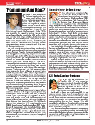 28 BERITAINDONESIA, Februari 2013BERITA TOKOH Z‘Pamimpin Apa Kau?’elama 35 tahun mengabdi diKejaksaan, Edwin Pamimpin Situmorang banyak berkiprah di dualahir di kota kecil Laguboti, Toba Samosir pada 6 Oktober 1952. Iaanak kesembilan dari sepuluh bersaudara, ayahnya seorangpengusaha percetakan dan penerbit buku. Itulah sebabnya, Edwinsejak kecil sudah akrab dengan dunia buku, bahkan sudah mahirmembaca saat masuk ke bangku SD. “Orang masuk SD masihbelajar huruf A, B, saya sudah bisa membaca,“ cerita Edwin kepadaBantu Hotsan dari TokohIndonesia.com.Edwin yang berperansebagai Ketua Panitia Nasional Jubileum 150 tahun HKBP (2009-2011) ini juga hobi bernyanyi.Ada kisah menarik mengenai nama Edwin yang kemudianmenjadi nama panggilannya. Orang tuanya sebenarnya memberiia nama, Pamimpin Perluhutan Situmorang. Sejak kecil ia sudahbiasa dipanggil, Pimpin. Nama panggilannya kemudian berubahlagi menjadi Eppin. Saat ia SMA di Bandung, Eppin kemudiandigantinya menjadi Edfin agar kedengaran lebih keren. Pada saatmau ujian SMA, ia menuliskan nama Edfin Pamimpin. Namun saatmenerima ijazah, huruf ‘f’ berubah menjadi ‘w’. Sejak saat itu,namanyapun berubah dan ia akrab dipanggil dengan nama, Edwin.Bicara soal nama pemberian orang tuanya, Edwin mengakusempat kesal. Namanya itu menjadi bahan ejekan oleh temantemannya. “Pamimpin apa kau,” kata Edwin mengenang olokanteman-temannya itu. Namun belakangan, ia menyadari bahwanama itu menjadi berkat dan patut ia syukuri. Dengan nama itu, iamengaku menjadi mudah diingat dan dikenal di lingkungan kerja,baik saat bertugas ke daerah-daerah pelosok maupun saat tugaspendidikan. “Mana Pamimpin itu,” kira-kira begitu orang bilamencarinya. Di balik nama pemberian sang ayah itu pula, adatitipan doa dan harapan. Orangtuanya berharap, Edwin kelak bisamenjadi pemimpin atau menjadi pejabat tinggi negara. “Saya sudahpedagang, saya pingin anak saya ini menjadi pejabat tinggi,“ ujarEdwin menirukan perkataan ayahnya.Prinsip-prinsip hidup itulah yang mengawal perjalanan karirnyaselama ini. Bahkan ia telah mengukir sejumlah prestasi yangmembanggakan. Dalam usia empat puluh tahun, ia diangkatmenjadi Kepala Kejaksaan Negeri (Kajari) pertama di Makale,Tanah Toraja, Sulawesi Selatan, 1993. Kemudian menjadi AsistenIntelijen Kejaksaan Tinggi Irian Jaya, 1995; Asisten Tindak PidanaKhusus Kejaksaan Tinggi Sumatera Selatan, 1996; Wakil KepalaKejaksaan Tinggi Sulawesi Utara, 1998; Asisten Umum Jaksa AgungRI, 2000; Kepala Kejaksaan Tinggi Kalimantan Barat, 2001; DirekturEkonomi & Keuangan pada Jaksa Agung Muda Intelijen, 2003;Kepala Kejaksaan Tinggi Sumatera Selatan, 2005; Sekretaris JaksaAgung Muda Perdata dan Tata Usaha Negara, 2007; Deputi MenkoPolhukam Bidang Koordinasi Hukum dan HAM, 2008; Jaksa AgungMuda Perdata dan Tata Usaha Negara, 2008; Jaksa Agung MudaIntelijen, 2010. d-tiSbidang, intelijen dan perundang-undangan. Setelah mengemban belasanjabatan dan ditugaskan di berbagaidaerah, karirnya berpuncak sebagaiJaksa Agung Muda Intelijen sejak 2010sampai pensiun 6 Oktober 2012. DiaEmma Pelestari Budaya Betawielama puluhan tahun, Emma Amalia AgusBisri konsisten dalam melestarikan danmengembangkan kebudayaan Betawi. Dari tangannya lahir Lembaga Kebudayaan Betawi (LKB),Persatuan Wanita Betawi (PWB), Ondel-ondel Botho,dan Samcong. Budaya Betawi, seperti busana,kesenian hingga kuliner, yang sebelumnya hanya tampil di pelosok kampung, sekarang sudah akrab dijumpai dimal dan hotel berbintang. Itulah sebabnya, Universitas Indonesiamenilai Emma pantas menerima penghargaan Makara UtamaUniversitas Indonesia bidang Sosial Budaya, sebuah penghargaantertinggi dari UI. Hj. Emma Amalia dinilai konsisten dalammelestarikan dan mengembangkan kebudayaan Betawi mulai dariupacara tradisi, busana, perhiasan, kesenian, hingga kekayaankulinernya. Emma juga menyosialisasikan dan memperkenalkankebudayaan Betawi baik secara lokal, nasional, dan internasionalmelalui pameran, pertunjukan, kerja sama, pengiriman kesenianBetawi ke luar negeri, serta mengisi acara-acara formal kenegaraan.Emma Amalia dididik dalam lingkungan keluarga Betawi yangharmonis dan berpikiran maju. Ayahnya yang bekerja sebagaipengusaha elektronik adalah seorang nasionalis. Pada masapenjajahan Jepang, ayah Emma bersama beberapa kawannyamenjahit Sang Merah Putih secara cuma-cuma untuk dikirim keseluruh Indonesia. Sementara ibunda Emma berasal dari keluargamualim yang cukup terpandang dan disegani.Sejak belia, perempuan kelahiran Jakarta, 24 November 1943 inisudah tertarik dengan seni dan budaya Betawi. Di usia 20-an, Emmamulai mengoleksi benda-benda seni Betawi mulai dari kebaya, kainbatik, dan perhiasan, yang usianya mencapai puluhan bahkan ratusantahun. Kegemarannya mengoleksi benda-benda bernilai seni tinggitersebut terus bertahan sampai Emma berkeluarga. d-tiSr. R. Siti Zuhro, MA, peneliti senior PusatPenelitian Politik - LIPI, sering menyoroti isuSiti Suka Sumber Pertamaisu seputar otonomi daerah, birokrasi, demokrasi lokaldan politik nasional. Menurut doktor bidang ilmupolitik yang juga aktif di The Habibie Center ini,kemajuan Indonesia sangat ditentukan oleh berhasilnya pelaksanaan otonomi daerah.Banyak sudah perubahan yang terjadi setelah lebih dari satudasawarsa kebijakan otonomi daerah itu berjalan, khususnya dalamhubungan pemerintah pusat dan daerah. Dari sekian banyak peneliti,Siti Zuhro memang dikenal lebih banyak melakukan penelitian mengenaiotonomi daerah dan politik lokal. Dunia penelitian yang telah digelutiperempuan kelahiran Blitar, Jawa Timur, 7 November 1959 ini sudahmenjadi bagian dari jati dirinya. Karena itu, meski sangat menguasaiisu-isu demokrasi, politik lokal, otonomi daerah, dan birokrasi, ia taktertarik terjun ke dunia politik praktis.Ketika menjalankan aktivitasnya sebagai periset, perempuan yangakrab disapa Siti ini mengaku paling senang saat terjun ke daerahuntuk berdiskusi dan berinteraksi langsung dengan masyarakat lokaldan pemerintah lokal. Karena dari sana ia bisa mendapatkan dataprimer 