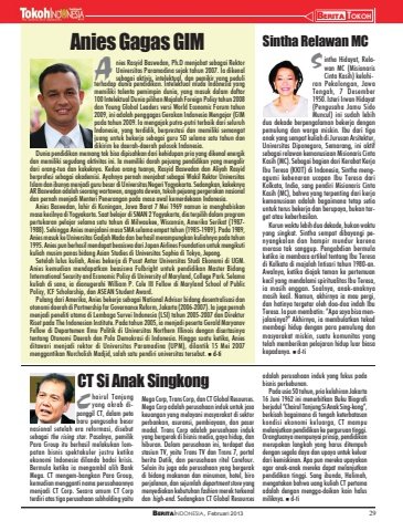 BERITAINDONESIA, Februari 2013 29Y BERITA TOKOHAnies Gagas GIMnies Rasyid Baswedan, Ph.D menjabat sebagai RektorUniversitas Paramadina sejak tahun 2007. Ia dikenalsebagai aktivis, intelektual, dan pemikir yang peduli terhadap dunia pendidikan. Intelektual muda Indonesia yangmemiliki talenta pemimpin dunia, yang masuk dalam daftar100 Intelektual Dunia pilihan Majalah Foreign Policy tahun 2008dan Young Global Leaders versi World Economic Forum tahun2009, ini adalah penggagas Gerakan Indonesia Mengajar (GIMpada tahun 2009. Ia mengajak putra-putri terbaik dari seluruhIndonesia, yang terdidik, berprestasi dan memiliki semangatjuang untuk bekerja sebagai guru SD selama satu tahun dandikirim ke daerah-daerah pelosok Indonesia. Dunia pendidikan memang tak bisa dipisahkan dari kehidupan pria yang dikenal energikdan memiliki segudang aktivitas ini. Ia memiliki darah pejuang pendidikan yang mengalirdari orang-tua dan kakeknya. Kedua orang tuanya, Rasyid Baswedan dan Aliyah Rasyidberprofesi sebagai akademisi. Ayahnya pernah menjabat sebagai Wakil Rektor UniversitasIslam dan ibunya menjadi guru besar di Universitas Negeri Yogyakarta. Sedangkan, kakeknyaAR Baswedan adalah seorang wartawan, anggota dewan, tokoh pejuang pergerakan nasionaldan pernah menjadi Menteri Penerangan pada masa awal kemerdekaan Indonesia.Anies Baswedan, lahir di Kuningan, Jawa Barat 7 Mei 1969 namun ia menghabiskanmasa kecilnya di Yogyakarta. Saat belajar di SMAN 2 Yogyakarta, dia terpilih dalam programpertukaran pelajar selama satu tahun di Milwaukee, Wisconsin, Amerika Serikat (1987-1988). Sehingga Anies menjalani masa SMA selama empat tahun (1985-1989). Pada 1989,Anies masuk ke Universitas Gadjah Mada dan berhasil merampungkan kuliahnya pada tahun1995. Anies pun berhasil mendapat beasiswa dari Japan Airlines Foundation untuk mengikutikuliah musim panas bidang Asian Studies di Universitas Sophia di Tokyo, Jepang.Setelah lulus kuliah, Anies bekerja di Pusat Antar Universitas Studi Ekonomi di UGM.Anies kemudian mendapatkan beasiswa Fulbright untuk pendidikan Master BidangInternational Security and Economic Policy di University of Maryland, College Park. Selamakuliah di sana, ia dianugerahi William P. Cole III Fellow di Maryland School of PublicPolicy, ICF Scholarship, dan ASEAN Student Award.Pulang dari Amerika, Anies bekerja sebagai National Advisor bidang desentralisasi danotonomi daerah di Partnership for Governance Reform, Jakarta (2006-2007). Ia juga pernahmenjadi peneliti utama di Lembaga Survei Indonesia (LSI) tahun 2005-2007 dan DirekturRiset pada The Indonesian Institute. Pada tahun 2005, ia menjadi peserta Gerald MaryanovFellow di Departemen Ilmu Politik di Universitas Northern Illinois dengan disertasinyatentang Otonomi Daerah dan Pola Demokrasi di Indonesia. Hingga suatu ketika, Aniesditawari menjadi rektor di Universitas Paramadina (UPM), dilantik 15 Mei 2007menggantikan Nurcholish Madjid, salah satu pendiri universitas tersebut. d-tiAdua dekade berpengalaman bekerja denganpemulung dan warga miskin. Ibu dari tigaanak yang sempat kuliah di Jurusan Arsitektur,Universitas Diponegoro, Semarang, ini aktifsebagai relawan kemanusiaan Misionaris CintaKasih (MC). Sebagai bagian dari Kerabat KerjaIbu Teresa (KKIT) di Indonesia, Sintha mengagumi kebenaran ucapan Ibu Teresa dariKolkata, India, sang pendiri Misionaris CintaKasih (MC), bahwa yang terpenting dari kerjakemanusiaan adalah bagaimana tetap setiauntuk terus bekerja dan berupaya, bukan target atau keberhasilan.Kurun waktu lebih dua dekade, bukan waktuyang singkat. Sintha sempat dibayangi penyangkalan dan hampir mundur karenamerasa tak sanggup. Pengabdian bermulaketika ia membaca artikel tentang Ibu Teresadi Kolkata di majalah Intisari tahun 1980-an.Awalnya, ketika diajak teman ke pertemuankecil yang mendalami spiritualitas Ibu Teresa,ia masih enggan. Soalnya, anak-anaknyamasih kecil. Namun, akhirnya ia mau pergi,dan hatinya tergetar oleh doa-doa indah IbuTeresa. Ia pun membatin: “Apa saya bisa menjalaninya?” Akhirnya, ia membulatkan tekadmembagi hidup dengan para pemulung danmasyarakat miskin, suatu komunitas yangtelah memberikan pelajaran hidup luar biasakepadanya. d-tiSintha Relawan MCintha Hidayat, Relawan MC (MisionarisCinta Kasih) kelahiran Pekalongan, JawaTengah, 7 Desember1950. Isteri Irwan Hidayat(Pengusaha Jamu SidoMuncul) ini sudah lebihhairul Tanjungyang akrab di- Mega Corp, Trans Corp, dan CT Global Resources.Mega Corp adalah perusahaan induk untuk jasakeuangan yang melayani masyarakat di sektorperbankan, asuransi, pembiayaan, dan pasarmodal. Trans Corp adalah perusahaan indukyang bergerak di bisnis media, gaya hidup, danhiburan. Dalam perusahaan ini, terdapat duastasiun TV, yaitu Trans TV dan Trans 7, portalberita Detik, dan perusahaan ritel Carefour.Selain itu juga ada perusahaan yang bergerakdi bidang makanan dan minuman, hotel, biroperjalanan, dan sejumlah department store yangmenyediakan kebutuhan fashion merek terkenaldan high-end. Sedangkan CT Global ResourcesCT Si Anak Singkong adalah perusahaan induk yang fokus padabisnis perkebunan.Pada usia 50 tahun, pria kelahiran Jakarta16 Juni 1962 ini menerbitkan Buku Biografiberjudul “Chairul Tanjung Si Anak Sing-kong”,berkisah bagaimana di tengah keterbatasankondisi ekonomi keluarga, CT mampumelanjutkan pendidikan ke perguruan tinggi.Orangtuanya mempunyai prinsip, pendidikanmerupakan langkah yang harus ditempuhdengan segala daya dan upaya untuk keluardari kemiskinan. Apa pun mereka upayakanagar anak-anak mereka dapat melanjutkanpendidikan tinggi. Sang ibunda, Halimah,mengatakan bahwa uang kuliah CT pertamaadalah dengan mengga-daikan kain halusmiliknya. d-tiCpanggil CT, dalam petabaru pengusaha besarnasional setelah era reformasi, disebutsebagai the rising star. Pasalnya, pemilikPara Group itu berhasil melakukan lompatan bisnis spektakuler justru ketikaekonomi Indonesia dilanda badai krisis.Bermula ketika ia mengambil alih BankMega. CT mengem-bangkan Para Group,kemudian mengganti nama perusahaannyamen