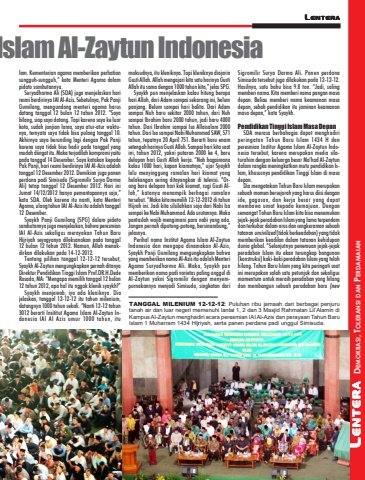 BERITAINDONESIA, Februari 2013 31L ENTERADEMOKRASI, TOLERANSI DAN PERDAMAIANLENTERAL ENTERA31Islam Al-Zaytun IndonesiaSigromilir Surya Darma Ali. Panen perdanaSimisuda tersebut juga dilakukan pada 12-12-12.Hasilnya, satu bahu bisa 9.8 ton. “Jadi, salingmemberi nama. Kita memberi nama pangan masadepan. Beliau memberi nama keamanan masadepan, sebab pendidikan itu jaminan keamananmasa depan,” kata Syaykh.Pendidikan Tinggi Islam Masa DepanSDA merasa berbahagia dapat menghadiriperingatan Tahun Baru Islam 1434 H danperesmian Institur Agama Islam Al-Zaytun Indonesia tersebut, karena merupakan media silaturahim dengan keluarga besar Ma’had Al-Zaytundalam rangka meningkatkan mutu pendidikan Islam, khususnya pendidikan Tinggi Islam di masadepan.Dia mengatakan Tahun Baru Islam merupakansebuah momen bersejarah yang harus diisi denganide, gagasan, dan kerja besar yang dapatmembawa umat kepada kemajuan. Dengansemangat Tahun Baru Islam kita bisa menemukanjejak-jejak peradaban Islam yang lama terpendamdan terkubur dalam arus dan cengkeraman sebuahtatanan uncivilized (tidak berkeadaban) yang tidakmemberikan keadilan dalam tatanan kehidupandunia global. “Selanjutnya penemuan jejak-jejakperadaban Islam itu akan terungkap bangunan(konstruksi) kaki-kaki peradaban Islam yang telahhilang. Tahun Baru Islam yang kita peringati saatini merupakan salah satu petunjuk dan sekaligusmomentum untuk meraih peradaban yang hilangdan membangun sebuah peradaban baru (newlam. Kementerian agama memberikan perhatiansungguh-sungguh,” kata Menteri Agama dalampidato sambutannya.Suryadharma Ali (SDA) juga menjelaskan hariresmi berdirinya IAI Al-Azis. Sebetulnya, Pak PanjiGumilang, mengundang menteri agama harusdatang tanggal 12 bulan 12 tahun 2012. “Sayabilang, siap saya datang. Tapi karena saya ke luarkota, sudah janjian lama, saya atur-atur waktunya, ternyata saya tidak bisa pulang tanggal 10.Akhirnya saya berunding lagi dengan Pak Panjikarena saya tidak bisa hadir pada tanggal yangmudah diingat itu. Maka terjadilah kompromi yaitupada tanggal 14 Desember. Saya katakan kepadaPak Panji, hari resmi berdirinya IAI Al-Azis adalahtanggal 12 Desember 2012. Demikian juga panenperdana padi Simisuda (Sigromilir Surya DarmaAli) tetap tanggal 12 Desember 2012. Hari iniJumat 14/12/2012 hanya pemantapannya saja,”kata SDA. Oleh karena itu nanti, kata MenteriAgama, ulang tahun IAI Al-Azis itu adalah tanggal12 Desember.Syaykh Panji Gumilang (SPG) dalam pidatosambutannya juga menjelaskan, bahwa peresmianIAI Al-Azis sekaligus merayakan Tahun BaruHijriyah seyogyanya dilaksanakan pada tanggal12 bulan 12 tahun 2012. Namun, Allah menakdirkan dilakukan pada 14-12-2012.Tentang pilihan tanggal 12-12-12 tersebut,Syaykh Al-Zaytun mengungkapkan pernah ditanyaDirektur Pendidikan Tinggi Islam Prof.DR.H.DedeRosada, MA: “Mengapa memilih tanggal 12 bulan12 tahun 2012, apa hal itu nggak klenik syaykh?”Syaykh menjawab, iya ada kleniknya. Diajelaskan, tanggal 12-12-12 itu tahun milenium,datangnya 1000 tahun sekali. “Nanti 12-12 tahun3012 berarti Insititut Agama Islam Al-Zaytun Indonesia IAI Al Azis umur 1000 tahun, itumaksudnya, itu kleniknya. Tapi kleniknya diajarinGusti Allah. Allah mengajari kita satu harinya GustiAllah itu sama dengan 1000 tahun kita,” jelas SPG.Syaykh pun menjelaskan kalau hitung berapahari Allah, dari Adam sampai sekarang ini, belumpanjang. Belum sampai hari balita. Dari Adamsampai Nuh baru sekitar 2000 tahun, dari Nuhsampai Ibrahim baru 2000 tahun, jadi baru 4000tahun. Dari Ibrahim sampai Isa Allaisalam 2000tahun. Dari Isa sampai Nabi Muhammad SAW, 571tahun, tepatnya 20 April 751. Berarti baru enamsetengah harinya Gusti Allah. Sampai hari kita saatini, tahun 2012, yakni putaran 2000 ke 4, barudelapan hari Gusti Allah kerja. “Nah bagaimanakalau 1000 hari, kapan kiamatnya,” ujar Syaykhlalu menyinggung ramalan hari kiamat yangbelakangan sering ditayangkan di televisi. “Orang baru delapan hari kok kiamat, rugi Gusti Allah,” katanya menampik berbagai ramalantersebut. “Maka kita memilih 12-12-2012 di tahunHijrah ini. Jadi kita silsilahkan saja dari Nabi Isasampai ke Nabi Muhammad. Ada urutannya. Makapantaslah wajib mengimani para nabi yang ada.Jangan pernah dipotong-potong, bersinambung,”jelasnya.Perihal nama Institut Agama Islam Al-ZaytunIndonesia dan mengapa dinamakan Al-Azis,Syaykh Panji Gumilang mengungkapkan bahwayang memberikan nama Al-Azis itu adalah MenteriAgama Suryadharma Ali. Maka, Syaykh punmemberikan nama padi varietas paling unggul diAl-Zaytun yakni Sigromilir dengan menyempurnakannya menjadi Simisuda, singkatan dariTANGGAL MILENIUM 12-12-12: Puluhan ribu jamaah dari berbagai penjurutanah air dan luar negeri memenuhi lantai 1, 2 dan 3 Masjid Rahmatan Lil’Alamin diKampus Al-Zaytun menghadiri acara peresmian IAI Al-Azis dan perayaan Tahun BaruIslam 1 Muharram 1434 Hijriyah, serta panen perdana padi unggul Simisuda.