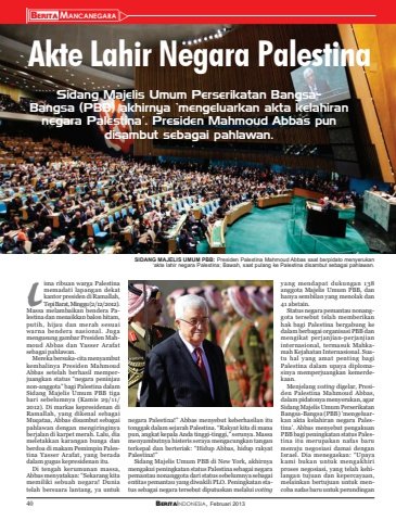 40 BERITAINDONESIA, Februari 2013BERITA MANCANEGARAZima ribuan warga Palestinamemadati lapangan dekatkantor presiden di Ramallah,Tepi Barat, Minggu (2/12/2012).Massa melambaikan bendera Palestina dan menaikkan balon hitam,putih, hijau dan merah sesuaiwarna bendera nasional. Jugamengusung gambar Presiden Mahmoud Abbas dan Yasser Arafatsebagai pahlawan.Mereka bersuka-cita menyambutkembalinya Presiden MahmoudAbbas setelah berhasil memperjuangkan status “negara peninjaunon-anggota” bagi Palestina dalamSidang Majelis Umum PBB tigahari sebelumnya (Kamis 29/11/2012). Di markas kepresidenan diRamallah, yang dikenal sebagaiMuqataa, Abbas disambut sebagaipahlawan dengan mengiringinyaberjalan di karpet merah. Lalu, diameletakkan karangan bunga danberdoa di makam Pemimpin Palestina Yasser Arafat, yang beradadalam gugus kepresidenan itu.Di tengah kerumunan massa,Abbas menyatakan: “Sekarang kitamemiliki sebuah negara! Duniatelah bersuara lantang, ya untukyang mendapat dukungan 138anggota Majelis Umum PBB, danhanya sembilan yang menolak dan41 abstain.Status negara pemantau nonanggota tersebut telah memberikanhak bagi Palestina bergabung kedalam berbagai organisasi PBB danmengikat perjanjian-perjanjianinternasional, termasuk Mahkamah Kejahatan Internasional. Suatu hal yang amat penting bagiPalestina dalam upaya diplomasinya memperjuangkan kemerdekaan.Menjelang voting digelar, Presiden Palestina Mahmoud Abbas,dalam pidatonya menyerukan, agarSidang Majelis Umum PerserikatanBangsa-Bangsa (PBB) ’mengeluarkan akta kelahiran negara Palestina’. Abbas menyebut pengakuanPBB bagi peningkatan status Palestina itu merupakan nafas barumenuju negosiasi damai denganIsrael. Dia menegaskan: “Upayakami bukan untuk mengakhiriproses negosiasi, yang telah kehilangan tujuan dan kepercayaan,melainkan bertujuan untuk mencoba nafas baru untuk perundingannegara Palestina!” Abbas menyebut keberhasilan itutonggak dalam sejarah Palestina. “Rakyat kita di manapun, angkat kepala Anda tinggi-tinggi,” serunya. Massamenyambutnya histeris seraya mengacungkan tanganterkepal dan berteriak: “Hidup Abbas, hidup rakyatPalestina!”Sidang Majelis Umum PBB di New York, akhirnyamengakui peningkatan status Palestina sebagai negarapemantau nonanggota dari status sebelumnya sebagaientitas pemantau yang diwakili PLO. Peningkatan status sebagai negara tersebut diputuskan melalui votingAkte Lahir Negara PalestinaSidang Majelis Umum Perserikatan BangsaBangsa (PBB) akhirnya ‘mengeluarkan akta kelahirannegara Palestina’. Presiden Mahmoud Abbas pundisambut sebagai pahlawan.LSIDANG MAJELIS UMUM PBB: Presiden Palestina Mahmoud Abbas saat berpidato menyerukan‘akte lahir negara Palestina; Bawah, saat pulang ke Palestina disambut sebagai pahlawan.BERITA MANCANEGARA Z