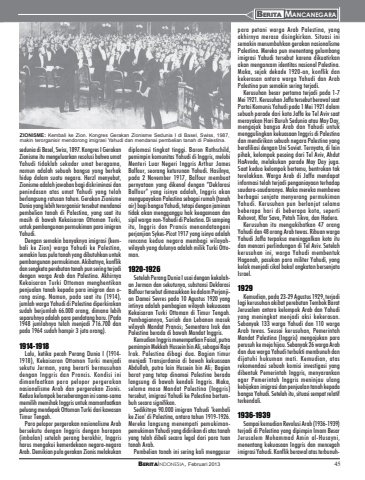 BERITAINDONESIA, Februari 2013 45Y BERITA MANCANEGARAsedunia di Basel, Swiss, 1897. Kongres I GerakanZionisme itu mengeluarkan resolusi bahwa umatYahudi tidaklah sekadar umat beragama,namun adalah sebuah bangsa yang berhakhidup dalam suatu negara. Herzl menyebut,Zionisme adalah jawaban bagi diskriminasi danpenindasan atas umat Yahudi yang telahberlangsung ratusan tahun. Gerakan ZionismeDunia yang lebih terorganisir tersebut mendanaipembelian tanah di Palestina, yang saat itumasih di bawah Kekaisaran Ottoman Turki,untuk pembangunan permukiman para imigranYahudi.Dengan semakin banyaknya imigrasi (kembali ke Zion) warga Yahudi ke Palestina,semakin luas pula tanah yang dibutuhkan untukpembangunan permukiman. Akibatnya, konflikdan sengketa perebutan tanah pun sering terjadidengan warga Arab dan Palestina. AkhirnyaKekaisaran Turki Ottoman menghentikanpenjualan tanah kepada para imigran dan orang asing. Namun, pada saat itu (1914),jumlah warga Yahudi di Palestina diperkirakansudah berjumlah 66.000 orang, dimana lebihseparuhnya adalah para pendatang baru. (Pada1948 jumlahnya telah menjadi 716.700 danpada 1964 sudah hampir 3 juta orang).1914-1918Lalu, ketika pecah Perang Dunia I (1914-1918), Kekaisaran Ottoman Turki menjadisekutu Jerman, yang berarti bermusuhandengan Inggris dan Prancis. Kondisi inidimanfaatkan para pelopor pergerakannasionalisme Arab dan pergerakan Zionis.Kedua kelompok berseberangan ini sama-samamemilih memihak Inggris untuk mamanfaatkanpeluang mendepak Ottoman Turki dari kawasanTimur Tengah.Para pelopor pergerakan nasionalisme Arabbersekutu dengan Inggris dengan harapan(imbalan) setelah perang berakhir, Inggrisharus mengakui kemerdekaan negara-negaraArab. Demikian pula gerakan Zionis melakukandiplomasi tingkat tinggi. Baron Rothschild,pemimpin komunitas Yahudi di Inggris, melobiMenteri Luar Negeri Inggris Arthur JamesBalfour, seorang keturunan Yahudi. Hasilnya,pada 2 November 1917, Balfour membuatpernyataan yang dikenal dengan “DeklarasiBalfour” yang isinya adalah, Inggris akanmengupayakan Palestina sebagai rumah (tanahair) bagi bangsa Yahudi, tetapi dengan jaminantidak akan mengganggu hak keagamaan dansipil warga non-Yahudi di Palestina. Di sampingitu, Inggris dan Prancis menandatanganiperjanjian Sykes-Picot 1917 yang isinya adalahrencana kedua negara membagi wilayahwilayah yang dulunya adalah milik Turki Ottoman.1920-1926Setelah Perang Dunia I usai dengan kekalahan Jerman dan sekutunya, substansi DeklarasiBalfour tersebut dimasukkan ke dalam Perjanjian Damai Sevres pada 10 Agustus 1920 yangintinya adalah pembagian wilayah kekuasaanKekaisaran Turki Ottoman di Timur Tengah.Pembagiannya, Suriah dan Lebanon masukwilayah Mandat Prancis; Sementara Irak danPalestina berada di bawah Mandat Inggris.Kemudian Inggris menempatkan Faisal, putrapemimpin Mekkah Hussein bin Ali, sebagai RajaIrak. Palestina dibagi dua. Bagian timurmenjadi Transjordania di bawah kekuasaanAbdullah, putra lain Hussein bin Ali; Bagianbarat yang tetap dinamai Palestina beradalangsung di bawah kendali Inggris. Maka,selama masa Mandat Palestina (Inggris)tersebut, imigrasi Yahudi ke Palestina bertumbuh secara signifikan.Sedikitnya 90.000 imigran Yahudi ’kembalike Zion’ di Palestina, antara tahun 1919-1926.Mereka langsung menempati pemukimanpemukiman Yahudi yang didirikan di atas tanahyang telah dibeli secara legal dari para tuantanah Arab.Pembelian tanah ini sering kali menggusurpara petani warga Arab Palestina, yangakhirnya merasa disingkirkan. Situasi inisemakin menumbuhkan gerakan nasionalismePalestina. Mereka pun menentang gelombangimigrasi Yahudi tersebut karena dikuatirkanakan mengancam identitas nasional Palestina.Maka, sejak dekade 1920-an, konflik dankekerasan antara warga Yahudi dan ArabPalestina pun semakin sering terjadi.Kerusuhan besar pertama terjadi pada 1-7Mei 1921. Kerusuhan Jaffa tersebut berawal saatPartai Komunis Yahudi pada 1 Mei 1921 dalamsebuah parade dari kota Jaffa ke Tel Aviv saatmerayakan Hari Buruh Sedunia atau May Day,mengajak bangsa Arab dan Yahudi untukmenggulingkan kekuasaan Inggris di Palestinadan mendirikan sebuah negara Palestina yangberafiliasi dengan Uni Soviet. Ternyata, di lainpihak, kelompok pesaing dari Tel Aviv, AhdutHaAvoda, melakukan parade May Day juga.Saat kedua kelompok bertemu, bentrokan takterelakkan. Warga Arab di Jaffa mendapatinformasi telah terjadi penganiayaan terhadapsaudara-saudaranya. Maka mereka membawaberbagai senjata menyerang permukimanYahudi. Kerusuhan pun berlanjut selamabeberapa hari di beberapa kota, sepertiRehovot, Kfar Sava, Petah Tikva, dan Hadera.Kerusuhan itu mengakibatkan 47 orangYahudi dan 48 orang Arab tewas. Ribuan wargaYahudi Jaffa terpaksa meninggalkan kota itudan mencari perlindungan di Tel Aviv. Setelahkerusuhan ini, warga Yahudi membentukHaganah, pasukan para militer Yahudi, yangkelak menjadi cikal bakal angkatan bersenjataIsrael.1929Kemudian, pada 23-29 Agustus 1929, terjadilagi kerusuhan akibat perebutan Tembok BaratJerusalem antara kelompok Arab dan Yahudiyang meningkat menjadi aksi kekerasan.Sebanyak 133 warga Yahudi dan 110 wargaArab tewas. Seusai kerusuhan, PemerintahMandat Palestina (Inggris) mengajukan paraperusuh ke meja hijau. Sebanyak 26 warga Arabdan dua warga Yahudi terbukti membunuh dandijatuhi hukuman mati. Kemudian, atasrekomendasi sebuah komisi investigasi yangdibentuk Pemerintah Inggris, menyarankanagar Pemerintah Inggris meninjau ulangkebijakan imigrasi dan penjualan tanah kepadabangsa Yahudi. Setelah itu, situasi sempat relatifterkendali.1936-1939Sampai kemudian Revolusi Arab (1936-1939)terjadi di Palestina yang dipimpin Imam BesarJerusalem Mohammad Amin al-Husayni,menentang kekuasaan Inggris dan mencegahimigrasi Yahudi. Konflik berawal atas terbunuhZIONISME: Kembali ke Zion. Kongres Gerakan Zionisme Sedunia I di Basel, Swiss, 1987,makin terorganisir mendorong imigrasi Yahudi dan mendanai pembelian tanah di Palestina.