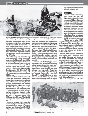 46 BERITAINDONESIA, Februari 2013BERITA MANCANEGARAZnya seorang ulama yang anti-Inggris dan antiZionisme asal Suriah, Izz al-Din al-Qassam,pada November 1935. Dia membekali parapetani dengan latihan militer. Pasukan alQassam ini bentrok dan menewaskan seorangpolisi Inggris pada November 1935. Lalu, polisiInggris memburu dan menewaskan Al-Qassamyang dengan cepat menyulut kemarahan wargaArab di Palestina.Kemarahan warga Arab di Palestina jugadipicu ditemukannya kiriman senjata dalamjumlah besar di pelabuhan Jaffa yang ditujukanuntuk Haganah, pasukan paramiliter Israel. Halini memperkuat dugaan bahwa Israel telahmempersiapkan diri untuk mengambil alihPalestina. Apalagi kala itu (1935), imigrasiYahudi ke Palestina sudah makin meningkat.Diperkirakan antara 1933-1936 sekitar 164.000imigran Yahudi tiba di Palestina. Sehingga pada1936, populasi warga Yahudi telah mencapai370.000 orang.Revolusi Arab tersebut mulai memuncak pada15 April 1936. Saat itu konvoi truk dari Nablusmenuju Tulkarm diserang dan menewaskan duawarga Yahudi. Sehari kemudian, Haganah(kelompok bersenjata Yahudi) balas menyerangdan membunuh dua pekerja Arab di dekatPetah Tikva. Aksi saling serang terus meluasdan para pemimpin Arab menyatakan perang.Pemerintah Inggris berusaha mengatasikeadaan. Atas bantuan Haganah, pasukanInggris di Palestina bisa mengakhiri RevolusiArab pada 1939. Revolusi ini menelan korban5.000 warga Arab, 300 warga Yahudi dan 262polisi Inggris tewas dan lebih 15.000 orang lukaluka.Kemudian penguasa Inggris melakukansejumlah investigasi atas terjadinya pertumpahan darah selama tiga tahun itu. Di antaranya,investigasi yang dilakukan Komisi Peel (1936-1937) yang merekomendasikan agar Palestinadibagi dua, satu bagian untuk bangsa Yahudidan satu bagian lainnya diberikan bagi bangsaArab. Komisi Peel merekomendasi Negara ArabPalestina akan meliputi Transjordania, Yudea,Samaria, Lembah Jordania, dan Negev.Sementara Negara Yahudi meliputi kawasanpantai, Lembah Jezreel, Beit She’an, danGalilea. Para pemimpin Arab dengan tegasmenolak rekomendasi solusi dua negara ini.Sedangkan para pemimpin Yahudi pendapatnyaterbelah, sebagian menyetujui dan sebagian lagimenolak.Kemudian, pada Mei 1939, Inggris kembalimenawarkan solusi satu negara Palestina yangdikenal dengan dokumen White Paper. Dokumen ini pada intinya adalah Inggris mempersiapkan sebuah negara Palestina yang kelakdikelola warga Arab sendiri. Antara lainmengatur kuota jumlah imigran Yahudi yangbisa memasuki Palestina, hanya 75.000 oranghingga 1944. Hanya 10.000 imigran per tahundan bisa menjadi 25.000 orang jika dalamkondisi darurat pengungsi. Selain itu, Inggrisjuga melarang imigran Yahudi membeli tanah dari warga Arab.1939-1945Beberapa saat kemudian, PerangDunia II pecah (1939-1945) yangdiikuti holocaust (pemusnahan massal bangsa Yahudi) di Eropa. Nazi Jermanmenganggap bahwa pengkhianatanYahudi Jerman adalah biang keladikekalahan mereka pada PD I. Makamereka perlu ’penyelesaian terakhir’(endivsung). Ratusan ribu keturunanYahudi dikirim ke kamp konsentrasi.Hal ini memaksa semakin banyakwarga Yahudi yang berupaya meninggalkan Eropa. Untuk itu, para pemimpin Yahudi merancang imigrasiilegal ke berbagai negara, terutamaPalestina. Saat itu, sekitar 100.000orang Yahudi menggunakan 120 kapal mencoba masuk ke Palestina. Namun, Inggris yangtelah memblokade perairan di sekitar Palestinaberhasil menggagalkannya. Para imigrantersebut akhirnya ditahan di kamp pengungsidi Siprus, dan beberapa ribu ditahan diPalestina dan Mauritius.Kemudian dengan kekalahan Jerman dalamPerang Dunia II, sekitar 250.000 orang Yahudiyang tersebar di berbagai kamp konsentrasimilik Jerman, ingin dibawa para pemimpinZionis ke Palestina. Namun, Inggris masihbersikukuh membatasi imigrasi Yahudi kePalestina sesuai mandat White Paper 1939.Tindakan Inggris tersebut membuat Organisasi Zionisme marah. Para pemimpin Zionismetersebut berkumpul di Hotel Biltmore, New Yorkpada 1942. Mereka menganggap Inggrissebagai musuh yang harus diperangi. Berbagaikelompok bersenjata Yahudi seperti Haganah,Irgun dan Lehi bersatu menentang kekuasaanInggris di Mandat Palestina.Kelompok bersenjata Yahudi tersebutREVOLUSI ARAB: Revolusi ini berlangsung selama tiga tahun, mulai memuncak 15 April 1936, menelankorban 5.000 warga Arab, 300 Yahudi, 262 polisi Inggris tewas, dan lebih 15.000 orang luka-luka.TENTARA ISRAEL: Setelah menyerang Semenanjung Sinai dalam perang enam hari, 1967