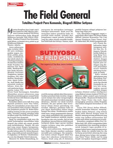 60 BERITAINDONESIA, Februari 2013BERITA BUKU Zantan Pangdam Jaya (1996-1997)dan Gubernur DKI Jakarta (1997-2007) Letnan Jenderal TNI (Purn)Sutiyoso meluncurkan buku BiografiMiliternya berjudul THE FIELD GENERAL, Totalitas Prajurit Para Komando,pada Selasa, 15 Januari 2013, pukul 19.30di Ballroom DjakartaTheater, Jakarta.Acara peluncuranbuku tersebut dihadiri para undanganpejabat negara, jenderal, politisi, pengusaha, cendekiawandan tokoh-tokoh dari berbagai kalangandi antaranya mantanWakil Presiden TrySutrisno dan JusufKalla, Menkopolhukam Djoko Suyanto,Menhan PurnomoYusgiantoro, mantanPanglima TNI JokoSantoso, Hendropriyono, Agum Gumelar, Andi Ghalib dansejumlah jenderallainnya. Acara diawali sambutan ketuapanitia Letjen TNI(Purn) Yusuf Kartanegara. Kemudiandilanjutkan prosesi peluncuran yangditandai penandatanganan sampul bukuberukuran besar oleh Sutiyoso yang akrabdipanggil Bang Yos.Kemudian dalam acara talk show yangdipandu pembawa acara Tina Talisa,Bang Yos menjelaskan proses dan motivasi penerbitan buku tersebut. Dilanjutkan penjelasan penulis Ch. Robin Simanullang tentang isi dan proses penulisanbuku, terutama tentang mengapa bukuini diberi judul The Field General, Totalitas Prajurit Para Komando.Bang Yos menjelaskan sejak 2001 diasudah berkeinginan menerbitkan bukubiografi dan sudah ada empat penulisyang melakukannya. Namun, tak satupun yang sesuai dengan harapannya.Sampai kemudian, dipercayakan kepadapenulis kelima yakni Ch. Robin Simanullang, yang sudah pernah menulis biografi singkatnya di Website TokohIndonesia.com dan Majalah Tokoh Indonesia.Menurut Ch. Robin Simanullang, kepercayaan itu merupakan tantangansekaligus kehormatan. Sejak awal diamenyadari bahwa penulisan buku inipastilah tidak mudah, terbukti daripengalaman empat penulis terdahuluyang dia yakini mereka memiliki kualifikasi lebih baik dari dirinya. Namun, sejakpastilah berguna sebagai pelajaran berharga bagi siapa pun.Lalu, dilanjutkan tanggapan empat orang tokoh yakni Letjen TNI (Purn) SofianEffendi (mantan Komandan Tim UmiOperasi Flamboyan Timor Timur), Prof.Dr. Salim Said, MA, MAIA (pengamat militer), Connie Rahakundini Bakri(pengamat militer) dan Drs. H.Suparto Tjitrodihardjo (kakak sulung Bang Yos).Kemudian, acaradiakhiri denganpenyerahan bukukepada para undangan yang diawali penyerahansecara simbolisoleh Bang Yos kepada 30 tokoh.Buku setebal368 halaman yangditerbitkan Pustaka Tokoh Indonesia dan dicetakGramedia itu, antara lain mengungkap operasiintelijen tempurterbatas (limited combat intelligence)yang dilakoni Letnan Jenderal TNI (Purn)Sutiyoso selaku prajurit para komando(Kopassandha - Kopassus) di KalimantanBarat, Timor Timur dan Aceh. Jugamengungkap perannya selaku PangdamJaya dalam mengatasi kerusuhan 27 Juli1996.Letjen TNI (Purn) Sofian Effendi,mantan komandan Sutiyoso, mengungkapkan bahwa Sutiyoso, yang semasamuda lebih dikenal dengan nama SiBandol, memang seorang pemberani yangselalu siap bahkan menawarkan diriuntuk maju dalam pertempuran tersulit.Sementara, pengamat militer Prof. Dr.Salim Said, MA, MAIA mengatakan bukuini menjelaskan dan menolong pembacauntuk mengerti tugas pasukan di lapangan bukan hanya yang tertuang secaratulisan. Selain itu, melalui buku ini, diaberharap pemerintah sekarang dan yangakan datang harus belajar dari pengalaman Timor Timur. Sebab, saat itu yangterjadi merupakan kepentingan militerThe Field GeneralMTotalitas Prajurit Para Komando, Biografi Militer Sutiyosoawal dia merasa optimis akan bisa menyelesaikan penulisan buku tersebut, dengansyarat mampu dan sabar mengosongkandiri untuk menyelami visi tokoh yang akanditulisnya. Setelah visi tokoh tersebutdiselami, dia pun optimis akan berselancar dalam alunan gelombang visitersebut. Akhirnya, penulisan buku inipun dapat diselesaikan dalam tempohampir dua tahun. Penulisannya sendiritidak lama, tetapi pengumpulan datanyayang cukup melelahkan dan membutuhkan tingkat kesabaran melebihi standarkesabaran rata-rata jurnalis. Hal ini bisadimaklumi, karena Sutiyoso lebih banyakberkiprah dalam tugas operasi intelijentempur terbatas yang tabu publikasibahkan nirdokumen.Pada acara peluncuran, Menkopolhukam Djoko Suyanto memberi sambutanmewakili para undangan. Dia menjelaskan bahwa sebuah biografi tidak bisalepas dari subyeknya (subyektivitas).Namun, kisah yang ada di dalamnya