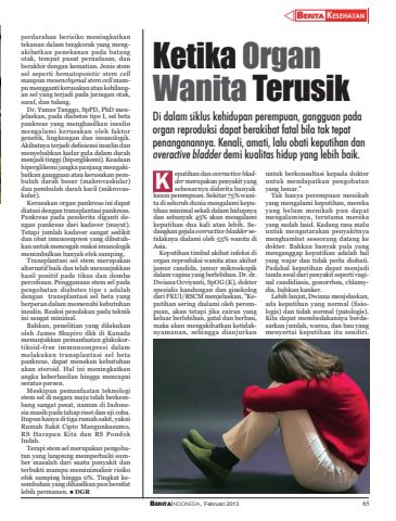 BERITAINDONESIA, Februari 2013 65YBERITA KESEHATANperdarahan berisiko meningkatkantekanan dalam tengkorak yang mengakibatkan penekanan pada batangotak, tempat pusat pernafasan, danberakhir dengan kematian. Jenis stemsel seperti hematopoietic stem cellmaupun mesenchymal stem cell mampu mengganti kerusakan atau kehilangan sel yang terjadi pada jaringan otak,saraf, dan tulang.Dr. Yunus Tanggo, SpPD, PhD menjelaskan, pada diabetes tipe I, sel betapankreas yang menghasilkan insulinmengalami kerusakan oleh faktorgenetik, lingkungan dan imunologik.Akibatnya terjadi defisiensi insulin danmenyebabkan kadar gula dalam darahmenjadi tinggi (hiperglikemi). Keadaanhiperglikemi jangka panjang mengakibatkan gangguan atau kerusakan pembuluh darah besar (makrovaskular)dan pembuluh darah kecil (mikrovaskular).Kerusakan organ pankreas ini dapatdiatasi dengan transplantasi pankreas.Pankreas pada penderita diganti dengan pankreas dari kadaver (mayat).Tetapi jumlah kadaver sangat sedikitdan obat imunosupresi yang dibutuhkan untuk mencegah reaksi imunologikmenimbulkan banyak efek samping.Transplantasi sel stem merupakanalternatif baik dan telah menunjukkanhasil positif pada tikus dan dombapercobaan. Penggunaan stem sel padapengobatan diabetes tipe 1 adalahdengan transplantasi sel beta yangberperan dalam memenuhi kebutuhaninsulin. Reaksi penolakan pada teknikini sangat minimal.Bahkan, penelitian yang dilakukanoleh James Shapiro dkk di Kanadamenunjukkan pemanfaatan glukokortikoid-free immunosupresi dalammelakukan transplantasi sel betapankreas, dapat menekan kebutuhanakan steroid. Hal ini meningkatkanangka keberhasilan hingga mencapaiseratus persen.Meskipun pemanfaatan teknologistem sel di negara maju telah berkembang sangat pesat, namun di Indonesia masih pada tahap riset dan uji coba.Itupun hanya di tiga rumah sakit, yakniRumah Sakit Cipto Mangunkusumo,RS Harapan Kita dan RS PondokIndah.Terapi stem sel merupakan pengobatan yang langsung memperbaiki sumber masalah dari suatu penyakit danterbukti mampu meminimalisir risikoefek samping hingga 0%. Tingkat kesembuhan yang dihasilkan pun bersifatlebih permanen. DGRKetika OrganWanita TerusikDi dalam siklus kehidupan perempuan, gangguan padaorgan reproduksi dapat berakibat fatal bila tak tepatpenanganannya. Kenali, amati, lalu obati keputihan danoveractive bladder demi kualitas hidup yang lebih baik.eputihan dan overactive bladder merupakan penyakit yangsebenarnya diderita banyakkaum perempuan. Sekitar 75% wanita di seluruh dunia mengalami keputihan minimal sekali dalam hidupnyadan sebanyak 45% akan mengalamikeputihan dua kali atau lebih. Sedangkan gejala overactive bladder setidaknya dialami oleh 53% wanita diAsia.Keputihan timbul akibat infeksi diorgan reproduksi wanita atau akibatjamur candida, jamur mikroskopikdalam vagina yang berlebihan. Dr. dr.Dwiana Ocviyanti, SpOG (K), dokterspesialis kandungan dan ginekologdari FKUI/RSCM menjelaskan, \putihan sering dialami oleh perempuan, akan tetapi jika cairan yangkeluar berlebihan, gatal dan berbau,maka akan mengakibatkan ketidaknyamanan, sehingga dianjurkanuntuk berkonsultasi kepada dokteruntuk mendapatkan pengobatanyang benar.\Tak hanya perempuan menikahyang mengalami keputihan, merekayang belum menikah pun dapatmengalaminya, terutama merekayang sudah haid. Kadang rasa maluuntuk mengutarakan penyakitnyamenghambat seseorang datang kedokter. Bahkan banyak pula yangmenganggap keputihan adalah halyang wajar dan tidak perlu diobati.Padahal keputihan dapat menjaditanda awal dari penyakit seperti vaginal candidiasis, gonorrhea, chlamydia, bahkan kanker.Lebih lanjut, Dwiana menjelaskan,ada keputihan yang normal (fisiologis) dan tidak normal (patologis).Kita dapat membedakannya berdasarkan jumlah, warna, dan bau yangmenyertai keputihan itu sendiri.K