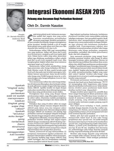 44 BERITAINDONESIA, Maret 2013OPINI EKUIN Zejak krisis global 2008, Indonesia merupakan sedikit dari negara Asia yang secarakonsisten membukukan pertumbuhanekonomi yang tinggi. Struktur pertumbuhan pun semakin berimbang, dengan meningkatnyaperan investasi. Setelah tumbuh 4.5% di tengahkrisis global 2009, pada tahun 2010 dan 2011 laluekonomi kita tumbuh 6.0% dan 6,5%.Perkembangan inflasi IHK juga menunjukkantren yang menurun. Inflasi inti turun dari 6,05%(yoy) di awal 2007, menjadi 4,24% (yoy) pada April2012. Dalam kurun waktu yang sama, penurunaninflasi juga didukung membaiknya inflasi volatilefood dari 12,15% (yoy) menjadi 6,99% (yoy). Kitamengharapkan tingkat inflasi akan terus menurunmencapai target 4±1% pada 2015.Menurunnya inflasi telah memberikan ruangbagi penurunan suku bunga kebijakan (BI Rate).Pada Oktober 2008, BI Rate masih berada padalevel 9,5% dan pada saat ini telah mencapai 5,75%.Dalam tataran operasional, batas bawah koridorsuku bunga atau FASBI bergerak turun ke 3,75%,sama dengan suku bunga kebijakan (reverse reporate) di Filipina.Tren menurunnya inflasi dan suku bunga kebijakan di Indonesia diharapkan akan berlanjut sehingga pada gilirannya sejajar dengan beberapa negarautama ASEAN. Apabila kondisi ini dapat dicapaimaka akan memberikan daya dukung bagi peningkatan daya saing perekonomian secara makro.Peningkatan daya saing yang dicapai dalamperekonomian makro, juga diharapkan terjadi pada sektor mikro, khususnya melalui peningkatandaya saing lembaga keuangan dan dunia usaha diIndonesia.Perbaikan daya saing di sektor mikro ini sangatrelevan dengan adanya rencana integrasi ekonomiASEAN pada tahun 2015 dan integrasi sektorkeuangan pada tahun 2020. Rencana integrasi sektorkeuangan ASEAN ini membawa arti penting bagiperbankan nasional mengingat integrasi keuanganakan dimulai dengan integrasi sektor perbankan.Sebagaimana diketahui, rencana integrasi sektorperbankan tersebut disikapi oleh negara-negaraASEAN dengan membentuk ASEAN Banking Integration Framework (ABIF). Framework ini akanmembuka peluang dan kesempatan bagi perbankannegara-negara ASEAN untuk memperluas wilayahoperasionalnya dan memperluas pasarnya.Namun, framework ini juga mensyaratkan: (i)terciptanya harmonisasi regulasi prudensial, (ii)kesiapan infrastruktur stabilitas sistem keuangan,(iii) capacity building bagi negara ASEAN yangrelatif tertinggal, dan (iv) kesepakatan terhadapkriteria Qualified ASEAN Banks (QAB).Bagi industri perbankan Indonesia, berlakunyaframework tersebut tentu menyediakan peluangsekaligus tantangan. Dari perspektif regulasi, BankIndonesia akan mengantisipasi tantangan inidengan terus menyempurnakan berbagai kebijakan agar efisiensi dan ketahanan perbankansemakin baik. Penyempurnaan regulasi ataukebijakan termasuk penataan struktur suku bungakhususnya suku bunga perbankan, penguatanpermodalan, perbaikan tata kelola (governance)bank, dan lain sebagainya.Saya menaruh perhatian yang sangat besarterhadap penataan struktur suku bunga di sektorkeuangan terutama sektor perbankan. Karena iniakan mendorong mobilisasi dan alokasi dana secaraefisien dan efektif bagi pembiayaan perekonomiansekaligus “pendalaman pasar keuangan domestik”.Beberapa pertanyaan selalu muncul dalam benaksaya. Apakah “tingkat suku bunga” perbankan saatini sudah merepresentasikan tingkat yang wajar(fair value)? Apakah “struktur suku bunga” yangterbentuk (term structure) sudah menggambarkankondisi yang rasional?Pertanyaan-pertanyaan tersebut kurang lebihterjawab dari hasil survei Bank Indonesia1. Surveiini mengungkap tabir bagaimana suku bungadeposito perbankan terbentuk secara ’tidak efisien’karena struktur pasar pendanaan bank (bankfunding market) yang ’oligopolistic’.Dengan struktur pasar seperti itu, pemilik danabesar sangat berpengaruh dalam penentuan sukubunga deposito. Pemilik dana besar tersebut termasuk di antaranya institusi penghimpun danajangka panjang, yang seharusnya melakukaninvestasi pada instrumen jangka panjang sepertipasar obligasi.Dari hasil survei terhadap 71 bank, jumlahnasabah dengan deposito di atas Rp 2 miliar memang hanya 3%. Namun, secara nominal, nasabahyang jumlahnya hanya 3% ini menguasai 62% daritotal nominal deposito perbankan.Sekitar 36% dari total nasabah di 71 bank itumemperoleh imbal hasil di atas suku bungapenjaminan atau ‘special rate’. Ini sudah menjadifenomena laten karena 67 bank (97%) memberikanspecial rate, yang berlangsung sudah cukup lama.Bahkan, 33 bank (47%) memberikan special rate200 bps di atas BI rate. Implikasi dari fenomenaini, perkembangan suku bunga deposito menjadikurang responsif terhadap penurunan BI Rate.Struktur suku bunga deposito yang terbentukpun tampak tidak rasional. Konsep time value ofmoney tidak berlaku. Tidak terdapat perbedaanOleh Dr. Darmin NasutionIntegrasi Ekonomi ASEAN 2015Peluang atau Ancaman Bagi Perbankan NasionalSApakah“tingkat sukubunga”perbankansaat ini sudahmerepresentasikantingkat yangwajar (fairvalue)?Apakah“struktursuku bunga”yangterbentuk(termstructure)sudahmenggambarkan kondisiyangrasional?Penulis:Dr. Darmin Nasution,Gubernur BankIndonesia1 Kajian Bank Indonesia (DPNP) Maret 2012