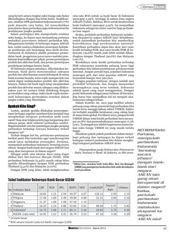 BERITAINDONESIA, Maret 2013 45Y OPINI EKUINyang berarti antara tingkat suku bunga satu bulandibandingkan dengan dua belas bulan. Implikasinya, struktur DPK perbankan terkonsentrasi (77%)pada deposito satu bulan. Ini menyebabkanpenyaluran dana perbankan juga terkonsentrasi kepembiayaan jangka pendek.Selain pentingnya kita memperbaiki struktursuku bunga, ke depan saya memandang perlunyaperbaikan governance industri perbankan kita.Sebagaimana berlaku di beberapa negara ASEANlain, sudah saatnya dilakukan penerapan kebijakan pemberian izin berjenjang atau multi-license.Termasuk di dalamnya adalah penataan permodalan bank, pengaturan governance melalui pembatasan kepemilikan per pihak, proses persetujuanproduk dan aktivitas bank, dan proses persetujuanpembukaan jaringan kantor bank.Di beberapa negara misalnya, diberlakukan ketentuan, bank perlu menyesuaikan cakupanproduk dan aktivitasnya sesuai kelompok di manabank tersebut berada, serta wajib memperoleh izinuntuk dapat melaksanakan produk dan aktivitaslainnya. Dalam hal bank ingin tetap menjalankanproduk dan aktivitas sesuai cakupan yang dilaksanakan saat ini namun tidak didukung denganpermodalan yang cukup, maka bank wajib memenuhi kekurangan permodalan tersebut dalamjangka waktu yang ditentukan.Apakah Kita Siap?Lantas, apakah apabila dilakukan penyempurnaan berbagai regulasi membuat kita menjadi siapmenghadapi integrasi perbankan pada 2020nanti? Siap atau tidaknya kita juga bergantung dariadanya peran aktif industri perbankan sendiri.Bagaimanakah visi dan pandangan jangka panjangperbankan terhadap rencana bisnisnya terkaitintegrasi ini?Terkait dengan hal itu, pertanyaan-pertanyaanberikut patut kita lontarkan agar mendorong kitauntuk terus melakukan retrospeksi. Pertama,mampukah perbankan Indonesia ’bersaing secaraefisien’ dengan bank-bank dari negara ASEAN lainyang akan beroperasi di dalam negeri?Sebagai salah satu ukuran daya saing dapatdilihat dari Net-Interest Margin (NIM). NIMperbankan Indonesia (5,44%) masih cukup lebarapabila dibandingkan dengan NIM perbankanThailand (3,41%) dan Malaysia (2,61%).Dengan NIM yang lebar, tidak mengherankanrata-rata ROA untuk 14 bank besar di Indonesiamencapai 2,46%, tertinggi di antara lima negaraASEAN (Tabel). Bahkan, ROA untuk keseluruhanbank (industri) mencapai 3,03%. Ini menjadikanIndonesia sebagai lucrative market bagi perbankan luar negeri.Kedua, perlukah perbankan Indonesia melakukan ekspansi ke negara ASEAN lain? Sebaliknya,sudah optimalkah perbankan kita memberikankontribusinya bagi perekonomian nasional?Kontribusi perbankan dapat kita ukur dari rasiokredit terhadap PDB, dan rasio kredit/PDB di Indonesia (29,6%) masih jauh lebih rendah dibandingkan dengan Thailand (90,6%) dan Malaysia(116,1%).Rendahnya rasio kredit perbankan terhadapPDB seharusnya membuka peluang besar bagiperbankan kita dalam pembiayaan perekonomiannasional. Jangan pernah lupa, populasi Indonesiamencapai 40% dari total populasi ASEAN yangberjumlah hampir 600 juta jiwa.Dengan populasi terbesar, dengan jumlah usiaproduktif terbanyak, dan dengan masyarakatmenengahnya yang terus tumbuh, Indonesiaadalah pasar yang amat menggiurkan. Denganposisi Indonesia sebagai pasar terbesar di kawasan,kita harus bisa menjadikan hal ini menjadi aset,bukannya sebagai beban.Dalam konteks ini, saya juga melihat adanyapeluang yang cukup potensial bagi perbankan kitauntuk terus menggerakkan sektor UMKM. Sektorini terbukti memiliki ketahanan yang cukup kuatdi masa krisis global. Per Maret 2012, pangsa kreditUMKM dalam total kredit perbankan baru mencapai 20,8%2 dan pertumbuhannya mencapai 17,4%(yoy). Tantangannya adalah bagaimana menurunkan suku bunga UMKM ini yang masih terlalutinggi.Demikian pokok-pokok pemikiran dalam menyikapi peluang dan tantangan ke depan terkaitkesiapan industri perbankan kita dalam menghadapi integrasi perbankan ASEAN 2020.Disampaikan pada Diskusi dan PeluncuranBuku ‘Inovasi 17 Bank’ di Jakarta, 21 Mei 2012.RETROSPEKSI:Pertama,mampukahperbankanIndonesia’bersaingsecaraefisien’dengan bankbank darinegaraASEAN lainyang akanberoperasi didalam negeri?Kedua,perlukahperbankanIndonesiamelakukanekspansi kenegaraASEAN lain?Tabel Indikator Beberapa Bank Besar ASEAN2 Definisi baru: mencakup kredit Usaha Mikro. Kecil, dan Menengah(UMKM) yang penetapannya berdasarkan skala usaha dan kekayaanbersih perusahaan.