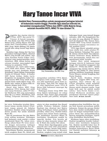 BERITAINDONESIA, Maret 2013 47Y BERITA EKUINseteru ini akan membuat dua dinastipolitik, Prabowo Subianto (kakakHashim) dan Aburizal dari Bakriesaling berhadapan dalam pemilihanpresiden, tahun 2014. Hashim bukanpemain baru dalam bisnis tambang.Dia melakukan investasi Migas diAzerbaijan, Kazakhstan sampai keAmerika Serikat. Pria berusia 58tahun ini akan menyetor jutaan dollar di Bumi jika usulan Nat sukses.Saham Bumi diperdagangkan padaseparuh dari total nilai perusahaanbatubara lainnya, karena salah manajemen dan inkompetensi. MenurutHashim, sengketa yang terjadi telahber 2012. Perkenalan tersebut diprakarsai teman mereka Robert Friedland, taipan minyak AS. Sebulankemudian, Hashim setuju bergabungdalam perahu Nat untuk membeliBumi Plc.Saat itu perseteruan Nat dan BakrieGrup sedang memanas. Hubunganbaik keduanya retak setelah 2 tahunmembentuk Bumi Plc, tahun 2010.Harga saham Bumi Plc terus menurun dengan mencuatnya tudinganmemburuknya manajemen dan manipulasi keuangan Bumi Resources.Keterlibatan Hashim memperparahintrik sengketa Bumi Plc. Boleh jadiengelola dua stasiun televisiTVOne, ANTV dan portal VIVAnews di bawah naunganPT. Visi Media Asia Tbk (VIVA) milikBakrie Grup, sedang diincar oleh rajamedia Hary Tanoesoedibyo, pemilikMNC Grup. Boleh dibilang Visi Mediameraih laba cukup berarti bagi BakrieGrup.Bantahan tegas datang dari big bossperusahaan kelompok Bakrie, AburizalBakrie yang beralih jadi politisi, jugacalon Presiden Partai Golkar 2014.Aburizal yang mempromosikan namainisialnya, ARB, dalam kaitan pencalonan tersebut, menyangkal tegastentang isu penjualan VIVA.“Namanya isu, tentu tidak benar.VIVA tidak akan dijual,” kata ARBkepada pers usai membuka RapatKoordinasi Teknis Bidang PemenanganPemilu di Wilayah Timur, di KantorDPP Partai Golkar, Sabtu (9/2).Sangkalan ini menghalau kabar tentang rencana MNC Grup untuk mengakuisisi bisnis media Bakrie Grup, VisiMedia Asia, emiten di Bursa Efek Indonesia dengan kode VIVA.Sinyal kuat bahwa MNC Grupmengincar VIVA datang dari salahsatu sayap bisnisnya, yakni PT Global Mediacom Tbk yang menyiapkandana Rp 4-5 triliun. Sebaliknya, NeilTobing, Corporate Secretary VIVA,mengatakan andaikan VIVA dijual,harganya tentu sangat tinggi. “Soalnya nilai kapitalisasi pasar kami cukup besar,” kata Neil. Per Jumat (8/2), nilai kapitalisasi pasar VIVA diBursa Efek Indonesia mencapai Rp8,67 triliun.Hubungan bisnis Grup MNC danGrup Bakrie belakangan ini cukupintensif. Hary Tanoe juga pengusahayang beralih jadi politisi, menjalinhubungan bisnis yang intensif denganmitranya, ARB. Dia mengakuisisi bisnis jalan tol yang dikelola PT Bakrieland Development Tbk. Namun Hary,pemilik MNC Grup belum memberikonfirmasi tentang rencananya untuk membeli VIVA.VIVA juga diincar sejumlah perusahaan media lain, salah satunya PT.Elang Mahkota Teknologi Tbk, pemilik stasiun televisi SCTV dan Indosiar.Namun Komisaris Elang Mahkota,Fofo Sariaatmadja, belum bisa mengonfirmasi kabar tersebut.Ambisi Hary untuk menguasaijaringan televisi di Indonesia tetaptinggi. Dia berambisi menguasai duastasiun TV - TVOne dan ANTV - setelahmenguasai tiga stasiun televisi, RCTI,MNC TV dan Global TV. Hary besertagerbong politiknya bergabung denganPartai Hanura setelah hengkang dariPartai Nasdem.David Audy, Direktur GlobalMediacom, anggota MNC Grup, mengatakan, dana sebesar Rp 4-5triliun disiapkan untuk membelimedia. “Itu dana kas internal kami,khusus untuk ekspansi media. Yangkami lirik saat ini adalah mediaonline,” kata David, Kamis (7/2).Global Mediacom membuka opsipendanaan eksternal seperti pinjaman bank. Q Sam JacoebHary Tanoe Incar VIVAAmbisi Hary Tanoesoedibyo untuk menguasai jaringan televisidi Indonesia makin tinggi. Pemilik tiga stasiun televisi ini,berambisi mengakuisisi TVOne dan ANTV milik Bakrie Grup,setelah memiliki RCTI, MNC TV dan Global TV.menghancurkan kredibilitas dan nama baik banyak perusahaan publikIndonesia. Namun dia percaya direksibaru akan mudah membalikkan persepsi ini dengan memperbaiki manajemen Bumi dan mempublikasikanlaporan manipulasi keuangan, sepertiyang dituduhkan Macfarlanes.Meskipun hanya aktor pendukung,Hashim mengklaim koneksi Indonesianya akan membantu kampanyeNat. Hashim memiliki lahan luas disebelah Berau Coal. Untuk mengembangkan kapasitasnya, Berau butuhizin Hashim melintasi lahannya. QSam JacoebPHary Tanoesoedibyo, Bos MNC Grup