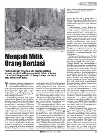 BERITAINDONESIA, Maret 2013 55YBERITA DAERAHMenjadi MilikOrang BerdasiCamat Tarakan Barat meneruskan keBupati Bulungan cq. Badan PertanahanNegara (BPN) Bulungan meneruskan kejenjang lebih tinggi di Provinsi Kalimantan Timur.Pada dasarnya, Pemprov Kaltim memang menyetujui ijin prinsip tersebutsetelah mendapat advis teknis dari Pertamina Kalimantan di Balikpapan danDinas Perkebunan Kaltim. Dan, terhadappermohonan tersebut, Kanwil KehutananKaltim mengeluarkan ijin nomor 5515/KWH/PTGH-3/1991 untuk masa 6 bulan,tanggal 19 Desember 1991. Hanya saja, ijintersebut tidak dapat direalisasikan olehpihak pemohon yang ingin menjadikanperkebunan tanaman kelapa hibrida diareal termohon. Dengan demikian, sebagai konsekuensinya - semua ijin yangdimiliki PT Tarakan Estetika Plaza, bataldemi hukum.Diduga, setelah ada rencana PemkotTarakan beralih dari listrik diesel dan gas,ke listrik tenaga uap berbahan bakar batubara, lokasi yang pernah dimohon oleh PTTarakan Estetika Plaza yang dalam hal iniBudi Kartono diserahkan kepada oknumDan Sat Brimob Tarakan Amustian. Itu,terjadi pada 28 Agustus 2008. Amustianyang berpangkat Letnan Satu ini kemudian menyerahkan lagi kepada oknumAnggota Kesatuan Brimob Tarakan IGusti Ngurah Arnata pada 24 Februari2011. Kemudian, lahan dibagi menjadi 29kapling masing-masing 2 Ha. yang dilegalisir oleh Nurda Gani, mantan KepalaDesa dan Yohanes sebagai mantan ketuaRT Desa Juwata Laut.Selanjutnya, Camat Tarakan UtaraJarkasih, SE menerbitkan SIMTN (SuratIjin Menempati Tanah Negara) untukmasing-masing pemilik pada 20 Desember 2010. Lahan inilah yang kemudiandibebaskan Pemkot Tarakan dengan biayasebesar Rp. 7.437.350.000. Diduga, penyimpangan pembebasan lahan untukpembangunan PLTU di Sungai MayaJuwata Tarakan, merupakan salah satudari sekian lahan yang dibebaskan untukkepentingan pemerintah.Berbagai kalangan di Kota Tarakan berharap agar pembangunan PLTU di SungaiMaya segera dibangun. Paulus Turu, misalnya menghimbau agar Pemerintah segera mencari solusinya. \di lapangan, tolonglah yang membidangisegera menyelesaikan,\nurut anggota Komisi Satu DPRD Tarakan ini, ia kuatir jika pembangunan PLTUberlarut-larut, dana yang sudah dikucurkan sebesar Rp 270 miliar oleh pemerintah pusat ditarik kembali. slp/yuriPerkembangan Kota Tarakan membuat lahankosong menjadi milik para pejabat dalam sekejap.Lokasi pembangunan PLTU Sungai Maya misalnya,satu dari sekian bukti.erik panas matahari tidak mampumengurungkan langkah Tim Investigasi Berita Indonesia untuk mendatangi lokasi rencana pembangunan Pembangkit Listrik Tenaga Uap (PLTU)Sungai Maya, Juwata Laut, Tarakan Utara, Kota Tarakan, Provinsi Kalimantan Timur, beberapa waktu lalu.Sebuah perahu nelayan yang sedangmenebar jaring ikan acuh menyambut kedatangan kami. Tapi, setelah tahu, kamidari majalah Berita Indonesia segera terjalin keakraban. \tepat. Seharusnya waktu air pasang supaya bisa naik ke darat,\warga Juwata Laut. Nelayan yang berusialebih 70 tahun ini sepertinya tahu tujuankami untuk melakukan investigasi lokasiyang menyeret sejumlah pejabat di Pemerintahan Kota (Pemkot) Tarakan masuk bui.Menurut Djamal, masalah lahan, bukanpada persoalan tumpang tindih kepemilikan. Masalah kepemilikan seharusnyadilihat dari sejarah warga Tidung, sebutansuku penduduk asli yang mendiamiTarakan dan pulau-pulau di wilayahpantai Kaltim wilayah Utara. Sebab, namasungai Maya sendiri berasal dari bahasaTidung, yang artinya \dari dulu di daerah itu tidak ada kegiatanseperti orang berkebun kecuali untuktempat memasang bubu atau kelong disepanjang muara sungai - mulai dari sungai Binalantung sampai sungai Maya.\ ini masih hutan nipah dan kayuapi-api tempat bahoi (babi) dan bekantanatau monyet belanda (kera hidung panjang) mencari makan,\Toh, seorang pengusaha Tarakan BudiKartono mengakui lahan seluas 110 Ha diSungai Maya sebagai miliknya. Ini sesuaisurat Nomor 0150/HJH/TK/1990 tanggal 15 September 1990 yang diajukan PTTarakan Estetika Plaza kepada pemerintah. Atas dasar permohonan ini, keluarlahrekomendasi Kepala Desa Juwata Laut,Nurda Gani dengan Nomor 162/KD-JL/06/IX/1990 tanggal 22 September 1990untuk usaha perkebunan kelapa hibrida.Rencana pemilik Tarakan Plaza Hotelitu untuk berkebun di ujung pulau Tarakan disambut baik pemerintah. Buktinya,TLahan di sekitar Sungai Maya, Juwata Laut,Tarakan Utara, Kota Tarakan, ProvinsiKalimantan Timur