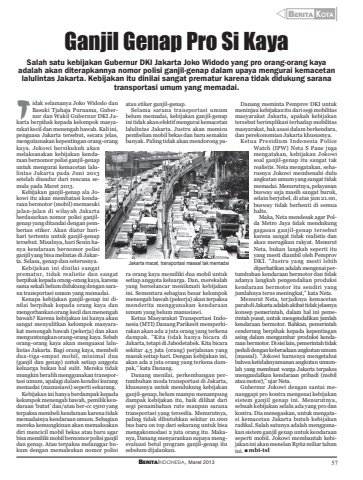 BERITAINDONESIA, Maret 2013 57Y BERITA KOTAGanjil Genap Pro Si Kayaidak selamanya Joko Widodo danBasuki Tjahaja Purnama, Gubernur dan Wakil Gubernur DKI Jakarta berpihak kepada kelompok masyarakat kecil dan menengah bawah. Kali ini,penguasa Jakarta tersebut, secara jelas,mengutamakan kepentingan orang-orangkaya. Jokowi bersikukuh akanmelaksanakan kebijakan kendaraan bernomor polisi ganjil-genapuntuk mengurai kemacetan lalulintas Jakarta pada Juni 2013setelah diundur dari rencana semula pada Maret 2013.Kebijakan ganjil-genap ala Jokowi itu akan membatasi kendaraan bermotor (mobil) memasukijalan-jalan di wilayah Jakartaberdasarkan nomor polisi ganjilgenap yang ditandai dengan pemberian stiker. Akan diatur harihari tertentu untuk ganjil-genaptersebut. Misalnya, hari Senin hanya kendaraan bernomor polisiganjil yang bisa melintas di Jakarta. Selasa, genap dan seterusnya.Kebijakan ini dinilai sangatprematur, tidak realistis dan sangatberpihak kepada orang-orang kaya, karenasama sekali belum didukung dengan sarana transportasi umum yang memadai.Kenapa kebijakan ganjil-genap ini dinilai berpihak kepada orang kaya danmengorbankan orang kecil dan menengahbawah? Karena kebijakan ini hanya akansangat menyulitkan kelompok masyarakat menengah bawah (pekerja) dan akanmenguntungkan orang-orang kaya. Sebaborang-orang kaya akan menguasai lalulintas Jakarta. Bagi orang kaya, membelidua-tiga-empat mobil, minimal dua(ganjil dan genap) untuk setiap anggotakeluarga bukan hal sulit. Mereka tidakmungkin beralih menggunakan transportasi umum, apalagi dalam kondisi kurangmemadai (manusiawi) seperti sekarang.Kebijakan ini hanya berdampak kepadakelompok menengah bawah, pemilik kendaraan ‘butut’ dan/atau ber-cc 1500 yangterpaksa membeli kendaraan karena tidakmemadainya kendaraan umum. Sebagianmereka kemungkinan akan memaksakandiri mencicil mobil bekas atau baru agarbisa memiliki mobil bernomor polisi ganjildan genap. Atau terpaksa melanggar hukum dengan memalsukan nomor polisiatau stiker ganjil-genap.Selama sarana transportasi umumbelum memadai, kebijakan ganjil-genapini tidak akan efektif mengurai kemacetanlalulintas Jakarta. Justru akan memicupembelian mobil bekas dan baru semakinbanyak. Paling tidak akan mendorong para orang kaya memiliki dua mobil untuksetiap anggota keluarga. Dan, merekalahyang berselancar menikmati kebijakanini. Sementara sebagian besar kelompokmenengah bawah (pekerja) akan terpaksamenderita menggunakan kendaraanumum yang belum manusiawi.Ketua Masyarakat Transportasi Indonesia (MTI) Danang Parikesit memperkirakan akan ada 2 juta orang yang terkenadampak. ”Kita tidak hanya bicara diJakarta, tetapi di Jabodetabek. Kita bicarasekitar 4,5 juta (orang) perjalanan yangmasuk setiap hari. Dengan kebijakan ini,akan ada 2 juta orang yang terkena dampak,” kata Danang.Danang menilai, perkembangan pertumbuhan moda transportasi di Jakarta,khususnya untuk mendukung kebijakanganjil-genap, belum mampu menampungdampak kebijakan itu, baik dilihat darisegi penambahan rute maupun saranatransportasi yang tersedia. Menurutnya,paling tidak dibutuhkan sekitar 10.000bus baru on top dari sekarang untuk bisamengakomodasi 2 juta orang itu. Makanya, Danang menyarankan supaya mengevaluasi betul program ganjil-genap itusebelum dijalankan.Danang meminta Pemprov DKI untukmeninjau kebijakan itu dari segi mobilitasmasyarakat Jakarta, apakah kebijakantersebut berimplikasi terhadap mobilitasmasyarakat, hak asasi dalam berkendara,dan perekonomian Jakarta khususnya.Ketua Presidium Indonesia PoliceWatch (IPW) Neta S Pane jugamengatakan, kebijakan Jokowisoal ganjil-genap itu sangat takrealistis. Neta mengatakan, seharusnya Jokowi membenahi duluangkutan umum yang sangat tidakmemadai. Menurutnya, pelayananbusway saja masih sangat buruk,selain berjubel, di atas jam 21.00,busway tidak berhenti di semuahalte.Maka, Neta mendesak agar Polda Metro Jaya tidak mendukunggagasan ganjil-genap tersebutkarena sangat tidak realistis danakan merugikan rakyat. MenurutNeta, bukan langkah seperti ituyang mesti diambil oleh PemprovDKI. “Justru yang mesti lebihdiperhatikan adalah mengenai pertumbuhan kendaraan bermotor dan tidakadanya langkah pengendalian produksikendaraan bermotor itu sendiri yangjumlahnya terus meningkat,” kata Neta.Menurut Neta, terjadinya kemacetanparah di Jakarta adalah akibat tidak jelasnyakonsep pemerintah, dalam hal ini pemerintah pusat, untuk mengendalikan jumlahkendaraan bermotor. Bahkan, pemerintahcenderung berpihak kepada kepentinganasing dalam mengumbar produksi kendaraan bermotor. Di sisi lain, pemerintah tidakpeduli dengan keberadaan angkutan umum(massal). “Jokowi harusnya mengetahuibahwa ketidaknyamanan angkutan umumlah yang membuat warga Jakarta terpaksamengandalkan kendaraan pribadi (mobilatau motor),” ujar Neta.Gubernur Jokowi dengan santai menanggapi pro kontra mengenai kebijakansistem ganjil genap ini. Menurutnya,sebuah kebijakan selalu ada yang pro dankontra. Dia menegaskan, untuk mengatasi kemacetan Jakarta butuh kebijakanradikal. Salah satunya adalah menggunakan sistem ganjil genap untuk kendaraanseperti mobil. Jokowi membantah kebijakan ini akan menelan Rp62 miliar tahunini. Q mbi-tslTSalah satu kebijakan Gubernur DKI Jakarta Joko Widodo yang pro orang-orang kayaadalah akan diterapkannya nomor polisi ganjil-genap dalam upaya mengurai kemacetanlalulintas Jakarta. Kebijakan itu dinilai sangat prematur karena tidak didukung saranatransportasi umum yang memadai.Jakarta macet, transportasi massal tak memadai
