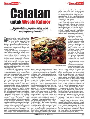 YBERITA WISATABERITAINDONESIA, Maret 2013 59BERITA WISATAZCatatanuntuk Wisata KulinerBeragam kuliner nusantara belum seriusdieksplorasi untuk dijadikan promosi pariwisatamaupun produk pariwisata.World\ran-restoran Thailand di berbagai negaradi dunia makin banyak bermunculan.Sehingga, walau tak ke Thailand, orangorang seluruh dunia dapat merasakanmasakan Thailand.Oleh sebab itu, untuk menghindarihilangnya khazanah kuliner nusantara, Kementerian Pariwisata danEkonomi Kreatif (kemenparekraf)membentuk Kelompok Kerja yang melibatkan 40 orang terdiri dari pencintakuliner, ahli kuliner dan pebisnis kuliner. Setelah bekerja sekitar empatbulan, pokja menetapkan 30 ikon kuliner yang terdiri atas makanan danminuman khas Indonesia, mulai darimakanan pembuka, menu utama,hidangan penutup hingga kudapan.Makanan yang menjadi ikon Indonesia mempertimbangkan tasty (rasa),healthy (sehat), dan beauty (menarik).Artinya, tidak hanya menonjolkan sisirasa enak saja, melainkan juga aspeknutrisi dan penyajiannya. Nasi Tumpeng misalnya dipilih sebagai andalanikon kuliner tradisional Indonesia dengan beberapa pertimbangan, diantaranya mempunyai dasar filosofi Indonesia yang kuat serta mempresentasikan budaya makan orang Indonesia, memiliki tampilan yang menarik,mudah dibuat di luar negeri dan dapatdijadikan sebagai menu wajib restoranIndonesia di luar negeri.Sedangkan 29 ikon lainnya adalahAyam Panggang Bumbu Rujak Yogyakarta, Gado-gado Jakarta, Nasi GorengKampung, Serabi Bandung, SarikayoMinangkabau, Es Dawet Ayu Banjarnegara, Urap Sayuran Jogjakarta, SayurNangka Kapau, Lumpia Semarang,Nagasari Jogjakarta, Kue Lumpur Jakarta, Soto Ayam Lamongan, Rawon Surabaya, Asinan Jakarta,Sate Ayam Madura.Berikutnya Sate Maranggi Purwakarta, Klappertaart Manado, TahuTelur Surabaya, SateLilit Bali, Rendang Padang, Orak-arik BuncisSolo, Pindang Patin Palembang, Asam PadehTongkol Padang, Nasi Liwet Solo, Es Bir PletokJakarta, Kolak PisangUbi Bandung, Ayam Goreng Lengkuas Bandung,Laksa Bogor, dan KunyitAsam Solo.Kemenparekraf menginginkan semua acaraIndonesia dan semua restoran Indonesia di luarnegeri mengembangkan30 ikon kuliner tersebut. Misalnya dengan menyajikan makanan Indonesiadalam Internationale Tourismus-BorseBerlin (ITB Berlin) pada 6-10 Maret diBerlin. Dalam salah satu menu jamuanmakan malam yang dihadiri oleh pelakupariwisata dunia itu disajikan rendangSumatera Barat. Sebelumnya, ke-30ikon kuliner tradisional itu sudahhadir dalam acara Patali (Market)Day di The Dharmawangsa Hotel,Jakarta, akhir Februari 2013 lalu.Rencananya, jumlah ikon kulineryang sudah ditetapkan oleh Kemenparekraf bekerja sama dengan stakeholder kuliner itu masih akan terusbertambah. Kemenparekraf merencanakan Tinutuan atau Bubur Manado,Sulawesi Utara, masuk sebagai ikonkuliner tradisional Indonesia.Langkah yang diambil oleh Kemenparekraf ini mendapat sambutan positifdari stakeholder kuliner. Mereka berharapwisata kuliner nusantara lebih serius digarap karena termasuk wisata yang paling siap berkembang di Indonesia. Selainitu, wisata kuliner berpotensi menghidupkan ekonomi kerakyatan. Q niragi mereka yang hobi makan/jajan, ketika mendengar kata\ maka yang melintaspertama kali di pikiran pastilah \Kuliner\mereka akan mencari tempat makanatau restoran yang terkenal dengan makanan enaknya.Kegiatan berwisata kuliner pastilahtiada habisnya. Pasalnya, kuliner Indonesia sangat beragam. Tiap daerah mempunyai menu masakan tersendiri danpunya ciri khas. Namun sayang, belumbanyak kuliner tradisional Indonesiayang terekspos dengan baik. Di kota-kotabesar seperti Jakarta, kita sudah terbiasamenjumpai masakan-masakan Padang,Manado dan Makassar. Namun masakanasal daerah lain misalkan Bali, masihterhitung oleh jari.Soal destinasi wisata kuliner pun, belum semua daerah di Indonesia mengembangkannya secara serius. Sejumlah daerah yang sudah akrab bagi wisatawankuliner adalah kota Yogyakarta, DIYogyakarta ; Medan, Sumatera Utara ;Bandung, Jawa Barat ; Padang danBukittinggi, Sumatera Barat ; Bogor,Jawa Barat ; dan Malang, Jawa Timur.Kota Bandung misalnya, sejak 1941,sudah diposisikan sebagai sentra kulinernusantara karena memiliki jumlah rumah makan terbanyak di seluruh Indonesia. Beberapa produk makanan yang sudah terkenal antara lain Brownies Amanda, Pisang Molen Kartika Sari, YoghurtCikapayang, Bumbu Desa, dan lain-lain.Sedangkan dari segi promosi pariwisatamaupun produk pariwisata, kulinermasih disepelekan. Padahal, negara lainsudah berupaya menciptakan imagemasakan nasional. Singapura, misalnya,telah menetapkan laksa sebagai masakannasional. Tempe, rendang, dan nasi goreng telah menjadi hak paten Malaysia.Negara Thailand sudah membuat program promosi pariwisata melalui pendekatan kuliner, yaitu \BMenu kuliner Jawa