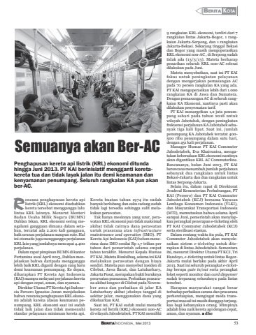 BERITAINDONESIA, Mei 2013 53Y BERITA KOTAencana penghapusan kereta apilistrik (KRL) ekonomi disebabkankereta tersebut mengganggu lalulintas KRL lainnya. Menurut MenteriBadan Usaha Milik Negara (BUMN)Dahlan Iskan, KRL ekonomi sering mengalami gangguan dimana dalam setahun, tercatat ada 2.200 kali gangguan,baik urusan perjalanan maupun rute. Halini otomatis juga mengganggu perjalananKRL lain yang jumlahnya mencapai 4.400perjalanan.Dalam rapat pimpinan BUMN di kantorPertamina awal April 2013, Dahlan menjelaskan bahwa daripada mengganggulebih baik KRL diganti dengan yang barudemi keamanan penumpang. Ke depan,diharapkan PT Kereta Api Indonesia(KAI) mampu melayani perjalanan keretaapi dengan cepat, aman, dan nyaman.Direktur Utama PT Kereta Api Indonesia Persero Ignasius Jonan menjelaskanbahwa rencana penghapusan KRL ekonomi adalah karena alasan keamanan penumpang. KRL ekonomi saat ini sudahtidak laik jalan dan tidak memenuhistandar pelayanan minimum kereta api.Kereta buatan tahun 1974 itu sudahbanyak berlubang dan suku cadang sudahtidak lagi tersedia sehingga sulit melakukan perawatan.Tak hanya mesinnya yang uzur, perawatan KRL ekonomi pun tidak maksimalakibat tidak cairnya dana perawatanuntuk prasarana atau infrastructuremaintenance and operation (IMO). PTKereta Api Indonesia (KAI) belum menerima dana IMO senilai Rp 1,7 triliun pertahun dari pemerintah selama empattahun terakhir. Menurut Kepala HumasPT KAI, Mateta Rizalulhaq, selama ini KAImelakukan perawatan dengan biayasendiri. Mateta pun menyebut insiden diCilebut, Jawa Barat, dan Latuharhary,Jakarta Pusat, merupakan bukti buruknyaperawatan prasarana. Perbaikan prasarana akibat longsor di Cilebut pada November 2012 dan perbaikan di jalur KALatuharhary akibat jebolnya tanggul disekitar jalur, menggunakan dana yangdikeluarkan KAI.Saat ini, PT KAI sudah mulai menarikkereta rel listrik (KRL) ekonomi non-ACdi wilayah Jabodetabek. PT KAI memilikiSemuanya akan Ber-ACPenghapusan kereta api listrik (KRL) ekonomi ditundahingga Juni 2013. PT KAI berinisiatif mengganti keretakereta tua dan tidak layak jalan itu demi keamanan dankenyamanan penumpang. Seluruh rangkaian KA pun akanber-AC.9 rangkaian KRL ekonomi, terdiri dari 7rangkaian lintas Jakarta-Bogor, 1 rangkaian Jakarta-Serpong, dan 1 rangkaianJakarta-Bekasi. Sekarang tinggal Bekasidan Bogor yang masih mengoperasikanKRL ekonomi non-AC , di Serpong sudahtidak ada (13/3/13). Mateta berharappenarikan seluruh KRL non-AC selesaidilakukan pada Juni.Mateta menyebutkan, saat ini PT KAIfokus untuk peningkatan pelayanandengan mengerjakan pemasangan ACpada 70 persen rangkaian KA yang ada.PT KAI mengoperasikan lebih dari 1.000rangkaian KA di Jawa dan Sumatera.Dengan pemasangan AC di seluruh rangkaian KA Ekonomi, nantinya pasti akandilakukan penyesuaian tarif.PT KAI menargetkan 1,2 juta penumpang sehari pada tahun 2018 untukwilayah Jabotabek, dengan peningkatanfrekuensi perjalanan KA Jabotabek sebanyak tiga kali lipat. Saat ini, jumlahpenumpang KA Jabotabek tercatat 400-500 ribu penumpang dalam satu hari,dengan 451 kali perjalanan.Manager Humas PT KAI CommuterJabodetabek, Eva Khairunisa, mengatakan keberadaan KRL ekonomi nantinyaakan digantikan KRL AC Commuterline.Rencananya, bulan Juni 2013, PT KAIberencana menambah jumlah perjalanansebanyak dua rangkaian untuk lintasBekasi-Jakarta dan dua rangkaian untuklintas Serpong-Jakarta.Selain itu, dalam rapat di DirektoratJenderal Kementerian Perhubungan, PTKAI (Persero) dan PT KAI CommuterJabodetabek (KCJ) bersama YayasanLembaga Konsumen Indonesia (YLKI),dan Masyarakat Transportasi Indonesia(MTI), memutuskan bahwa selama Aprilsampai Juni, pemerintah akan menyiapkan perangkat penerapan e-ticketing olehPT KAI Commuter Jabodetabek (KCJ)serta sterilisasi stasiun.Dalam rentang waktu itu pula, PT KAICommuter Jabodetabek akan menyelesaikan sistem e-ticketing untuk diterapkan di lintas Jabodetabek. Sementaraitu, menurut Direktur Utama PT KCJ, TriHandoyo, e-ticketing untuk lintas BogorJakarta mulai berlaku pada akhir April2013. Saat ini seluruh perangkat e-ticketing berupa gate in/out serta perangkatloket seperti monitor dan card dispensersudah terpasang seluruhnya pada lintastersebut.Harapan masyarakat sangat besarterhadap perbaikan sarana dan prasaranaperkeretaapian, mengingat moda transportasi massal ini masih dianggap terjangkau bagi kebanyakan orang. Mimpinyaadalah bisa naik kereta api dengan cepat,aman, dan nyaman. Q dheR