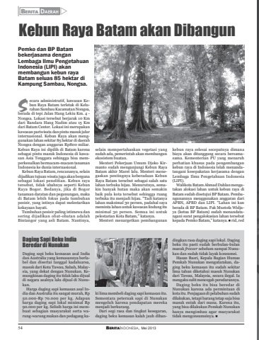 54 BERITAINDONESIA, Mei 2013BERITA DAERAHZKebun Raya Batam akan DibangunDaging Sapi Beku IndiaBeredar di NunukanPemko dan BP Batambekerjasama denganLembaga Ilmu PengetahuanIndonesia (LIPI) akanmembangun kebun rayaBatam seluas 85 hektar diKampung Sambau, Nongsa.selain mempertahankan vegetasi yangsudah ada, pemerintah akan membangunekosistem buatan.Menteri Pekerjaan Umum Djoko Kirmanto sudah mengunjungi Kebun RayaBatam akhir Maret lalu. Menteri menegaskan pentingnya keberadaan KebunRaya Batam tersebut sebagai salah satulahan terbuka hijau. Menurutnya, semakin banyak hutan maka akan semakinbaik pula kota tersebut sehingga ruangterbuka itu menjadi hijau. \lahan maksimal 30 persen, padahal sayameminta lahan untuk kawasan lindung ituminimal 30 persen. Semua ini untukpelestarian Kota Batam,\Menteri menargetkan pembangunanecara administratif, kawasan Kebun Raya Batam terletak di Kelurahan Sambau Kacamatan Nongsa,berada di tepi Jalan Hang Lekiu Km. 4 -Nongsa. Lokasi tersebut berjarak 10 Kmdari Bandara Hang Nadim atau 15 Kmdari Batam Center. Lokasi ini merupakankawasan pariwisata dan pintu masuk jalurinternasional. Kebun Raya akan menggunakan lahan sekitar 85 hektar di daerahNongsa dengan anggaran Rp800 miliar.Kebun Raya ini dipilih di Batam karenasebagai pintu masuk Indonesia di kawasan Asia Tenggara sehingga bisa memperkenalkan bermacam-macam tanamanIndonesia ke dunia internasional.Kebun Raya Batam, rencananya, selaindijadikan tujuan wisata juga akan bergunasebagai lokasi penelitian. Kebun rayatersebut, tidak ubahnya seperti KebunRaya Bogor. Bedanya, jika di Bogortanaman daratan dan pegunungan, makadi Batam lebih fokus pada tumbuhanpesisir, yang intinya dapat melestarikankekayaan hayati.Tumbuhan pesisir paling istimewa dansering dijadikan obat-obatan adalahBintangor yang asli Batam. Nantinya,kebun raya selesai secepatnya dimanabiaya akan ditanggung secara bersamasama. Kementerian PU yang menaruhperhatian khusus pada pengembangankebun raya di Indonesia telah menandatangani kesepakatan kerjasama denganLembaga Ilmu Pengetahuan Indonesia(LIPI).Walikota Batam Ahmad Dahlan mengatakan alokasi lahan untuk kebun raya diBatam sudah disetujui BP Batam. Pembangunannya menggunakan anggaran dariAPBN, APBD dan LIPI. \berada di BP Batam. Pak Mustofa Widjaya (ketua BP Batam) sudah menandatangani surat pengalokasian lahan tersebutkepada Pemko Batam,\ki lima membeli daging sapi kemasan itu.Sementara peternak sapi di Nunukanmengeluh karena pendapatan merekamenjadi berkurang.Dari segi rasa dan tingkat kesegaran,daging beku kemasan kalah jauh dibandingkan rasa daging sapi lokal. Dagingbeku itu pasti sudah berbulan-bulanmasuk freezer sebelum sampai Nunukan dan sudah tidak layak konsumsi.Hasan Basri, Kepala Bagian HumasPemkab Nunukan mengutarakan, daging beku kemasan itu sudah sekitarlima tahun diketahui masuk Nunukandari Tawau, Malaysia, secara ilegal. Iamengaku sulit mencegah peredarannya.Daging beku itu bisa beredar diNunukan karena ada permintaan dikota itu. Penjagaan di pelabuhan sudahdilakukan, tetapi barang tetap saja bisamasuk entah dari mana. Karena itu,yang bisa dilakukan Pemkab Nunukanhanya mengimbau agar masyarakattidak mengonsumsinya. „SDaging sapi beku kemasan asal Indiadan Australia yang kemasannya berlabel dan disertai tanggal kadaluarsa,masuk dari Kota Tawau, Sabah, Malaysia, yang dekat dengan Nunukan. Kemungkinan daging itu tidak laku dijualdi negara asalnya lalu dijual di Nunukan.Harga daging sapi kemasan asal India dan Australia itu sangat murah, Rp50.000-Rp 70.000 per kg. Adapunharga daging sapi lokal minimal Rp90.000 per kg. Selisih harga ini membuat sebagian masyarakat serta warung-warung makan dan pedagang ka-