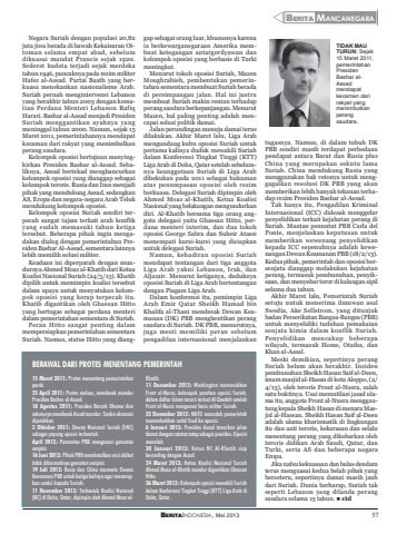 BERITAINDONESIA, Mei 2013 57YBERITA MANCANEGARANegara Suriah dengan populasi 20,82juta jiwa berada di bawah Kekaisaran Ottoman selama empat abad, sebelumdikuasai mandat Prancis sejak 1920.Sederet kudeta terjadi sejak merdekatahun 1946, puncaknya pada rezim militerHafez al-Assad. Partai Baath yang berkuasa menekankan nasionalisme Arab.Suriah pernah mengintervensi Lebanonyang berakhir tahun 2005 dengan kematian Perdana Menteri Lebanon RafiqHarari. Bashar al-Assad menjadi PresidenSuriah menggantikan ayahnya yangmeninggal tahun 2000. Namun, sejak 15Maret 2011, pemerintahannya mendapatkecaman dari rakyat yang menimbulkanperang saudara.Kelompok oposisi bertujuan menyingkirkan Presiden Bashar al-Assad. Sebaliknya, Assad bertekad menghancurkankelompok oposisi yang dianggap sebagaikelompok teroris. Rusia dan Iran menjadipihak yang mendukung Assad, sedangkanAS, Eropa dan negara-negara Arab Telukmendukung kelompok oposisi.Kelompok oposisi Suriah sendiri terpecah sangat tajam terkait arah konflikyang sudah memasuki tahun ketigatersebut. Beberapa pihak ingin mengadakan dialog dengan pemerintahan Presiden Bashar Al-Assad, sementara lainnyalebih memilih solusi militer.Keadaan ini diperparah dengan mundurnya Ahmed Moaz al-Khatib dari KetuaKoalisi Nasional Suriah (24/3/13). Khatibdipilih untuk memimpin koalisi tersebutdalam upaya untuk menyatukan kelompok oposisi yang kerap terpecah itu.Khatib digantikan oleh Ghassan Hittoyang bertugas sebagai perdana menteridalam pemerintahan sementara di Suriah.Peran Hitto sangat penting dalammempersiapkan pemerintahan sementaraSuriah. Namun, status Hitto yang dianggap sebagai orang luar, khususnya karenaia berkewarganegaraan Amerika membuat ketegangan antargerilyawan dankelompok oposisi yang berbasis di Turkimeningkat.Menurut tokoh oposisi Suriah, MazenMoughrabieh, pembentukan pemerintahan sementara membuat Suriah beradadi persimpangan jalan. Hal ini justrumembuat Suriah makin rentan terhadapperang saudara berkepanjangan. MenurutMazen, hal paling penting adalah mencapai solusi politik damai.Jalan perundingan menuju damai terusdilakukan. Akhir Maret lalu, Liga Arabmengundang kubu oposisi Suriah untukpertama kalinya duduk mewakili Suriahdalam Konferensi Tingkat Tinggi (KTT)Liga Arab di Doha, Qatar setelah sebelumnya keanggotaan Suriah di Liga Arabdibekukan pada 2011 sebagai hukumanatas penumpasan oposisi oleh rezimberkuasa. Delegasi Suriah dipimpin olehAhmed Moaz al-Khatib, Ketua KoalisiNasional yang belakangan mengundurkandiri. Al-Khatib bersama tiga orang anggota delegasi yaitu Ghassan Hitto, perdana menteri interim, dan dua tokohoposisi George Sabra dan Suheir Atassimenempati kursi-kursi yang disiapkanuntuk delegasi Suriah.Namun, kehadiran oposisi Suriahmendapat tentangan dari tiga anggotaLiga Arab yakni Lebanon, Irak, danAljazair. Menurut ketiganya, duduknyaoposisi Suriah di Liga Arab bertentangandengan Piagam Liga Arab.Dalam konferensi itu, pemimpin LigaArab Emir Qatar Sheikh Hamad binKhalifa al-Thani mendesak Dewan Keamanan (DK) PBB menghentikan perangsaudara di Suriah. DK PBB, menurutnya,juga mesti memiliki peran sebelumpengadilan internasional menjalankanBERAWAL DARI PROTES MENENTANG PEMERINTAHKhatib.11 Desember 2012: Washington memasukkanFront al-Nusra, kelompok pecahan oposisi Suriah,dalam daftar hitam teroris terkait Al Qaedah setelahFront al-Nusra menguasai basis militer Suriah.22 Desember 2012: NATO menuduh pemerintahmenembakkan rudal Scud ke oposisi.6 Januari 2013: Presiden Assad tawarkan jalandamai dengan catatan tetap sebagai presiden. Oposisimenolak.30 Januari 2013: Ketua NC Al-Khatib siapberunding dengan Assad.24 Maret 2013: Ketua Koalisi Nasional SuriahAhmed Moaz al-Khatib mundur digantikan GhassanHitto.26 Maret 2013: Kelompok oposisi mewakili Suriahdalam Konferensi Tingkat Tinggi (KTT) Liga Arab diDoha, Qatar.15 Maret 2011: Protes menentang pemerintahanpecah.25 April 2011: Protes meluas, mendesak mundurPresiden Bashar al-Assad.18 Agustus 2011: Presiden Barack Obama dansekutunya mendesak Assad mundur. Sanksi ekonomidijatuhkan.2 Oktober 2011: Dewan Nasional Suriah (SNC)sebagai payung oposisi terbentuk.April 2012: Pemantau PBB mengawasi gencatansenjata.16 Juni 2012: Pihak PBB membatalkan misi akibattidak dihormatinya gencatan senjata.19 Juli 2012: Rusia dan China memveto DewanKeamanan PBB untuk ketiga kalinya agar menerapkan sanksi kepada Suriah.11 November 2012: Terbentuk Koalisi Nasional(NC) di Doha, Qatar, dipimpin oleh Ahmed Moaz altugasnya. Namun, di dalam tubuh DKPBB sendiri masih terdapat perbedaanpendapat antara Barat dan Rusia plusChina yang merupakan sekutu lamaSuriah. China mendukung Rusia yangmenggunakan hak vetonya untuk menggagalkan resolusi DK PBB yang akanmemberikan lebih banyak tekanan terhadap rezim Presiden Bashar al-Assad.Tak hanya itu, Pengadilan KriminalInternasional (ICC) didesak menggelarpenyelidikan terkait kejahatan perang diSuriah. Mantan penuntut PBB Carla delPonte, menjelaskan keputusan untukmemberikan wewenang penyelidikankepada ICC sepenuhnya adalah kewenangan Dewan Keamanan PBB (18/2/13).Kedua pihak, pemerintah dan oposisi bersenjata dianggap melakukan kejahatanperang, termasuk pembunuhan, penyiksaan, dan menyebar teror di kalangan sipilselama dua tahun.Akhir Maret lalu, Pemerintah Suriahsetuju untuk menerima ilmuwan asalSwedia, Ake Sellstrom, yang ditunjukbadan Perserikatan Bangsa-Bangsa (PBB)untuk menyelidiki tuduhan pemakaiansenjata kimia dalam konflik Suriah.Penyelidikan mencakup beberapawilayah, termasuk Homs, Otaiba, danKhan al-Assal.Meski demikian, sepertinya perangSuriah belum akan berakhir. Insidenpembunuhan Sheikh Hasan Saif al-Deen,imam masjid al-Hasan di kota Aleppo, (2/4/13), oleh teroris Front al-Nusra, salahsatu buktinya. Usai memutilasi jasad ulama itu, anggota Front al-Nusra menggantung kepala Sheikh Hasan di menara Masjid al-Hassan. Sheikh Hasan Saif al-Deenadalah ulama kharismatik di lingkunganitu dan anti teroris, kekerasan dan selalumenentang perang yang dikobarkan olehteroris didikan Arab Saudi, Qata