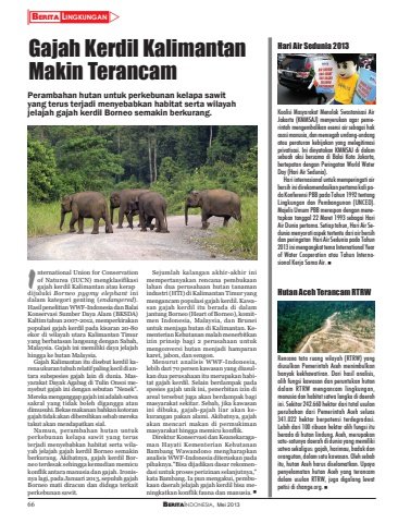 66 BERITAINDONESIA, Mei 2013BERITA LINGKUNGANZGajah Kerdil KalimantanMakin TerancamPerambahan hutan untuk perkebunan kelapa sawityang terus terjadi menyebabkan habitat serta wilayahjelajah gajah kerdil Borneo semakin berkurang.nternational Union for Conservationof Naturea (IUCN) mengklasifikasigajah kerdil Kalimantan atau kerapdijuluki Borneo pygmy elephant inidalam kategori genting (endangered).Hasil penelitian WWF-Indonesia dan BalaiKonservasi Sumber Daya Alam (BKSDA)Kaltim tahun 2007-2012, memperkirakanpopulasi gajah kerdil pada kisaran 20-80ekor di wilayah utara Kalimantan Timuryang berbatasan langsung dengan Sabah,Malaysia. Gajah ini memiliki daya jelajahhingga ke hutan Malaysia.Gajah Kalimantan itu disebut kerdil karena ukuran tubuh relatif paling kecil di antara subspesies gajah lain di dunia. Masyarakat Dayak Agabag di Tulin Onsoi menyebut gajah ini dengan sebutan \Mereka menganggap gajah ini adalah satwasakral yang tidak boleh diganggu ataudimusuhi. Bekas makanan bahkan kotorangajah tidak akan dibersihkan sebab merekatakut akan mendapatkan sial.Namun, perambahan hutan untukperkebunan kelapa sawit yang terusterjadi menyebabkan habitat serta wilayah jelajah gajah kerdil Borneo semakinberkurang. Akibatnya, gajah kerdil Borneo terdesak sehingga kemudian memicukonflik antara manusia dan gajah. Ironisnya lagi, pada Januari 2013, sepuluh gajahBorneo mati diracun dan diduga terkaitperkebunan sawit.Sejumlah kalangan akhir-akhir inimempertanyakan rencana pembukaanlahan dua perusahaan hutan tanamanindustri (HTI) di Kalimantan Timur yangmengancam populasi gajah kerdil. Kawasan gajah kerdil itu berada di dalamjantung Borneo (Heart of Borneo), komitmen Indonesia, Malaysia, dan Bruneiuntuk menjaga hutan di Kalimantan. Kementerian Kehutanan malah menerbitkanizin prinsip bagi 2 perusahaan untukmengonversi hutan menjadi hamparankaret, jabon, dan sengon.Menurut analisis WWF-Indonesia,lebih dari 70 persen kawasan yang diusulkan dua perusahaan itu merupakan habitat gajah kerdil. Selain berdampak padaspesies gajah unik ini, penerbitan izin diareal tersebut juga akan berdampak bagimasyarakat sekitar. Sebab, jika kawasanini dibuka, gajah-gajah liar akan kekurangan pakan alami. Akibatnya, gajahakan mencari makan di permukimanmasyarakat hingga memicu konflik.Direktur Konservasi dan Keanekaragaman Hayati Kementerian KehutananBambang Wawandono mengharapkananalisis WWF-Indonesia diteruskan padapihaknya.\dasi untuk proses perizinan selanjutnya,\kata Bambang. Ia pun mengakui, pembukaan daerah jelajah gajah kerdil bisa meningkatkan konflik fauna dan manusia. IHari Air Sedunia 2013Koalisi Masyarakat Menolak Swastanisasi AirJakarta (KMMSAJ) menyerukan agar pemerintah mengembalikan esensi air sebagai hakasasi manusia, dan mencegah undang-undangatau peraturan kebijakan yang melegitimasiprivatisasi. Ini dinyatakan KMMSAJ di dalamsebuah aksi bersama di Balai Kota Jakarta,bertepatan dengan Peringatan World WaterDay (Hari Air Sedunia).Hari internasional untuk memperingati airbersih ini direkomendasikan pertama kali pada Konferensi PBB pada Tahun 1992 tentangLingkungan dan Pembangunan (UNCED).Majelis Umum PBB merespon dengan menetapkan tanggal 22 Maret 1993 sebagai HariAir Dunia pertama. Setiap tahun, Hari Air Sedunia menyoroti aspek tertentu dari air bersihdan peringatan Hari Air Sedunia pada Tahun2013 ini mengangkat tema International Yearof Water Cooperation atau Tahun Internasional Kerja Sama Air. Hutan Aceh Terancam RTRWRencana tata ruang wilayah (RTRW) yangdiusulkan Pemerintah Aceh menimbulkanbanyak kekhawatiran. Dari hasil analisis,alih fungsi kawasan dan peruntukan hutandalam RTRW mengancam lingkungan,manusia dan habitat satwa langka di daerahini. Sekitar 242.660 hektar dari total usulanperubahan dari Pemerintah Aceh seluas341.022 hektar berpotensi terdegradasi.Lebih dari 100 ribuan hektar alih fungsi ituberada di hutan lindung. Aceh, merupakansatu-satunya daerah di dunia yang memilikisatwa sekaligus: gajah, harimau, badak danorangutan, dalam satu kawasan. Oleh sebabitu, hutan Aceh harus diselamatkan. Upayapenyelamatan hutan Aceh yang terancamdalam usulan RTRW, juga digalang lewatpetisi di change.org.