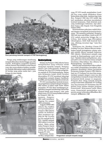 BERITAINDONESIA, Juli 2013 53Y BERITA KOTAWarga yang sembarangan membuangsampah dikenakan denda hingga 500 riburupiah. Sedangkan pengelola fasilitasumum (fasum) dan fasilitas sosial (fasos)yang alpa menyediakan fasilitas pemilihan sampah dikenakan sanksi administratif berupa uang paksa mulai dari 1 jutahingga 50 juta rupiah.BantargebangSelama ini Pemprov DKI Jakarta harusmengeluarkan uang triliunan untukmengatasi masalah sampah. Pemprovantara lain bekerjasama dengan PTGodang Tua Jaya (GTJ) dalam pengolahan sampah di TPA Bantargebang. Dalamnota kerjasama (sejak 2008) tersebutdisyaratkan PT GTJ membuat teknologipengelolaan sampah dengan Gasifikasi,Landfill, and Anaerobic Digestion (Galvad).PT GTJ mendapatkan kontrak kerjasama pengelolaan sampah dengan PemprovDKI selama 15 tahun sejak 2008. Dalamperjanjian, PT GTJ akan membangun pengelolaan sampah berteknologi Galvad danmenjual listrik serta kompos. Lalu, padatahun 2023, PT GTJ menyerahkan asetnyake Pemprov DKI. Sementara PemprovDKI wajib membayarTipping Fee sampaiakhir perjanjian.Anggota DPRD DKIJakarta Boy Sadikinmengungkapkan,Pemprov DKI Jakartaselama ini berkewajiban membayar tipping fee Rp 114.000per ton sampah ke PTGTJ. Jumlah sampahDKI sekitar 6.000 tonsehari. Maka setiapbulan Pemprov harusmembayar tipping feesekitar Rp 19 miliarkepada PT. GTJ.Sementara, menurut Boy, sampai sekarang, PT GTJ masih menjalankan Landfill Gas yang sudah dilakukan DinasKebersihan sejak dulu. Anehnya lagi, kataBoy, Pemprov DKI dan GTJ sudah tigakali melakukan adendum (perubahan)kontrak kerjasama. Pada kontrak awal,yang tandatangan Gubernur, tapi adendum hanya oleh Kepala Unit PengelolaTeknis TPST.Keterlambatan pekerjaan malah disiasati dengan mengubah perjanjian kerjasama. “Ini namanya penipuan, PemprovDKI kok mau saja ditipu, sejak 2008, PTGTJ sudah menerima hingga Rp 1,2triliun, kok belum juga diterapkanteknologinya, lebih baik kontrak barusaja, dilelang investasi lagi,” kata BoySadikin.Sementara itu, Direktur Utama PTGodang Tua Jaya, Rekson Sitorus menjelaskan terjadi peningkatan volume sampah setelah Jokowi menjadi GubernurDKI Jakarta. Sebelumnya sampah yangmasuk ke Bantargebang 5.300 ton perhari. “Setelah Jokowi jadi gubernur, sampah jadi 6.000 ton karena semua sampahdiselokan dibersihkan dan dibawa keBantargebang,” ujar Rekson.Rekson juga menjelaskan bahwa pihaknya sudah menjalankan kewajiban sebagaimana disepakati dalam perjanjiankerjasama dengan Pemprov DKI Jakarta.Saat ini, PT Godang Tua Jaya bisa menginstalasi sampah sampai 2.000 ton danmengubahnya menjadi energi terbarukanberbentuk listrik sampai 10 megawatt.Program daur ulang sampah menjadienergi terbarukan dilakukan PT GodangTua Jaya bersama PT Pertamina dan PTSolena Grup sejalan dengan programPemerintah. Rencananya pada tahun2025, Pemerintah menargetkan 25,6persen energi terbarukan dihasilkan darisampah. BERINDO | tslPengolahan sampah terpadu wargaPara pemulung memilah sampah di TPST Bantargebang