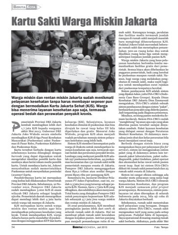 54 BERITAINDONESIA, Juli 2013BERITA KOTA ZKartu Sakti Warga Miskin JakartaWarga miskin dan rentan miskin Jakarta sudah menikmatipelayanan kesehatan tanpa harus membayar sepeser pundengan bermodalkan Kartu Jakarta Sehat (KJS). Wargabisa menerima layanan kesehatan apa saja, termasukoperasi bedah dan perawatan penyakit kronis.emerintah Provinsi DKI Jakartakembali membagikan lebih dari1,7 juta KJS kepada warganyaakhir Mei 2013. Gubernur DKIJakarta Joko Widodo secara simbolismembagikan KJS di tiga Pusat KesehatanMasyarakat (Puskesmas) yakni Puskesmas di Pasar Rebo, Puskesmas Kalideresdan Puskesmas Koja.Kartu tersebut berbeda dengan kartusebelumnya karena dilengkapi denganbarcode yang dapat digunakan untukmengetahui identitas pemilik kartu dannantinya akan berisi rekam medis pemilikkartu. Untuk membaca kartu ini, Jokowimenyebutkan sudah memerintahkanPuskesmas untuk menyediakan pemindai(scanner) kartu.Pendistribusian kartu ini merupakanyang kedua kali dilaksanakan PemerintahProvinsi DKI Jakarta. Sebelumnya, 10 November 2012, Pemprov DKI Jakartasudah membagikan 3.000 KJS di enamwilayah DKI Jakarta sebagai langkahujicoba. Pemerintah daerah menargetkandapat membagi lebih dari 4 juta kartuuntuk warga tak mampu di Jakarta.KJS merupakan kartu untuk wargamiskin dan rentan miskin agar bisamendapatkan pelayanan kesehatan yanglayak. Untuk mendapatkan KJS, wargaJakarta hanya perlu mendaftar di puskesmas dengan menggunakan KTP dan kartukeluarga (KK). Selanjutnya, layanankesehatan dimulai di puskesmas dan bisadirujuk ke rawat inap kelas III biladiperlukan dan gratis. Menurut JokoWidodo, program KJS akan menjadiwadah perubahan menuju sistem pelayanan kesehatan yang lebih baik.Sistem KJS memberi kesempatan padawarga di ibukota untuk mendapatkan layanan kesehatan apa saja, termasuk operasi bedah dan perawatan penyakit kronis.Lembaga yang melayani pemilik KJS adalah 297 puskesmas kelurahan, 44 puskesmas kecamatan dan 132 rumah sakit milikpemerintah maupun swasta di Jakarta.Pemprov DKI Jakarta menganggarkandana Rp1,2 triliun atau senilai denganpremi Rp23 ribu per pemegang KJS.Sementara itu, menurut Direktur Pelayanan PT Askes Fajriadinur, saat ini, sudah 2,3 juta jiwa yang terserap sebagai peserta KJS. Namun, baru 1,7 juta KJS yangdibagikan, dan selebihnya akan menyusul.Total kuota yang disiapkan Pemprov DKIuntuk penyerapan kepesertaan KJS adalah sebanyak 4,7 juta jiwa warga miskindan rentan miskin di Jakarta.Di awal perjalanannya, KJS membuatpeningkatan pasien lebih dari 100% diseluruh rumah sakit di Jakarta. Hal inimembuat pihak rumah sakit kewalahandengan lonjakan pasien. Antrian panjangpun menjadi pemandangan rutin di rumah sakit. Kurangnya tenaga, peralatandan fasilitas medis termasuk jumlahruangan di rumah sakit menjadi masalahbaru mengiringi diluncurkannya KJS.Padahal Jokowi telah merombak beberapa rumah sakit dan menetapkan penambahan 300-an ruang kelas dua untukdijadikan ruang kelas tiga untuk mengantisipasi lonjakan jumlah pasien KJS.Warga miskin Jakarta yang haus pelayanan kesehatan berlomba-lomba memanfaatkan fasilitas gratis dari pemerintah. Semua biaya akan dibebankan keanggaran pemerintah, baik yang berobatke puskesmas maupun rumah sakit. Namun, bagi warga yang melakukan pengobatan di rumah sakit, maka wajib baginya untuk mendapatkan surat rujukandari puskesmas tempatnya berobat.Sistem pembayaran KJS adalah sistemyang dipakai Askes, yaitu INA-CBG's (Indonesia Case Base Groups). Kepala DinasKesehatan DKI Jakarta Dien Emmawatimengatakan, INA-CBG's adalah sebuahsistem pembayaran dengan sistem \berdasarkan penyakit yang diderita pasien.Jadi tergantung pada diagnosa primernya.Misalnya, seorang pasien menderita demam berdarah. Sistem INA-CBG's sudah\ layanan apa saja yang akanditerima pasien tersebut sampai dinyatakan sembuh. Paket layanan kesehatanyang didapat sesuai dengan PeraturanMenteri Kesehatan. Di dalamnya mencakup jenis obat dan kelas perawatan bilaharus menjalani rawat inap.Berbeda dengan sistem biasa yangmengenakan biaya per pelayanan (fee forservice), sistem ini menggunakan sistempaket yang di dalamnya antara lain termasuk paket laboratorium, paket radiodiagnostik, paket tindakan, paket operasidan akomodasi kelas rawat untuk pasienrawat inap. Saat ini sistem INA-CBG'sdiikuti 66 rumah sakit pemerintah dan 23rumah sakit swasta di Jakarta.Sistem ini sangat efisien sehingga adastandar mutu pelayanan yang sama bagiwarga Jakarta. Sistem INA-CBG's disusunKementerian Kesehatan, dan programKJS menjadi semacam pilot projectpenerapannya. Rencananya, sistem pembayaran ini akan diterapkan di seluruhIndonesia pada 2014, bila uji coba diJakarta dinyatakan berhasil.Sebelumnya, rumah sakit menentukantarif pelayanan yang beragam. Denganadanya sistem INA-CBG's, rumah sakitmengenakan tarif yang sama pada setiappelayanan. Padahal fakta di lapangan,biaya operasional di masing-masing rumahsakit berbeda. Akibatnya, pada akhir MeiPFoto: Tempo