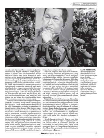 BERITAINDONESIA, Juli 2013 57YBERITA MANCANEGARAnezuela sejak dipimpin Chavez kian meningkat jikadibandingkan dengan kehidupan rakyat negaranegara AL lainnya. Satu hal yang menarik adalahkebijakan Chavez bagi kaum perempuan padaumumnya, dan kaum perempuan dari kalanganyang kurang mampu pada khususnya. Untuk ibuibu rumah tangga yang miskin, ditetapkan adanyagaji setiap bulan. Sebab, dalam konstitusi Venezuela diakui bahwa pekerjaan seorang perempuandalam rumah tangga dan mengasuh anak-anakadalah pekerjaan yang mempunyai nilai ekonomi,dan karenanya harus mendapat gaji dan penghargaan dari negara. Untuk ibu-ibu yang demikianini diberikan gaji 200 dollar AS per bulan. Ada200.000 ibu rumahtangga yang menerima gajisebesar itu per bulan, dan jumlahnya kian lamakian bertambah sampai 500.000-an orang.Menurut data statistik, tahun 1998 sekitar 50%penduduk Venezuela hidup dalam keadaan yangsangat susah. Untuk menghapuskan kemiskinanitu telah dicanangkan program kemanusiaan dibawah bendera Misi Kristus (Misi Cristo), yangbertujuan menciptakan “zero kemiskinan” ditahun 2021. Demi meringankan penderitaanrakyat, pemerintah Venezuela juga memberikanmakan gratis kepada 1.270.000 orang dua kalisehari. Ada sekitar 6.000 meal homes yang setiapharinya menyediakan makanan untuk 200 orangdi setiap gedungnya, yang terdapat di seluruhnegeri. Juga ada program sosial-ekonomi yangdiberi nama “Mercal”, yang memungkinkan sebanyak 500.000 penduduk Venezuela membelibahan makanan dan minuman dengan potonganharga 50% di 14.000 toko Mercal di seluruh negeri.Semua itu mendapat subsidi dari negara.Tindakan yang luar biasa juga telah dilaksanakan di bidang kesehatan dan pendidikan, yangsecara bertahap dimaksudkan untuk mencapaiperubahan dalam politik, ekonomi, sosial dankebudayaan di Venezuela. Ini semua dilakukandalam rangka sosialisme Bolivarian, yang menjadibidang perjuangan Chavez dan para pendukungnya. Dewasa ini revolusi sosialisme demokratik alaChavez itu juga sedang berupaya mengubahkenyataan pahit berikut ini: 77% tanah pertaniandi Venezuela dimiliki oleh 3% penduduk yangkebanyakan dibiarkan menjadi tanah kosong dantak diolah, sedangkan banyak petani yang takbertanah terpaksa hidup sengsara sejak ratusantahun silam.Tak pelak, Revolusi Bolivarian yang dilancarkandi Venezuela adalah prahara anti-imperialisme ASdan anti-neoliberalisme, yang gemuruhnya sudahberkumandang di seluruh kawasan AL dan mendapat simpati dari banyak kalangan di berbagaipenjuru dunia. Bukan hanya dari negara-negarayang berdekatan seperti Kuba, Bolivia, Argentina,Brazilia, Chili, Ekuador dan Peru saja, tapi juga darinegara-negara yang jauh letaknya seperti Iran,Siria, India, Rusia, RRC, dan beberapa negara diEropa.Masih banyak sisi positif Chavez yang bisadiungkap dan dijadikan rujukan bagi para pemimpin, tak terkecuali di Indonesia. Rasanya takberlebihan jika mengatakan kita rindu sosokpemimpin seperti El Comandante (Sang Komandan) Hugo Chavez menjadi presiden di Indonesiatahun depan. BERINDOSANG PEMIMPIN:Presiden VenezuelaHugo Rafael ChávezFrías, Sang Pemimpinyang dicintairakyatnya. Chavezmerupakan salahsatu pemimpin palingkarismatik sekaliguskontroversial karenakeberaniannyamelawan AmerikaSerikat (AS) sebagaipemimpin kapitalismeglobal.