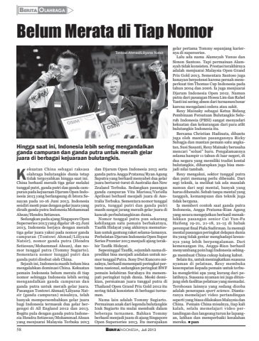 58 BERITAINDONESIA, Juli 2013BERITA OLAHRAGAZBelum Merata di Tiap NomorHingga saat ini, Indonesia lebih sering mengandalkanganda campuran dan ganda putra untuk meraih gelarjuara di berbagai kejuaraan bulutangkis.ekuatan China sebagai raksasaolahraga bulutangkis dunia tetaptidak tergoyahkan hingga saat ini.China berhasil meraih tiga gelar melaluitunggal putri, ganda putri dan ganda campuran pada kejuaraan Djarum Open Indonesia 2013 yang berlangsung di Istora Senayan pada 10-16 Juni 2013. Indonesiasendiri mesti puas dengan gelar juara yangdiraih ganda putra Indonesia MohammadAhsan/Hendra Setiawan.Sedangkan pada ajang Singapore OpenSuperseries 2013 yang digelar 18-23 Juni2013, Indonesia berjaya dengan meraihtiga gelar juara yakni pada nomor gandacampuran (Tontowi Ahmad/LiliyanaNatsir), nomor ganda putra (HendraSetiawan/Mohammad Ahsan), dan nomor tunggal putra (Tommy Sugiarto).Sementara nomor tunggal putri danganda putri direbut oleh China.Sejauh ini, Indonesia masih belum bisamengalahkan dominasi China. Kekuatanpemain Indonesia belum merata di tiapnomor sehingga Indonesia lebih seringmengandalkan ganda campuran danganda putra untuk meraih gelar juara.Pasangan Tontowi Ahmad/Liliyana Natsir (ganda campuran) misalnya, telahbanyak mempersembahkan gelar juarabagi Indonesia termasuk dua gelar bergengsi di All England 2012 dan 2013.Begitu pula dengan ganda putra Indonesia Hendra Setiawan/Mohammad Ahsanyang menjuarai Malaysia Terbuka 2013dan Djarum Open Indonesia 2013 sertaganda putra Angga Pratama/Ryan AgungSaputra yang berhasil menyabet dua gelarjuara berturut-turut di Australia dan NewZealand Terbuka. Sedangkan pasanganganda campuran Vita Marissa/VariellaAprilsasi berhasil menjadi juara di Australia Terbuka. Sementara nomor tunggalputra, tunggal putri dan ganda putrimasih sangat jarang meraih gelar juara dikancah perbulutangkisan dunia.Nomor tunggal putra pun sekarangkehilangan satu pemain berbakatnya,Taufik Hidayat yang akhirnya memutuskan untuk gantung raket selama-lamanya.Perhelatan Djarum Indonesia Open SuperSeries Premier 2013 menjadi ajang terakhir Taufik Hidayat.Sepeninggal Taufik, sejumlah nama diprediksi bisa menjadi andalan untuk nomor tunggal Putra. Sony Dwi Kuncoro misalnya, berhasil menempati peringkat pertama nasional, sedangkan peringkat BWFpemain kelahiran Surabaya itu menempati peringkat tujuh dunia. Meski demikian, permainan juara tunggal putra diThailand Open Grand Prix Gold 2012 itusering tidak konsisten di berbagai turnamen.Nama lain adalah Tommy Sugiarto.Permainan anak dari legenda bulutangkisIcuk Sugiarto itu mulai membaik dalambeberapa turnamen. Bahkan Tommyberhasil menjadi juara di ajang SingaporeOpen Superseries 2013. Itu merupakangelar pertama Tommy sepanjang kariernya di superseries.Lalu ada nama Alamsyah Yunus danSimon Santoso. Tapi permainan Alamsyah tidak konsisten. Prestasi terakhirnyaadalah menjuarai Malaysia Open GrandPrix Gold 2013. Sementara Santoso jugalumayan berpotensi karena pernah memperkuat tim Thomas Cup Indonesia padatahun 2004 dan 2006. Ia juga menjuaraiDjarum Indonesia Open 2012. Namunputra dari pasangan Hosea Lim dan RahelYanti ini sering absen dari turnamen besarkarena mengalami cedera atau sakit.Rexy Mainaky sebagai Ketua BidangPembinaan Persatuan Bulutangkis Seluruh Indonesia (PBSI) sangat menyadarikekuatan dan kekurangan dari para atlitbulutangkis Indonesia itu.Bersama Christian Hadinata, dibantujuga oleh mantan pasangannya RickySubagja dan mantan pemain satu angkatan, Susi Susanti, Rexy Mainaky berusahamencari \selama hampir 11 tahun di luar negeri, didua negara yang memiliki tradisi kentalbulutangkis, diharapkan juga bisa menjadi nilai tambah.Rexy mengakui, sektor tunggal putradan putri memang perlu dibenahi. Darisegi teknik, ia melihat tak ada masalahnamun dari segi mental, banyak yangharus dibenahi. Sebab tanpa mental yangtangguh, kemampuan dan teknik jugatidak berguna.Ia memberi contoh saat ganda putraIndonesia, Angga Pratama-Rian Agungyang secara mengejutkan berhasil menaklukkan pasangan senior Cai Yun-FuHaifeng 19-21, 21-18, 21-15 di babakperempat final Piala Sudirman. Ia memujimental pasangan peringkat delapan duniaitu yang tidak gentar menghadapi lawannya yang lebih berpengalaman. Darikemenangan itu, Angga-Rian berhasilmenyumbang poin bagi Indonesia sehingga membuat China cukup kalang kabut.Selain itu, untuk meningkatkan suasananyaman di pelatnas, Rexy membukakesempatan kepada pemain untuk terbuka mengkritisi apa yang kurang dari pelatihnya. Suasana nyaman ini juga ditunjang oleh fasilitas pelatnas yang memadai.Terobosan lainnya yang sedang dicobaadalah penerapan sport science. Diantaranya memelajari video pertandinganseperti yang biasa dilakukan Malaysia danChina. Pemain China misalnya, tiap kalikalah, selalu memelajari video pertandingan dan langsung turun ke lapangan, latihan dan memperbaiki kesalahanmereka. panKTontowi Ahmad/Liliyana Natsir