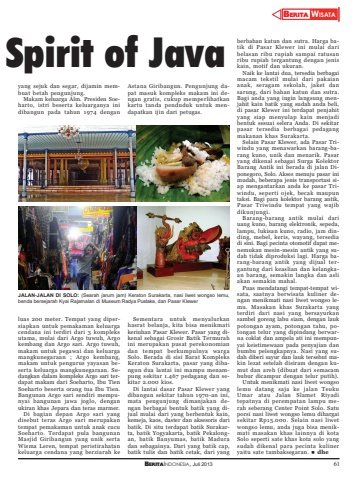 YBERITA WISATABERITAINDONESIA, Juli 2013 61YBERITA WISATA Spirit of Javayang sejuk dan segar, dijamin membuat betah pengunjung.Makam keluarga Alm. Presiden Soeharto, istri beserta keluarganya inidibangun pada tahun 1974 denganAstana Giribangun. Pengunjung dapat masuk kompleks makam ini dengan gratis, cukup memperlihatkankartu tanda penduduk untuk mendapatkan ijin dari petugas.berbahan katun dan sutra. Harga batik di Pasar Klewer ini mulai daribelasan ribu rupiah sampai ratusanribu rupiah tergantung dengan jeniskain, motif dan ukuran.Naik ke lantai dua, tersedia berbagaimacam tekstil mulai dari pakaiananak, seragam sekolah, jaket dansarung, dari bahan katun dan sutra.Bagi anda yang ingin langsung menjahit kain batik yang sudah anda beli,di pasar Klewer ini terdapat penjahityang siap menyulap kain menjadibentuk sesuai selera Anda. Di sekitarpasar tersedia berbagai pedagangmakanan khas Surakarta.Selain Pasar Klewer, ada Pasar Triwindu yang menawarkan barang-barang kuno, unik dan menarik. Pasaryang dikenal sebagai Surga KolektorBarang Antik ini berada di jalan Diponegoro, Solo. Akses menuju pasar inimudah, beberapa jenis transportasi siap mengantarkan anda ke pasar Triwindu, seperti ojek, becak maupuntaksi. Bagi para kolektor barang antik,Pasar Triwindu tempat yang wajibdikunjungi.Barang-barang antik mulai dariuang kuno, barang elektronik, sepeda,lampu, lukisan kuno, radio, jam dinding, mebel, keris, wayang, tersediadi sini. Bagi pecinta otomotif dapat menemukan mesin-mesin antik yang sudah tidak diproduksi lagi. Harga barang-barang antik yang dijual tergantung dari keaslian dan kelangkaan barang, semakin langka dan asliakan semakin mahal.Puas mendatangi tempat-tempat wisata, saatnya berwisata kuliner dengan menikmati nasi liwet wongso lemu. Masakan khas Surakarta yangterdiri dari nasi yang bersayurkansambel goreng labu siam, dengan laukpotongan ayam, potongan tahu, potongan telur yang dipindang berwarna coklat dan ampela ati ini mempunyai keistimewaan pada penyajian danbumbu pelengkapnya. Nasi yang sudah diberi sayur dan lauk tersebut makin lezat setelah disiram dengan kumut dan areh (dibuat dari semacambubur dicampur dengan telur putih).Untuk menikmati nasi liwet wongsolemu datang saja ke jalan TeukuUmar atau Jalan Slamet Riyaditepatnya di perempatan lampu merah seberang Center Point Solo. Satuporsi nasi liwet wongso lemu dihargaisekitar Rp15.000. Selain nasi liwetwongso lemu, anda juga bisa menikmati masakan khas lainnya di kotaSolo seperti sate khas kota solo yangsudah dikenal para pecinta kulineryaitu sate tambaksegaran. dheSementara untuk menyalurkanhasrat belanja, kita bisa menikmatikeriuhan Pasar Klewer. Pasar yang dikenal sebagai Grosir Batik Termurahini merupakan pusat perekonomiandan tempat berkumpulnya wargaSolo. Berada di sisi Barat KompleksKeraton Surakarta, pasar yang dibangun dua lantai ini mampu menampung sekitar 1.467 pedagang dan sekitar 2.000 kios.Di lantai dasar Pasar Klewer yangdibangun sekitar tahun 1970-an ini,mata pengunjung dimanjakan dengan berbagai bentuk batik yang dijual mulai dari yang berbentuk kain,kemeja, kaos, daster dan aksesoris daribatik. Di situ terdapat batik Surakarta, batik Yogyakarta, batik Pekalongan, batik Banyumas, batik Maduradan sebagainya. Dari yang batik cap,batik tulis dan batik cetak, dari yangluas 200 meter. Tempat yang dipersiapkan untuk pemakaman keluargacendana ini terdiri dari 3 kompleksutama, mulai dari Argo tuwuh, Argokembang dan Argo sari. Argo tuwuh,makam untuk pegawai dan keluargamangkunegaraan ; Argo kembang,makam untuk pengurus yayasan beserta keluarga mangkunegaraan. Sedangkan dalam kompleks Argo sari terdapat makam dari Soeharto, Ibu TienSoeharto beserta orang tua Ibu Tien.Bangunan Argo sari sendiri mempunyai bangunan jawa joglo, denganukiran khas Jepara dan teras marmer.Di bagian depan Argo sari yangdisebut teras Argo sari merupakantempat pemakaman untuk anak cucuSoeharto. Terdapat pula bangunanMasjid Giribangun yang unik sertaWisma Leren, tempat peristirahatankeluarga cendana yang berziarah keJALAN-JALAN DI SOLO: (Searah jarum jam) Keraton Surakarta, nasi liwet wongso lemu,benda bersejarah Kyai Rajamalan di Museum Radya Pustaka, dan Pasar Klewer