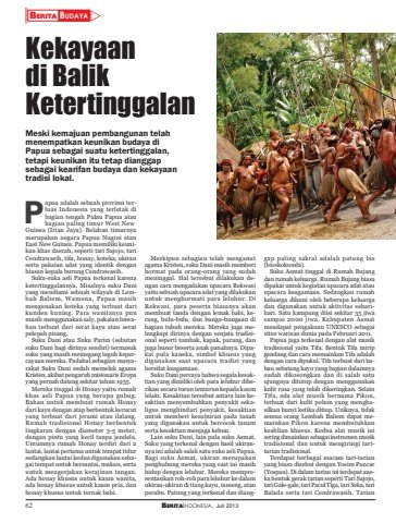 62 BERITAINDONESIA, Juli 2013BERITA BUDAYAZKekayaandi BalikKetertinggalanMeski kemajuan pembangunan telahmenempatkan keunikan budaya diPapua sebagai suatu ketertinggalan,tetapi keunikan itu tetap dianggapsebagai kearifan budaya dan kekayaantradisi lokal.apua adalah sebuah provinsi terluas Indonesia yang terletak dibagian tengah Pulau Papua ataubagian paling timur West NewGuinea (Irian Jaya). Belahan timurnyamerupakan negara Papua Nugini atauEast New Guinea. Papua memiliki keunikan khas daerah, seperti tari Sajojo, tariCendrawasih, tifa, honay, koteka, ukiranserta pakaian adat yang identik denganhiasan kepala burung Cendrawasih.Suku-suka asli Papua terkenal karenaketertinggalannya. Misalnya suku Daniyang mendiami sebuah wilayah di Lembah Baliem, Wamena, Papua masihmengenakan koteka yang terbuat darikunden kuning. Para wanitanya punmasih menggunakan saly, pakaian bawahan terbuat dari serat kayu atau seratpelepah pisang.Suku Dani atau Suku Parim (sebutansuku Dani bagi dirinya sendiri) termasuksuku yang masih memegang teguh kepercayaan mereka. Padahal sebagian masyarakat Suku Dani sudah memeluk agamaKristen, akibat pengaruh misionaris Eropayang pernah datang sekitar tahun 1935.Mereka tinggal di Honay yaitu rumahkhas asli Papua yang berupa gubug.Bahan untuk membuat rumah Honaydari kayu dengan atap berbentuk kerucutyang terbuat dari jerami atau ilalang.Rumah tradisional Honay berbentuklingkaran dengan diameter 3-5 meter,dengan pintu yang kecil tanpa jendela.Umumnya rumah Honay terdiri dari 2lantai, lantai pertama untuk tempat tidursedangkan lantai kedua digunakan sebagai tempat untuk bersantai, makan, sertauntuk mengerjakan kerajinan tangan.Ada honay khusus untuk kaum wanita,ada honay khusus untuk kaum pria, danhonay khusus untuk ternak babi.Meskipun sebagian telah menganutagama Kristen, suku Dani masih memberihormat pada orang-orang yang sudahmeninggal. Hal tersebut dilakukan dengan cara mengadakan upacara Rekwasiyaitu sebuah upacara adat yang dilakukanuntuk menghormati para leluhur. DiRekwasi, para peserta biasanya akanmembuat tanda dengan lemak babi, kerang, bulu-bulu, dan bunga-bungaan dibagian tubuh mereka. Mereka juga melengkapi dirinya dengan senjata tradisional seperti tombak, kapak, parang, danjuga busur beserta anak panahnya. Dipakai pula kaneka, simbol khusus yangdigunakan saat upacara tradisi yangbersifat keagamaan.Suku Dani percaya bahwa segala kesaktian yang dimiliki oleh para leluhur diberikan secara turun temurun kepada kaumlelaki. Kesaktian tersebut antara lain kesaktian menyembuhkan penyakit sekaligus menghindari penyakit, kesaktianuntuk memberi kesuburan pada tanahyang digunakan untuk bercocok tanamserta kesaktian menjaga kebun.Lain suku Dani, lain pula suku Asmat.Suku yang terkenal dengan hasil ukirannya ini adalah salah satu suku asli Papua.Bagi suku Asmat, ukiran merupakanpenghubung mereka yang saat ini masihhidup dengan leluhur. Mereka mempresentasikan roh-roh para leluhur ke dalamukiran-ukiran di tiang kayu, tameng, atauperahu. Patung yang terkenal dan dianggap paling sakral adalah patung bis(bioskokombi).Suku Asmat tinggal di Rumah Bujangdan rumah keluarga. Rumah Bujang biasadipakai untuk kegiatan upacara adat atauupacara keagamaan. Sedangkan rumahkeluarga dihuni oleh beberapa keluargadan digunakan untuk aktivitas seharihari. Satu kampung diisi sekitar 35 jiwasampai 2000 jiwa. Kabupaten Asmatmendapat pengakuan UNESCO sebagaisitus warisan dunia pada Februari 2011.Papua juga terkenal dengan alat musiktradisional yaitu Tifa. Bentuk Tifa miripgendang dan cara memainkan Tifa adalahdengan cara dipukul. Tifa terbuat dari bahan sebatang kayu yang bagian dalamnyasudah dikosongkan dan di salah satuujungnya ditutup dengan menggunakankulit rusa yang telah dikeringkan. SelainTifa, ada alat musik bernama Pikon,terbuat dari kulit pohon yang menghasilkan bunyi ketika ditiup. Uniknya, tidaksemua orang Lembah Baliem dapat memainkan Pikon karena membutuhkankeahlian khusus. Kedua alat musik inisering dimainkan sebagai instrumen musiktradisional dan untuk mengiringi taritarian tradisional.Terdapat berbagai macam tari-tarianyang biasa disebut dengan Yosim Pancar(Yospan). Di dalam tarian ini terdapat aneka bentuk gerak tarian seperti Tari Sajojo,tari Gale-gale, tari Pacul Tiga, tari Seka, tariBalada serta tari Cendrawasih. TarianP