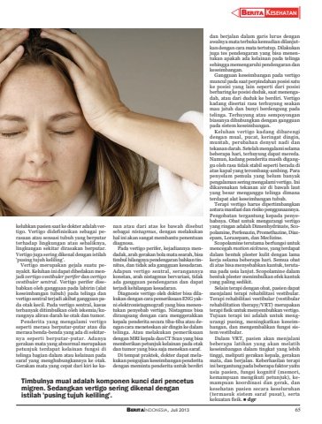 BERITAINDONESIA, Juli 2013 65YBERITA KESEHATANkeluhkan pasien saat ke dokter adalah vertigo. Vertigo didefinisikan sebagai perasaan atau sensasi tubuh yang berputarterhadap lingkungan atau sebaliknya,lingkungan sekitar dirasakan berputar.Vertigo juga sering dikenal dengan istilah'pusing tujuh keliling'.Vertigo merupakan gejala suatu penyakit. Keluhan ini dapat dibedakan menjadi vertigo vestibuler perifer dan vertigovestibuler sentral. Vertigo perifer disebabkan oleh gangguan pada labirin (alatkeseimbangan tubuh) pada telinga danvertigo sentral terjadi akibat gangguan pada otak kecil. Pada vertigo sentral, kasusterbanyak ditimbulkan oleh iskemia/kurangnya aliran darah ke otak dan tumor.Penderita yang mengalami vertigoseperti merasa berputar-putar atau diamerasa benda-benda yang ada di sekitarnya seperti berputar-putar. Adanyagerakan mata yang abnormal merupakanpetunjuk terdapat kelainan fungsi ditelinga bagian dalam atau kelainan padasaraf yang menghubungkannya ke otak.Gerakan mata yang cepat dari kiri ke kanan atau dari atas ke bawah disebutsebagai nistagmus, dengan melakukanhal ini akan sangat membantu penentuandiagnosa.Pada vertigo perifer, kejadiannya mendadak, arah gerakan bola mata searah, bisatimbul hilangnya pendengaran bahkan tinnitus, dan tidak ada gangguan kesadaran.Adapun vertigo sentral, serangannyakonstan, arah nistagmus bervariasi, tidakada gangguan pendengaran dan dapatterjadi kehilangan kesadaran.Diagnosis vertigo oleh dokter bisa dilakukan dengan cara pemeriksaan ENG yakni elektronistagmografi yang bisa menentukan penyebab vertigo. Nistagmus bisadirangsang dengan cara menggerakkankepala penderita secara tiba-tiba atau dengan cara meneteskan air dingin ke dalamtelinga. Atau melakukan pemeriksaandengan MRI kepala dan CT Scan yang bisamemberikan petunjuk kelainan pada otakdan tumor yang bisa saja menekan saraf.Di tempat praktek, dokter dapat melakukan pengujian keseimbangan penderitadengan meminta penderita untuk berdiridan berjalan dalam garis lurus denganawalnya mata terbuka kemudian dilanjutkan dengan cara mata tertutup. Dilakukanjuga tes pendengaran yang bisa menentukan apakah ada kelainan pada telingasehingga memengaruhi pendengaran dankeseimbangan.Gangguan keseimbangan pada vertigomuncul pada saat perpindahan posisi satuke posisi yang lain seperti dari posisiberbaring ke posisi duduk, saat menengadah, atau dari duduk ke berdiri. Vertigokadang disertai rasa terhuyung seakanmau jatuh dan bunyi berdengung padatelinga. Terhuyung atau sempoyonganbiasanya dihubungkan dengan gangguanpada sistem keseimbangan.Keluhan vertigo kadang dibarengidengan mual, pucat, keringat dingin,muntah, perubahan denyut nadi dantekanan darah. Setelah mengalami selamabeberapa hari, terhuyung dapat mereda.Namun, kadang penderita masih diganggu oleh rasa tidak stabil seperti berada diatas kapal yang terombang-ambing. Parapenyelam pemula yang belum banyakpengalaman sering mengalami vertigo. Inidikarenakan tekanan air di bawah lautyang besar menganggu telinga dimanaterdapat alat keseimbangan tubuh.Terapi vertigo harus dipertimbangkanantara manfaat dan risiko penggunaannya.Pengobatan tergantung kepada penyebabnya. Obat untuk mengurangi vertigoyang ringan adalah Dimenhydrinate, Scopolamine, Perfenazin, Promethazine, Diazepam, Lorazepam, dan Meclizine.Scopolamine terutama berfungsi untukmencegah motion sickness, yang terdapatdalam bentuk plester kulit dengan lamakerja selama beberapa hari. Semua obatdi atas bisa menyebabkan kantuk, terutama pada usia lanjut. Scopolamine dalambentuk plester menimbulkan efek kantukyang paling sedikit.Selain terapi dengan obat, pasien dapatmenjalani terapi rehabilitasi vestibular.Terapi rehabilitasi vestibular (vestibularrehabilitation therapy/VRT) merupakanterapi fisik untuk menyembuhkan vertigo.Tujuan terapi ini adalah untuk mengurangi pusing, meningkatkan keseimbangan, dan mengembalikan fungsi sistem vestibular.Dalam VRT, pasien akan menjalanibeberapa latihan yang akan melatihkeseimbangan dalam tingkat yang lebihtinggi, meliputi gerakan kepala, gerakanmata, dan berjalan. Keberhasilan terapiini bergantung pada beberapa faktor yaituusia pasien, fungsi kognitif (memori,kemampuan mengikuti petunjuk), kemampuan koordinasi dan gerak, dankesehatan pasien secara keseluruhan(termasuk sistem saraf pusat), sertakekuatan fisik. dgrTimbulnya mual adalah komponen kunci dari pencetusmigren. Sedangkan vertigo sering dikenal denganistilah 'pusing tujuh keliling'.