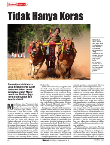 62 BERITAINDONESIA, September 2013BERITA BUDAYAZTidak Hanya KerasStereotip etnis Madurayang dikenal keras sudahtertanam dalam benaksebagian orang. Meskidemikian, Madura jugakaya akan budaya dankearifan lokal.endengar kata \mengingatkan kita tentang logatbahasa yang khas, sate madura,garam, kerapan sapi, carok, hinggasemboyan \daripada Putih Mata\sebelah utara Jawa Timur. Pulau Maduraini besarnya kurang lebih 5.250 km2 (lebih kecil dari pulau Bali), dengan penduduk sebanyak 4 juta jiwa. Maduradibagi menjadi 4 kabupaten, Bangkalan,Sampang, Pamekasan, dan Sumenep.Bangkalan berada di ujung paling baratpulau Madura dan saat ini telah dibangunjembatan terpanjang di Indonesia, jembatan Suramadu (Surabaya-Madura), merupakan salah satu kawasan perkembanganSurabaya, serta tercakup dalam Gerbangsebuah gambaran masyarakat Madurayang kental sekali dengan kekerasan.Namun asumsi orang Madura berwatakkeras ini dibantah oleh antropolog asalBelanda, Dr Huub de Jonge. Sebenarnya,kata dia, orang Madura itu sama denganorang Bali, Jawa, dan lainnya. Namun,ada aspek kebudayaan yang lain antaraorang Madura dan orang luar Madura.Selama melakukan penelitian, sejak akhir1976 hingga pertengahan 1977, kata dia,tak ada yang mengganggu, bahkan diterima dengan baik oleh masyarakat dansering diajak keliling kampung, sertamasyarakatnya mau untuk diwawancarai.Mayoritas masyarakat Madura adalahpemeluk agama Islam. Hal ini terlihat daribanyaknya masjid-masjid megah berdiridi Madura. Mereka penganut agama Islam yang tekun, dan selalu menyisihkansedikit penghasilan mereka untuk persiapan naik haji.Meski demikian, masyarakat Maduramasih memercayai keberadaan kekuatanmagis, dengan melakukan berbagai macam ritual dan ritual tersebut memberikan peranan yang penting dalam pelaksanaan kehidupan masyarakat Madura.Kertosusila.Pada zaman kolonial, penggambaranciri fisik orang Madura terus-menerusmenggambarkan perbedaan penampilanluar mereka dari orang Jawa dan orangSunda. Orang Madura terkenal dengangaya bicara yang blak-blakan dan logatyang kental, memiliki sifat temperamental dan mudah tersinggung, sangat hematdan rajin bekerja. Masyarakat Maduracukup disegani, dihormati bahkan \kuti\Penggunaan kekuatan fisik masyarakatMadura untuk menyelesaikan masalahsangat menonjol, terutama di wilayah-wilayah terpencil di pulau Madura. Dalammasyarakat Madura dikenal istilah carok,yaitu pembunuhan dengan senjata tajam.Carok dilihat sebagai ekspresi kekerasanmasyarakat Madura karena merupakanurusan yang berdarah-darah. Carok sendiri sering disetarakan dengan amuk. Kebaikan yang diperoleh oleh masyarakatatau orang Madura akan dibalas denganserupa atau lebih baik. Namun, jika disakiti, mereka akan membalas dengan yanglebih kejam. Semboyan \Tulang daripada Putih Mata\MKERAPANSAPI: Aduansapi sejak lamamenjadi cermindan ekspresimasyarakatpendukungnya.Yangditampilkan dandialami di arenaaduan adalahperjuanganhidup,pertempuranmeraih statusyang lebih tinggidan pembelaankehormatanpribadiFoto-foto: repro