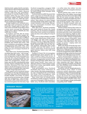 BERITAINDONESIA, September 2013 65YBERITA IPTEKtidak berubah, tagihan listrik serta kebutuhan dayanya akan berlipat ganda dalamwaktu kurang dari 10 tahun. MenurutGartner, pada 2005 saja, perusahaanperusahaan di Amerika Serikat membelanjakan sekitar Rp 54,4 triliun untukmembiayai ongkos listrik buat instalasidata center. Pada 2011, lebih dari sepertiga dari bujet data center akan dialokasikan ke pembiayaan lingkungan.Sebagai langkah awal, Facebook membuka data center pertamanya di wilayahPrineville, Oregon pada 16 April 2011.Data center ini berdiri di atas lahan seluas13.600 meter persegi dan dibangundengan biaya sebesar US$188 juta atausekitar Rp 1,6 triliun.Perusahaan asal Palo Alto itu mengklaim, data center mereka mampu meningkatkan efisiensi data center hingga 38persen sekaligus menurunkan total biayasebesar 24 persen. \banyak hal yang sebenarnya tidak kamibutuhkan dari sebuah data center. Jadikami melakukan perombakan sehinggapenggunaannya bisa lebih baik,\sang CEO Mark Zuckerberg, pada acarakonferensi pers di kampus Facebook diPalo Alto.Pada tahun 2013, Facebook kemudianmembuat tiga data center \baru di Prineville, Oregon. Data centerbaru ini digunakan untuk menyimpan fotolama dan foto yang jarang diakses. Saatini Facebook menyimpan lebih dari 240miliar foto penggunanya, dengan tambahan 350 juta foto yang diupload setiapharinya. Namun sebagian besar dari fototersebut, khususnya foto lama jarangdiakses. Facebook berupaya mencari caraefisien dalam mengelola data yang besarini untuk mengurangi beban server.Tidak seperti server Facebook lainnyayang selalu 'on' dan siap melayani permintaan data, data center baru ini diatur padakondisi 'standby', server akan \saat menerima permintaan data. Sebagaiefek dari penggunaan \dibutuhkan waktu sedikit lebih lama (delay) untuk mengakses foto-foto lama. TapiFacebook mengatakan, pengguna tidakakan terganggu dengan hal ini karena delay hanya berada pada hitungan detikbahkan milidetik.Facebook telah memiliki dua pusat datacenter yang besar di Prineville dan keduanya telah mengkonsumsi 71 juta kilowatt daya dalam sembilan bulan operasionalnya. Daya sebesar ini setara dengankonsumsi listrik untuk sekitar enam riburumah. Kehadiran 'cold storage' diharapkan bisa memangkas konsumsi dayahingga sepertiganya.Pada April 2012, Facebook membukadata center kedua di Forest City, NorthCarolina. Saat itu Facebook mengklaimbahwa data center mereka ini merupakansalah satu data center paling irit energi didunia.Data center ini diproyeksikan memilikipower usage effectiveness (PuE) antara1.06 hingga 1.08. Data center yang pertama di Prineville, Oregon juga memilikiperingkat yang tinggi dalam hal efisiensilistrik. Menurut hasil riset dari The Uptime Institute, kebanyakan data centermemiliki rata-rata PuE sekitar 1.8. Iniartinya, untuk setiap 1.8 watt yang masukpada meteran, hanya satu watt yangdikeluarkan.Fasilitas di Forest City ini merupakanpengembangan besar pertama dari v2Open Compute Project Web servers, dimana server-server di situ termasuk yangpertama menggunakan prosesor Intelberbasis Sandy Bridge (lebih efisien danlebih hemat listrik). Data center inidibangun selama 16 bulan dengan tenagakerja 2.000 orang, yang bekerja selamalebih dari 1,2 juta jam.Pada pertengahan 2013, Facebookmembuka data center terbarunya diLulea, Swedia. Jika Anda memposting status atau mengupload foto di Facebookdari Eropa, besar kemungkinan, Andaakan dibawa ke data center di Lulea ini.Data center baru ini dibuka untukmendukung jumlah pengguna Facebookyang terus meningkat. Pada kuartal ke-2tahun 2013, Facebook telah menembus1.15 miliar akun dan sekitar 700 jutapengguna aktif rutin mengakses akunnyasetiap hari.Bentuk gedung data center di Luleaterbilang biasa saja bahkan menyerupaigudang, dicat abu-abu di atas lahan lebihdari 30.000 meter persegi. Namun didalamnya, terdapat perangkat dan teknologi termutakhir yang akan membuat orang berdecak kagum. Data center diSwedia ini diklaim menjadi salah satudata center terhijau dan terefisien yangdimiliki Facebook.Disebut terhijau karena data center inimenggunakan energi terbarukan setempat (local renewable) dimana seluruhperalatan pada data center yang letaknyaberada di tepi lingkaran Arktik ini didukung oleh energi yang dihasilkan dari hydro-electric lokal. \100 persen energi terbarukan, kamimampu mengurangi jumlah generatorcadangan yang diperlukan oleh situshingga 70 persen,\petinggi Facebook.Iklim yang dingin di Swedia juga menjadi salah satu nilai tambah karena bisadigunakan sebagai pendingin alami bagiribuan server. Kondisi ini memungkinkanFacebook menggunakan lebih sedikit alatpendingin berharga mahal dan konsumsilistrik pun bisa dikurangi secara drastis.Selain memanfaatkan kekuatan air,Facebook menggunakan pendingin ruangan Nordic untuk mendinginkan ribuan server yang bertugas menyimpan foto,video, komentar dan 'Likes'. Selain itu,setiap energi panas berlebih yang dihasilkan, akan dialihkan untuk menjaga suhukantor agar tetap hangat.Facebook tertarik mengimplementasikan fasilitas serba \centernya setelah sebelumnya sempatbersitegang dengan kelompok lingkungan, Greenpeace. Data center di Prineville,Oregon dan Forest City sempat diprotesGreenpeace karena menggunakan listrikdari pembangkit berbahan bakar batubara, yang dianggap sebagai pembangkityang paling 'kotor'. cidSEMAKIN ‘HIJAU’- Facebook sudah membangundata center di tiga lokasi yakni duadi Amerika (Prineville, Oregon danForest City, North Carolina ) dansatu di Swedia.- Facebook membuka data centerpertamanya di wilayah Prineville,Oregon pada 16 April 2011. Data center ini berdiri di atas lahan seluas13.600 meter persegi dan dibangundengan biaya sebesar US$188 jutaatau sekitar Rp 1,6 triliun.- Data center di Forest City termasuk yang pertama menggunakanprosesor Intel berbasis Sandy Bridge(lebih hemat listrik). Data center inidibangun selama 16 bulan dengantenaga kerja 2.000 orang, yang bekerjaselama lebih dari 1,2 juta jam.- Pada pertengahan 2013, Facebookmembuka data center di Lulea, 
