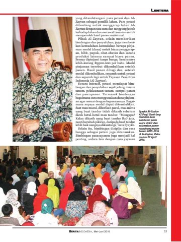 BERITAINDONESIA, Mei-Juni 2016 33LENTERAyang ditandatangani para petani dan AlZaytun sebagai pemilik lahan. Para petanidibimbing untuk menggarap lahan AlZaytun dengan tata cara dan tanggung jawabterhadap lahan dan merawat tanaman untukmemperoleh hasil panen maksimal.Pihak Al-Zaytun, selain memberikanbimbingan dan penyuluhan, juga memberikan kemudahan-kemudahan berupa pinjaman modal (dana) untuk biaya penggarapan, bibit, pupuk, obat-obatan dan saranaproduksi lainnya sampai biaya panen.Semua dipinjami tanpa bunga, besarannyalebih-kurang Rp500.000 per bahu. Modalpinjaman tersebut dikembalikan setelahpanen. Hasil panen dibagi dua, setelahmodal dikembalikan, separuh untuk petanidan separuh lagi untuk Yayasan PesantrenIndonesia (Al-Zaytun).Secara intensif, petani mendapat bimbingan dan penyuluhan sejak jelang musimtanam, pelaksanaan tanam, sampai panendan pascapanen. Termasuk bimbinganbagaimana cara menggunakan dana pinjaman agar sesuai dengan kegunaannya. Bagaimana supaya modal dapat dikembalikan.Saat mau macul, diberikan pacul, mau mintauang buat tandur tidak dikasih sebelumdicek betul-betul mau tandur. “Mengapa?Kalau dikasih uang buat tandur Rp7 juta,nanti berubah pikiran, daripada buat tandurlebih baik uangnya dikantongi,” kata Syaykh.Selain itu, bimbingan disiplin dan rasabangga sebagai petani juga ditanamkan.Bimbingan pasacapanen juga menjadi halpenting, antara lain dengan cara yayasanSyaykh Al-ZaytunAS Panji Gumi-langmemberi katasambutan padaacara dzikir danselamatan panenreundeung musimtanam 2015-2016di Al-Zaytun, Rabumalam 27 April2016.