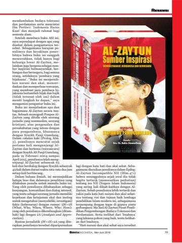 BERITAINDONESIA, Mei-Juni 2016 39LENTERAmendambakan budaya toleransidan perdamaian serta mencintaiIbu Pertiwi: ‘Indonesia HarusKuat’ dan menjadi rahmat bagisemesta alam.Setelah membaca buku ASI ini,saya sependapat dengan apa yangdisebut dalam pengantarnya tersebut. Sebagaimana harapan penulisnya dan keyakinan penerbitnya bahwa buku ini sungguhmencerahkan, tidak hanya bagikeluarga besar Al-Zaytun, melainkan juga berguna sebagai sumber inspirasi bermasyarakat, berbangsa dan bernegara, bagi semuaorang, setidaknya ’pembaca yangbijaksana’. “Buku ini menjernihkan nurani dan akal, mencerdaskan dan memperluas wawasan,yang membuat para pembaca bijaksana bertambah bijak dan bajik(tidak tersesat oleh isu) dalammeniti langkah ke depan,” sayamengamini pengantar buku ini.Buku ini menjelaskan apa danbagaimana Al-Zaytun secara tuntas. Sebuah monografi Ponpes AlZaytun yang ditulis oleh seorangjurnalis yang nonmuslim, seorangkristiani, atas pengenalan danpersahabatan yang intens denganpara pengasuhnya, khususnyadengan Syaykh Panji Gumilang.Dalam catatan kaki (Prolog, hlm.3), penulisnya mencatat sejakpertama kali mengunjungi AlZaytun dan bertemu (wawancara)dengan Syaykh AS Panji Gumilang,pada 19 Februari 2004 sampaiApril 2015, penulisnya telah mengunjungi Al-Zaytun sebanyak 63kali dan berdialog dengan Syaykh sebanyak49 kali dalam durasi waktu rata-rata dua jamsetiap kali berbincang.Dalam bahasa ilmiah, ini menunjukkanbetapa luas dan dalamnya penelitian yangdilakukan penulis untuk menulis buku ini.Yang oleh penulisnya dibahasakan sebagaikunjungan, komunikasi dan dialog intensif,yang tentu sebagai seorang jurnalis memilikikepekaan dan ketajaman akal dan instinguntuk mengetahui (menyelidiki, investigasi)fakta (kebenaran) dengan rumus: 5W+1H(What, Who, When, Where, Why; How);yang oleh penulisnya dikembangkan (ditambah) lagi dengan 2A (Analysis and Appreciation).Rumus jurnalistik 5W+1H+2A yang diterapkan penulisnya tersebut diparipurnakanlagi dengan kata hati dan akal sehat. Sebagaimana diuraikan penulisnya dalam Epilog:Al-Zaytun Incompatible NII (Hlm.471)bahwa sesungguhnya sejak awal dia tidakbegitu tertarik (memusatkan perhatian)tentang isu NII (Negara Islam Indonesia)yang sering kali dikait-kaitkan dengan AlZaytun. Sebab penulisnya lebih tertarik danyakin pada kata hati nurani dan akal sehatnya tentang visi dan tujuan baik lembagapendidikan Islam modern ini, sebagaimanaterpampang dengan tegas di gapura pintugerbangnya: Ma’had Al-Zaytun Pusat Pendidikan Pengembangan Budaya Toleransi danPerdamaian; Serta terlihat dari ‘buahnya’yang laksana pohon yang baik, tentu kelihatan dari buahnya.“Hati nurani dan akal sehat saya tersebutRESENSI