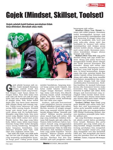 BERITAINDONESIA, Mei-Juni 2016 41Y BERITA OPINIFoto: reproGojek (Mindset, Skillset, Toolset)Gojek adalah bukti bahwa perubahan tidakbisa dihindari. Berubah atau mati.ojek adalah layanan ojek online. Gojek menjadi fenomenakarena jumlah Gojek danpengguna Gojek yang bertambah dengan cepat hanya dalam hitungan bulan. Saya dulu kalau maunaik ojek yah harus cari ojek di pengkalan ojek atau memberhentikan ojekdi pinggir jalan. Nah, kalau sudahdapat ojek, saya harus tawar menawardulu dengan abang ojek tentang ongkos. Tahap tawar menawar ini yangsering bikin pusing kepala. Standarharga ojek untuk jarak yang samaantar abang ojek itu berbeda-beda.Mungkin yang bikin beda, bisa jenismotor yang dipakai: kalau motornyaNinja maka lebih mahal dari motorHonda Astrea. Bisa juga yang bikinbeda, faktor cuaca: kalau cuaca hujanbiasanya harga lebih mahal daripadacuaca terang benderang. Seringkalikalau harganya kemahalan, sayaakhirnya memilih jalan kaki, naiktaksi atau angkutan umum lain.Tapi sejak ada Gojek, saya tidak perlulagi cari-cari ojek di pinggir jalan, danyang terpenting mendapatkan layanan harga pasti. Cukup pesan Gojekmelalui handphone, langsung muncul harga sesuai jarak tempuh, dankalau sudah ketemu driver-nya,tinggal tunggu dijemput. Asiknyalagi, kalau naik Gojek, kita dikasihpenutup kepala untuk melindungikepala kita dari helm yang bekaspakai dan masker untuk melindungikita dari debu atau angin.Awalnya, ojek-ojek konvensional(ojek pangkalan) merasa terancamdengan kehadiran Gojek (ojek online).Mereka menulis di pinggir-pinggirjalan yang menjadi wilayah operasimereka dengan tulisan \online\akses masuk bagi ojek online. Adajuga yang melakukan tindakan kekerasan fisik kepada ojek-ojek online itu.Namun fakta berbicara bahwa konsumen banyak yang menggunakanojek online dan mulai meninggalkanojek konvensional. Fakta itu tidak bisadihentikan oleh tindakan-tindakanlama yang sudah bagaikan \ompong\mengaum, tidak akan berdampakapa-apa. Hasilnya kini kita bisamelihat ojek-ojek pangkalan sudahberseragam ojek online.Mindset (How You Think) layanan ojek sudah bergeser. Konsumensudah meninggalkan layanan ojekyang konvensional (mendapatkan ojekdari menyetop di pinggir jalan ataupergi ke pangkalan ojek, tarif ojekyang suka-suka abang ojek) danberpindah ke layanan ojek online(mendapatkan ojek dengan pesanmelalui mobile phone, dengan tarifpasti sesuai jarak). Konsumen merasakan kemudahan dengan adanyalayanan ojek online.Skillset (How You Act) yang perludimiliki abang ojek juga sudah berubah. Abang ojek online harus bisamenggunakan mobile phone sebagaialat untuk mencari konsumen dantransaksi. Abang ojek online jugaharus memiliki kemampuan berkomunikasi yang baik kepada konsumen. Ia harus menawarkan, dengansopan dan jelas, penutup kepala danmasker kepada setiap konsumennya.Abang ojek online juga harus memilikikemampuan mengendarai dan merawat motor dengan baik dan tidakmembahayakan konsumennya. Keahlian-keahlian itu menjadi keharusankarena jika konsumen kecewa makakonsumen bisa langsung menuliskomentar di aplikasi ojek online. Bedadengan ojek konvensional yang seringkali tidak standar dalam memberi layanan dan merasa aman-amansaja karena tidak perlu kuatir dengankomentar dari konsumennya.Toolset (What You Use) yangperlu dimiliki ojek online tentu berbeda dari ojek konvensional. Ojekonline perlu memiliki mobile phone.Juga perlu tahu cara mengoperasikanGPS (Global Positioning System), dancara membaca penunjuk jalan melalui aplikasi peta.Apa yang diceritakan mengenai Gojek adalah contoh bahwa perubahanterus terjadi. Makanya kita perlumenyadari apa yang sudah atau sedang berubah. Dengan memiliki faktatentang perubahan bisa mengubahcara kita berpikir (mind set), yangakan mengubah cara kita bertindak(skill set), dan mengubah alat bantuyang kita gunakan (tool set). DOANADIKARA, trainer, Corporate HR KompasGramediaGMeme gojek yang beredar di internet