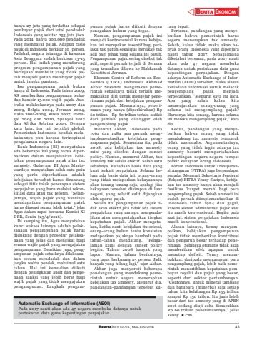 BERITAINDONESIA, Mei-Juni 2016 43YBERITA EKONOMIhanya 27 juta yang terdaftar sebagaipembayar pajak dari total pendudukIndonesia yang sekitar 255 juta jiwa.Pada 2014, hanya 900.000 pendudukyang membayar pajak. Adapun rasiopajak di Indonesia berkisar 10 persen.Padahal, negara tetangga di kawasanAsia Tenggara sudah berkisar 13-15persen. Hal inilah yang mendorongprogram pengampunan pajak yangbertujuan membuat yang tidak patuh menjadi patuh membayar pajakuntuk jangka panjang.Isu pengampunan pajak bukanhanya di Indonesia. Pada tahun 2009,AS memberikan pengampunan terhadap hampir 15.000 wajib pajak. Australia melakukannya pada 2007 dan2009, Belgia 2004, Jerman 2004,Italia 2001-2003, Rusia 2007, Portugal 2005 dan 2010, Spanyol 2012dan Afrika Selatan 2003. Dengankata lain, isu ini bersifat global.Pemerintah Indonesia hendak melakukannya pun karena terinspirasipengalaman negara lain.Bank Indonesia (BI) menyatakanada beberapa hal yang harus diperhatikan dalam menjalankan kebijakan pengampunan pajak alias taxamnesty. Gubernur BI Agus Martowardojo menyatakan salah satu poinyang perlu diperhatikan adalahkebijakan tersebut harus dirancangsebagai titik tolak penerapan sistemperpajakan yang baru melalui rekonsiliasi data atau tax reform. \jutnya, wajib pajak yang nantinyamendapatkan pengampunan pajakharus diawasi secara lebih ketat,\Agus dalam rapat bersama Komisi XIDPR, Senin (25/4/2016).Di samping itu, Agus menyatakankunci sukses lainnya adalah pelaksanaan pengampunan pajak harusdidukung dengan prosedur pelaksanaan yang jelas dan mengikat bagisemua wajib pajak yang mengajukanpengampunan. Demikian juga, pengampunan pajak sebaiknya dilaksanakan secara mendadak dan dalamjangka waktu pendek, maksimal satutahun. Hal ini kemudian diikutidengan peningkatan audit dan pengenaan sanksi yang lebih berat bagiwajib pajak yang tidak mengajukanpengampunan. Langkah pengampunan pajak harus diikuti denganpenegakan hukum yang tegas.Namun, pengampunan pajak inimenjadi kontroversial karena kebijakan ini merupakan insentif bagi perilaku tak patuh sekaligus bersikap takadil bagi pihak yang selama ini patuh.Pengampunan pajak sering disebut takadil, seperti pernah terjadi di Jermanyang kemudian dibawa ke MahkamahKonstitusi Jerman.Ekonom Center of Reform on Economics (CORE) Indonesia AkhmadAkbar Susamto mengatakan pemerintah sebaiknya tidak terlalu memaksakan diri untuk mengejar penerimaan pajak dari kebijakan pengampunan pajak. Menurutnya, penerimaan yang hanya (diperkirakan) Rp60 triliun - Rp 80 triliun terlalu sedikitdari jumlah yang dilanggar olehpengemplang pajak.Menurut Akbar, Indonesia pada1964 dan 1984 pun pernah mengimplementasikan kebijakan pengampunan pajak. Sementara itu, pada2008, ada kebijakan tax amnestymini yang disebut dengan sunsetpolicy. Namun, menurut Akbar, taxamnesty tak selalu efektif. Salah satusebabnya, ketiadaan basis data yangkuat terkait perpajakan. Selama belum ada basis data ini, orang-orangyang tidak melaporkan kekayaannyaakan tenang-tenang saja, apalagi jikakekayaan tersebut disimpan di luarnegeri, yang relatif sulit dijangkauoleh aparat pajak.Selain itu, pengampunan pajak tidak akan efektif jika tidak ada sistemperpajakan yang mampu mengendalikan atau mempertahankan tingkatkepatuhan pajak. Akbar mengatakan, ketika nanti kebijakan itu selesai,orang-orang belum tentu konsistenmelaporkan pajaknya kembali padatahun-tahun mendatang. \laman kami dengan sunset policybegitu. Tahun 2008 banyak yanglapor. Namun, tahun berikutnya,yang lapor berkurang 45 persen. Jadi,banyak yang hilang lagi,\Akbar juga menyoroti beberapapandangan yang mendukung pemerintah untuk segera menerapkankebijakan tax amnesty. Menurut dia,pandangan-pandangan tersebut kurang tepat.Pertama, pandangan yang menyebutkan bahwa pemerintah harussegera menerapkan tax amnesty.Sebab, kalau tidak, maka akan banyak orang Indonesia yang dipenjarananti tahun 2017. Sebagaimanadiketahui bersama, pada 2017 nantiakan ada 47 negara membukadatanya untuk pertukaran data gunakepentingan perpajakan. Denganadanya Automatic Exchange of Information (AEOI) tersebut, maka alasanketiadaan informasi untuk melacakpengemplang pajak menjaditerpecahkan. \Apa yang salah kalau kitamemenjarakan orang-orang yangselama ini mengemplang pajak?Harusnya kita senang, karena selamaini mereka mengemplang pajak,\dia.Kedua, pandangan yang menyebutkan bahwa orang yang tidakmendukung tax amnesty termasuktidak nasionalis. Argumentasinya,orang yang tidak ingin adanya taxamnesty berarti mempertahankankepentingan negara-negara tempatparkir kekayaan orang Indonesia.Forum Indonesia untuk Transparansi Anggaran (FITRA) juga berpendapatsenada. Menurut Sekretaris Jenderal(Sekjen) FITRA Yenny Sucipto, kebijakan tax amnesty hanya akan menjadifasilitas 'karpet merah' bagi parapengemplang pajak. Sebab amnesti inisudah pernah diimplementasikan diIndonesia tahun 1984 dan gagal,karena sistem administrasi pajak saatitu masih konvensional. Begitu pulasaat ini, sistem perpajakan Indonesiamasih konvensional.Alasan lainnya, Yenny menyampaikan, kebijakan pengampunanpajak tidak memberikan kontribusidan pengaruh besar terhadap penerimaan. Sehingga otomatis tidak akanmemberikan efek apapun untukmenutup defisit. Yenny menambahkan, daripada mengampuni parapengemplang pajak, lebih baik pemerintah menertibkan kepatuhan pembayar royalti dan pajak yang besar,seperti dari sektor pertambangan.\, untuk mineral tambangdan batubara (minerba) saja setiaptahun kita kehilangan Rp 135 triliunsampai Rp 150 trilun. Itu jauh lebihbesar dari tax amnesty yang di APBN2016 sedang diuji-coba dimasukkanRp 60 triliun penerimaannya,\Yenny. CIDAutomatic Exchange of Information (AEOI)Pada 2017 nanti akan ada 47 negara membuka datanya untukpertukaran data guna kepentingan perpajakan.