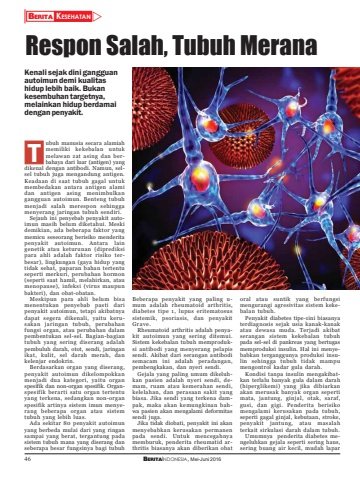 46 BERITAINDONESIA, Mei-Juni 2016BERITA KESEHATANZRespon Salah, Tubuh Meranaubuh manusia secara alamiahmemiliki kekebalan untukmelawan zat asing dan berbahaya dari luar (antigen) yangdikenal dengan antibodi. Namun, selsel tubuh juga mengandung antigen.Keadaan di saat tubuh gagal untukmembedakan antara antigen alamidan antigen asing menimbulkangangguan autoimun. Benteng tubuhmenjadi salah merespon sehinggamenyerang jaringan tubuh sendiri.Sejauh ini penyebab penyakit autoimun masih belum diketahui. Meskidemikian, ada beberapa faktor yangmemicu seseorang berisiko menderitapenyakit autoimun. Antara laingenetik atau keturunan (diprediksipara ahli adalah faktor risiko terbesar), lingkungan (gaya hidup yangtidak sehat, paparan bahan tertentuseperti merkuri, perubahan hormon(seperti saat hamil, melahirkan, ataumenopause), infeksi (virus maupunbakteri), dan obat-obatan.Meskipun para ahli belum bisamenentukan penyebab pasti daripenyakit autoimun, tetapi akibatnyadapat segera dikenali, yaitu kerusakan jaringan tubuh, perubahanfungsi organ, atau perubahan dalampembentukan sel-sel. Bagian-bagiantubuh yang sering diserang adalahpembuluh darah, otot, sendi, jaringanikat, kulit, sel darah merah, dankelenjar endokrin.Berdasarkan organ yang diserang,penyakit autoimun dikelompokkanmenjadi dua kategori, yaitu organspesifik dan non-organ spesifik. Organspesifik berarti satu organ tertentuyang terkena, sedangkan non-organspesifik artinya sistem imun menyerang beberapa organ atau sistemtubuh yang lebih luas.Ada sekitar 80 penyakit autoimunyang berbeda mulai dari yang ringansampai yang berat, tergantung padasistem tubuh mana yang diserang danseberapa besar fungsinya bagi tubuhBeberapa penyakit yang paling umum adalah rheumatoid arthritis,diabetes tipe 1, lupus eritematosussistemik, psoriasis, dan penyakitGrave.Rheumatoid arthritis adalah penyakit autoimun yang sering ditemui.Sistem kekebalan tubuh memproduksi antibodi yang menyerang pelapissendi. Akibat dari serangan antibodisemacam ini adalah peradangan,pembengkakan, dan nyeri sendi.Gejala yang paling umum dikeluhkan pasien adalah nyeri sendi, demam, ruam atau kemerahan sendi,kelelahan, dan perasaan sakit yangbiasa. Jika sendi yang terkena dampak, maka akan kemungkinan bahwa pasien akan mengalami deformitassendi juga.Jika tidak diobati, penyakit ini akanmenyebabkan kerusakan permanenpada sendi. Untuk mencegahnyamemburuk, penderita rheumatid arthritis biasanya akan diberikan obatoral atau suntik yang berfungsimengurangi agresivitas sistem kekebalan tubuh.Penyakit diabetes tipe-1ini biasanyaterdiagnosis sejak usia kanak-kanakatau dewasa muda. Terjadi akibatserangan sistem kekebalan tubuhpada sel-sel di pankreas yang bertugasmemproduksi insulin. Hal ini menyebabkan terganggunya produksi insulin sehingga tubuh tidak mampumengontrol kadar gula darah.Kondisi tanpa insulin mengakibatkan terlalu banyak gula dalam darah(hiperglikemi) yang jika dibiarkanakan merusak banyak organ sepertimata, jantung, ginjal, otak, saraf,gusi, dan gigi. Penderita berisikomengalami kerusakan pada tubuh,seperti gagal ginjal, kebutaan, stroke,penyakit jantung, atau masalahterkait sirkulasi darah dalam tubuh.Umumnya penderita diabetes mengeluhkan gejala seperti sering haus,sering buang air kecil, mudah laparKenali sejak dini gangguanautoimun demi kualitashidup lebih baik. Bukankesembuhan targetnya,melainkan hidup berdamaidengan penyakit.T