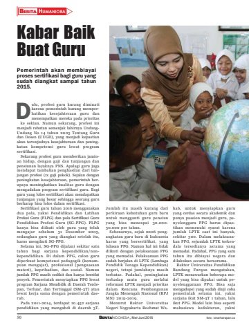 50 BERITAINDONESIA, Mei-Juni 2016BERITA HUMANIORAZulu, profesi guru kurang diminatikarena pemerintah kurang memperhatikan kesejahteraan guru danmenempatkan mereka pada prioritaske sekian. Namun sekarang, profesi inimenjadi rebutan semenjak lahirnya UndangUndang No 14 tahun 2005 Tentang Gurudan Dosen (UUGD), yang menjadi kepastianakan terwujudnya kesejahteraan dan peningkatan kompetensi guru lewat programsertifikasi.Sekarang profesi guru memberikan jaminan hidup, dengan gaji dan tunjangan danpensiunan layaknya PNS. Apalagi guru jugamendapat tambahan penghasilan dari tunjangan profesi (1x gaji pokok). Sejalan denganpeningkatan kesejahteraan, pemerintah berupaya meningkatkan kualitas guru denganmengadakan program sertifikasi guru. Bagiguru yang lolos sertifikasi akan mendapatkantunjangan yang besar sehingga seorang guruberharap bisa lolos dalam sertifikasi.Sertifikasi guru tahun 2016 menggunakandua pola, yakni Pendidikan dan LatihanProfesi Guru (PLPG) dan pola Sertifikasi GuruPendidikan Profesi Guru (SG-PPG). PLPGhanya bisa diikuti oleh guru yang telahmengajar sebelum 31 Desember 2005,sedangkan guru yang diangkat setelah itu,harus mengikuti SG-PPG.Selama ini, SG-PPG dijalani sekitar satutahun bagi sarjana kependidikan/nonkependidikan. Di dalam PPG, calon gurudiperkuat kompetensi pedagogik (kemampuan mengajar), profesional (penguasaanmateri), kepribadian, dan sosial. Namunjumlah PPG masih sedikit dan hanya bersifatproyek. Pemerintah menyiapkan PPG lewatprogram Sarjana Mendidik di Daerah Terdepan, Terluar, dan Tertinggal (SM-3T) ataulewat kerja sama dengan pemerintah daerah.Pada 2011-2014, terdapat 10.452 sarjanapendidikan yang mengabdi di daerah 3T.foto: sinarharapan.coKabar BaikBuat GuruPemerintah akan membiayaiproses sertifikasi bagi guru yangsudah diangkat sampai tahun2015.DJumlah itu masih kurang dariperkiraan kebutuhan guru baruuntuk mengganti guru pensiunyang bisa mencapai 30.000-50.000 per tahun.Sebenarnya, sejak 2006 pengangkatan guru baru di Indonesiaharus yang bersertifikat, yanglulusan PPG. Namun hal ini tidakdiikuti dengan pelaksanaan PPGyang memadai. Pelaksanaan PPGsudah berjalan di LPTK (LembagaPendidik Tenaga Kependidikan)negeri, tetapi jumlahnya masihterbatas. Padahal, peningkatanterhadap mutu guru melaluireformasi LPTK menjadi prioritasdalam Rencana PembangunanJangka Menengah Nasional (RPJMN) 2015-2019.Menurut Rektor UniversitasNegeri Yogyakarta Rochmat Wahab, untuk menyiapkan guruyang cerdas secara akademik danpunya passion menjadi guru, penyelenggara PPG harus dipastikan memenuhi syarat karenajumlah LPTK saat ini banyak,sekitar 300. Dalam melaksanakan PPG, sejumlah LPTK terkendala tersedianya asrama yangmemadai. Padahal, PPG yang satutahun itu dibiayai negara dandilakukan secara berasrama.Rektor Universitas PendidikanBandung Furqon mengatakan,LPTK menawarkan beberapa model yang bisa dipakai untuk penyelenggaraan PPG. Bisa sajamengadopsi yang sudah diuji cobapemerintah selama ini, yaknisarjana ikut SM-3T 1 tahun, laluikut PPG. Model lain bisa sepertimahasiswa kedokteran, yakni