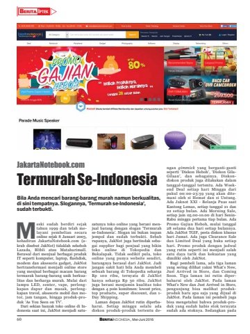 60 BERITAINDONESIA, Mei-Juni 2016BERITA IPTEK ZJakartaNotebook.comTermurah Se-IndonesiaBila Anda mencari barang-barang murah namun berkualitas,di sini tempatnya. Slogannya, 'Termurah se-Indonesia',sudah terbukti.satunya toko online yang berani menjual barang dengan slogan 'Termurahse-Indonesia'. Slogan ini bukan isapanjempol dan sudah terbukti. Sebabrupanya, JakNot juga bertindak sebagai supplier bagi penjual yang bikintoko online di Tokopedia danBukalapak. Tidak sedikit pula, tokoonline yang punya website sendiri,barangnya berasal dari JakNot. Jadijangan sakit hati bila Anda membelisebuah barang di Tokopedia sehargaRp 100 ribu, ternyata di JakNothanya seharga Rp 30 ribu. JakNotjuga berani menjamin kualitas tokodengan 4 poin komitmen: lowest price,top products, super discount, dan 1-Day Shipping.Laman depan JakNot rutin diperbaharui. Setiap minggu selalu adadiskon produk-produk tertentu dengan gimmick yang berganti-gantiseperti 'Diskon Heboh', 'Diskon GilaGilaan', dan sebagainya. Diskondiskon produk juga dilakukan dalamtanggal-tanggal tertentu. Ada Weekend Deal setiap hari Minggu daripukul 00:00-23:59 yang akan ditemani oleh si Hemat dan si Untung.Ada Jaknot XXI - Belanja Puas saatKantong Lemas, setiap tanggal 21 dan22 setiap bulan. Ada Morning Sale,setiap jam 05.00-10.00 di hari SeninRabu minggu pertama tiap bulan. AdaPromo Gajian Heboh, mulai tanggal28 selama dua hari setiap bulannya.Ada JakNot TGIF, pesta diskon khusushari Jumat. Ada juga Clearance Saledan Limited Deal yang buka setiaphari. Promo produk dengan jadwalyang rutin seperti ini menjadi salahsatu daya tarik dan kekuatan yangdimiliki oleh JakNot.Bagi pembeli lama, ada tiga lamanyang sering dilihat yakni What’s New,Just Arrived in Store, dan ComingSoon. Tiga laman ini rutin diperbaharui oleh JakNot. Pada lamanWhat’s New dan Just Arrived in Store,pengunjung bisa melihat produkproduk baru apa saja yang dijual diJakNot. Pada laman ini pembeli jugabisa mengetahui bahwa produk-produk yang sudah habis stok ternyatasudah ada stoknya. Sedangkan padaeski sudah berdiri sejaktahun 1999 dan telah melayani pembelian secaraonline sejak 8 Januari 2003,kehadiran JakartaNotebook.com (akrab disebut JakNot) tidaklah sehebohLazada, Blibli atau Mataharimall.Berawal dari menjual berbagai produkIT seperti komputer, laptop, flashdisk,modem dan aksesoris gadget, JakNotbertransformasi menjadi online storeyang menjual berbagai macam barangtermasuk barang-barang unik berkualitas dan berharga murah. Mulai darilampu LED, senter, vape, perlengkapan dapur dan masak, perlengkapan travel, aksesoris mobil dan motor, jam tangan, hingga produk-produk ‘As You Seen on TV’.Dari sekian banyak toko online di Indonesia saat ini, JakNot menjadi satuM