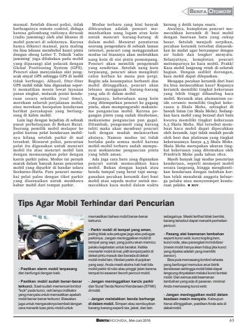 BERITAINDONESIA, Mei-Juni 2016 63Y BERITA OTOMOTIFmanual. Setelah diusut polisi, tidakberfungsinya remote control, didugakarena gelombang radionya dirusak(radio jamming) oleh alat khusus dimobil pencuri di sekitarnya. Karenahanya dikunci manual, para malingitu bisa leluasa membobol kunci pintudengan obeng Letter T. Teknik 'radiojamming' juga dilakukan pada mobilyang dipasangi alat pelacak denganGlobal Positioning System (GPS).Pencuri akan menyalakan alat pengacak sinyal GPS sehingga GPS di mobiltidak berfungsi. Alhasil, fitur-fiturGPS mobil tidak bisa digunakan seperti mematikan mesin lewat layananpesan singkat, melacak posisi kendaraan secara seketika (real time),merekam seluruh perjalanan mobil,atau merekam kecepatan kendaraanberikut percakapan yang berlangsung di kabin mobil.Lain lagi dengan kejadian di sebuahpusat perbelanjaan di Bekasi Barat.Seorang pemilik mobil melapor kepolisi karena pelat kendaraan mobilnya hilang setelah parkir di maltersebut. Menurut polisi, pencurianpelat itu digunakan untuk mencurimobil itu atau mencuri mobil laindengan memasangkan pelat dengankarcis parkir palsu. Modus ini pernahmarak dalam banyak kasus pencurianmobil yang diparkir di bandar udaraSoekarno-Hatta. Para pencuri memakai pelat palsu dengan tiket parkiryang disesuaikan untuk membawakabur mobil dari tempat parkir.Modus terbaru yang kini banyakdibicarakan adalah pencuri memanfaatkan uang logam atau koinuntuk mencuri barang-barang didalam mobil. Menurut penuturanseorang pengendara di sebuah lamaninternet, pencuri yang menggunakanmodus ini biasanya akan meletakkanuang koin di sisi pintu penumpang.Pencuri akan memilih pengemudiyang sendirian. Setelah uang kointerpasang, pencuri akan mengikuticalon korban ke mana pun pergi.Begitu ada kesempatan berhenti danmobil ditinggalkan, pencuri akanleluasa menggasak barang-barangyang ada di dalam mobil.Rupanya, keberadaan uang koinyang ditempatkan pencuri ke gagangpintu, akan mempengaruhi mekanisme penguncian mobil. Karena pegangan pintu yang sudah disabotase,mekanisme penguncian pun gagal.Ditambah, pengemudi yang kurangteliti maka akan membuat pencuritadi dengan mudah melancarkanaksinya. Namun modus ini tidakberlaku pada semua mobil karenamobil-mobil terbaru sudah mempunyai mekanisme penguncian pintuyang lebih aman.Ada juga cara baru yang digunakanpencuri untuk memecahkan kacamobil. Bukan dengan kapak ataubenda tumpul yang berat tapi menggunakan pecahan keramik dari busimobil atau sepeda motor untuk memecahkan kaca mobil dalam waktukurang 5 detik tanpa suara.Awalnya, komplotan pencuri memecahkan keramik di busi mobildengan bantuan batu yang cukupbesar. Setelah menjadi serpihan,pecahan keramik tersebut dimasukkan ke mulut agar bercampur denganair ludah dan lengket menyatu.Selanjutnya, komplotan pencurimelemparnya ke kaca mobil. Prakk!Kaca mobil langsung retak di seluruhbagian. Dengan sedikit dorongan,kaca mobil dapat dilepaskan.Mengapa pecahan keramik dari busiitu bisa memecahkan kaca? Rupanyakeramik memiliki tingkat kekerasanyang lebih tinggi dibanding kacamobil. Keramik atau alumunium oxide ceramic memiliki tingkat kekerasan 9 Skala Mohs, setingkat dibawah Intan (10 Skala Mohs). Sedangkan kaca mobil yang berasal dari batukwarsa memiliki tingkat kekerasan6,5 Skala Mohs. Hal tersebut membuat kaca mobil dapat dipecahkanoleh keramik, tapi tidak mudah pecaholeh besi dan platinum yang tingkatkekerasannya hanya 4,5 Skala Mohs.Skala Mohs merupakan ukuran tingkat kekerasan yang ditemukan olehFriedrich Mohs pada tahun 1812.Masih banyak lagi modus pencuriankendaraan, seperti memepet mobilsecara langsung, hingga menghentikan kendaraan dengan tuduhan korban telah menabrak anggota keluarga pelaku atau menyerempet kendaraan pelaku. ROYTips Agar Mobil Terhindar dari Pencurian- Pastikan alarm mobil terpasangdan berfungsi dengan baik.- Pastikan mobil sudah benar-benarterkunci. Saat sudah memencet tombol\ pada kunci, cek lampu indikatoryang menyala untuk memastikan apakahmobil benar-benar terkunci. Biasakanjuga untuk mengeceknya kembali dengancara menarik tuas pintu mobil untukmemastikan bahwa mobil benar-benarterkunci.- Parkir mobil di tempat yang aman,paling tidak ada petugas jaga atau petugasparkirnya. Jangan meninggalkan mobil ditempat yang sepi, yang justru akan memicupelaku kejahatan untuk beraksi. Ketikamemarkir mobil di mal, pilih tempat parkir didekat pintu masuk dan berada di dekatmobil-mobil lain. Hindari parkir di pojokanyang sepi. Anda mesti ekstra hati-hati bilamobil parkir di ruko atau pinggir jalan karenatempat ini sasaran favorit pencuri mobil.- Jangan meninggalkan karcis parkirdan Surat Tanda Nomor Kendaraan (STNK)di mobil.- Jangan meletakkan benda berhargadi dalam mobil. Simpan atau sembuyikanbarang-barang seperti tas, jaket, dan lainsebagainya. Meski terlihat tidak bernilai,barang tersebut dapat menarik perhatianpencuri.- Pasang alat keamanan tambahanseperti kunci setir, kunci kopling/rem,kunci roda, atau perangkat immobilizer(mesin mobil hanya akan hidup jika kunciyang dipakai adalah yang memilikisensor).Bisa pula memasang tombol rahasiayang berfungsi memutus arus listrikkendaraan sehingga mobil tidak dapatlangsung dinyalakan melalui kunci kontakmobil. Dari semua alat keamanantambahan yang ada di pasaran, minimalAnda memasang kunci setir.- Jangan meninggalkan mobil dalamkeadaan mesin menyala. Kalaupunharus ditinggalkan, pastikan Anda ada didekat mobil.