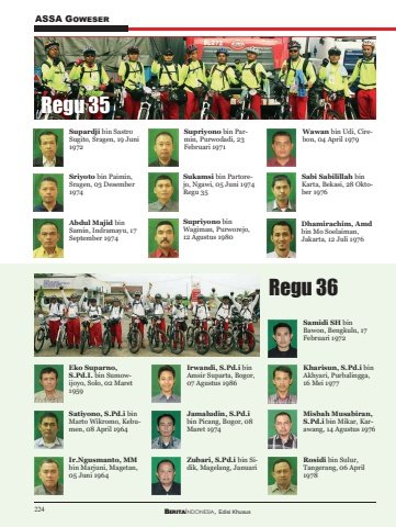 224 BERITAINDONESIA, Edisi KhususASSA G˘ˠˎ˜ˎ˛224Regu 36Satiyono, S.Pd.i bin Marto Wikromo, Kebumen, 08 April 1964Jamaludin, S.Pd.i bin Picang, Bogor, 08 Maret 1974Ir.Ngusmanto, MM bin Marjuni, Magetan, 05 Juni 1964Zubari, S.Pd.i bin Sidik, Magelang, JanuariEko Suparno, S.Pd.I. bin Sumowijoyo, Solo, 02 Maret 1959Irwandi, S.Pd.i bin Amsir Suparta, Bogor, 07 Agustus 1986Samidi SH bin Bawon, Bengkulu, 17 Februari 1972Kharisun, S.Pd.i bin Akhyari, Purbalingga, 16 Mei 1977Misbah Musabiran, S.Pd.i bin Mikar, Karawang, 14 Agustus 1976Rosidi bin Sulur, Tangerang, 06 April 1978Supardji bin Sastro Sugito, Sragen, 19 Juni 1972Sriyoto bin Paimin, Sragen, 03 Desember 1974Abdul Majid bin Samin, Indramayu, 17 September 1974Supriyono bin Parmin, Purwodadi, 23 Februari 1971Sabi Sabilillah bin Karta, Bekasi, 28 Oktober 1976Wawan bin Udi, Cirebon, 04 April 1979Dhamirachim, Amd bin Mo Soelaiman, Jakarta, 12 Juli 1976Supriyono bin Wagiman, Purworejo, 12 Agustus 1980Sukamsi bin Partorejo, Ngawi, 05 Juni 1974Regu 35Regu 35BERITAINDONESIA, Edisi Khusus 224